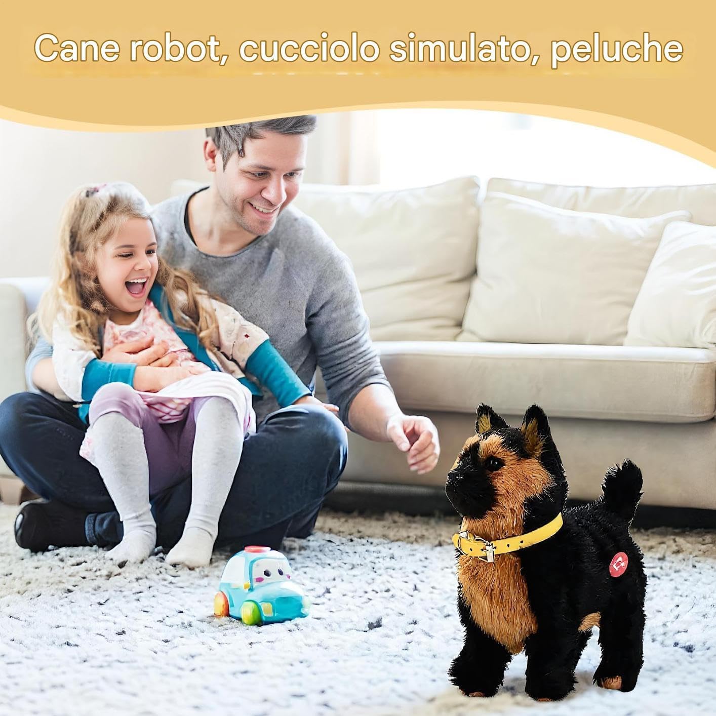 Movimento Autonomo Realistico: Tecnologia avanzata crea la presenza naturale di un cucciolo, con azioni coordinate di scodinzolio e spostamento. La modalità automatica arricchisce l'esperienza ludica senza bisogno di configurazioni complesse Interazione multidimensionale: Progettato per rispondere agli stimoli con movimenti affettuosi e suoni realistici, offre 5 modalità di gioco diverse che migliorano l'esperienza emotiva e l'intrattenimento educativo per tutta la famiglia Dettali realistici: Fisionomia espressiva con occhi luminosi e dinamiche ricrea l'energia di un vero cucciolo, trasformandosi in elemento di arredo emotivo che infonde vitalità agli ambienti mantenendo dimensioni compatte (altezza 28 cm) per integrazione ottimale in spazi ridotti. Strumento Interattivo Dinamico: Offre sessioni di gioco energetico e esercizi di coordinazione reattiva per migliorare le interazioni pet, funzionando come strumento educativo affidabile che sostiene sviluppo comportamentale positivo tramite engagement ludico costante Morbidezza Ipoallergenica: Cucciolo Robot presenta elettronica interna robusta, superfici in pelouche soffice e materiali gentili sulla pelle, ideale per uso interhealthy sicuro e prolungato con compagnia delicata simile a un animale domestico