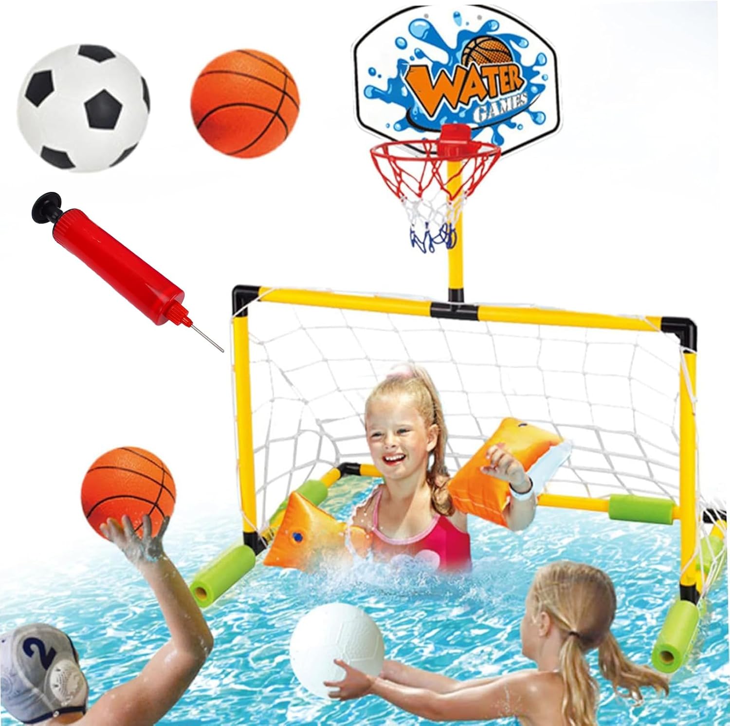 2 in 1 Pool & Door Frame Basketball Fun: usalo come un cerchio galleggiante in piscina o attaccalo a un telaio della porta per giocare in interni ed esterni. Versatile e portatile, questo set si adatta a ogni ambiente, dal relax in riva al lago al divertimento di compleanno in giardino. Impermeabile e costruito per uso esterno: realizzato con materiali impermeabili di alta qualità, questo cerchio e palla resistono ai raggi UV, al cloro e all'acqua salata. È perfetto per l'uso quotidiano in piscina, gite in spiaggia o gite al lago, costruito per gestire l'estate dopo l'estate. Include pompa e calcio impermeabile per giocare istantaneamente: viene fornito con tutto il necessario: canestro da basket, calcio impermeabile e pompa manuale, in modo da poter aprire la scatola e iniziare a giocare subito. Nessuna attesa, nessun problema, solo puro divertimento. Divertimento per tutte le età e livelli di abilità: ideale per i bambini che imparano la coordinazione e gli adulti che vogliono divertimento casual. Usalo per competizioni familiari, attività scolastiche in palestra o come strumento di educazione fisica per incoraggiare il gioco attivo e il lavoro di squadra. Design galleggiante leggero ma stabile: la base galleggiante è leggera per la portabilità e abbastanza stabile da rimanere in posizione verticale durante il gioco attivo. Non si piega facilmente e aggiunge uno strato di divertimento alle routine in piscina o alle vacanze in spiaggia.