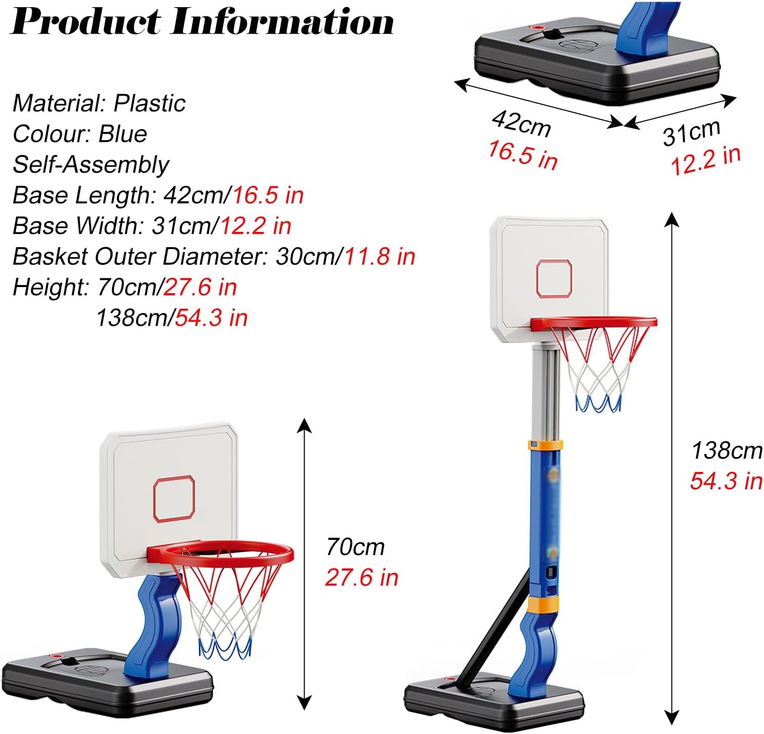 【Robusto e durevole】 Il nostro canestro da basket per piscina è realizzato in materiale di alta qualità, con struttura robusta e durevole, non facile da ribaltare, maggiore stabilità, garantisce sicurezza e affidabilità e non si sfalda facilmente. 【Altezza regolabile】 L'altezza del canestro da basket della piscina è regolabile, sia alta che bassa. Puoi mettere il canestro da basket basso a bordo piscina, come un gioco da piscina, adatto anche ai bambini piccoli per imparare a giocare a basket. 【2 modi di giocare】 Puoi usarlo come canestro da basket in piscina, portare l'emozione del basket dal campo alla piscina, goderti il ​​brivido di schiacciare in piscina, oppure puoi esercitarti nelle abilità di tiro al chiuso e migliorare l'interesse dei bambini nello sport. Canestro da basket perfetto per bambini dai 3-6 4-8 6-8 anni. 【Un'idea regalo fantastica】 Questo è il regalo perfetto per bambini o adulti, che siano bambini, adolescenti o adulti, possono godersi ore di divertimento con questo gioco d'acqua. Svilupperà il loro interesse per il basket, ispirerà il potenziale atletico dei giovani e incoraggerà uno stile di vita sano. 【Facilità di montaggio】 Il supporto da basket può essere assemblato in pochi secondi, la base può essere riempita con acqua e sabbia per garantire sicurezza e stabilità, non è facile ribaltarsi.