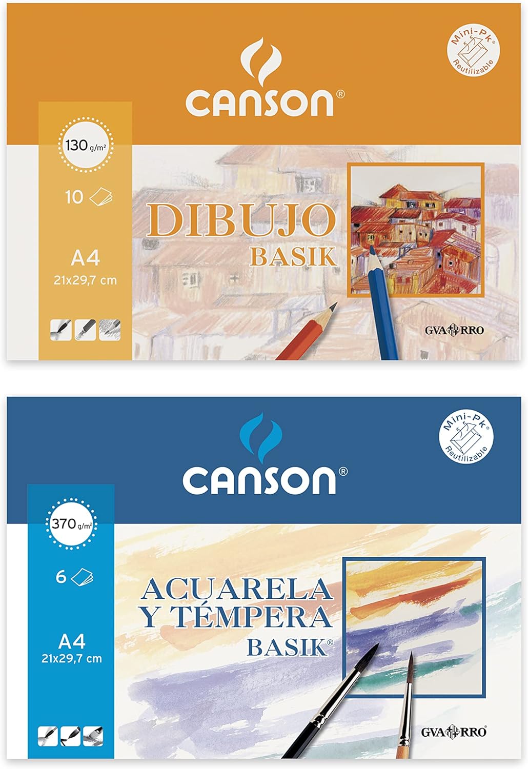 Set composto da un mini pack ideale per disegnare, e da un mini pack specifico per acquerello e tempera Scopri le carte da disegno e pittura autentiche Minipack disegno Basik 130 g: offre durezza e regolarità sulla sua superficie, leggermente satinato; è adatto per disegnare a matite e pastelli e anche per carboncini, sanguine, pastello, inchiostro, pennarello, guazzo e tempera Minipack acquerello Basik 370 g: la sua elevata grammatura lo rende un ruolo di resistenza a qualsiasi tecnica umida; adatto per acquerello scolastico, tempera, acrilico, olio e guazzo e adatto anche per matite, carboncini, pastelli, pennarelli, acqua