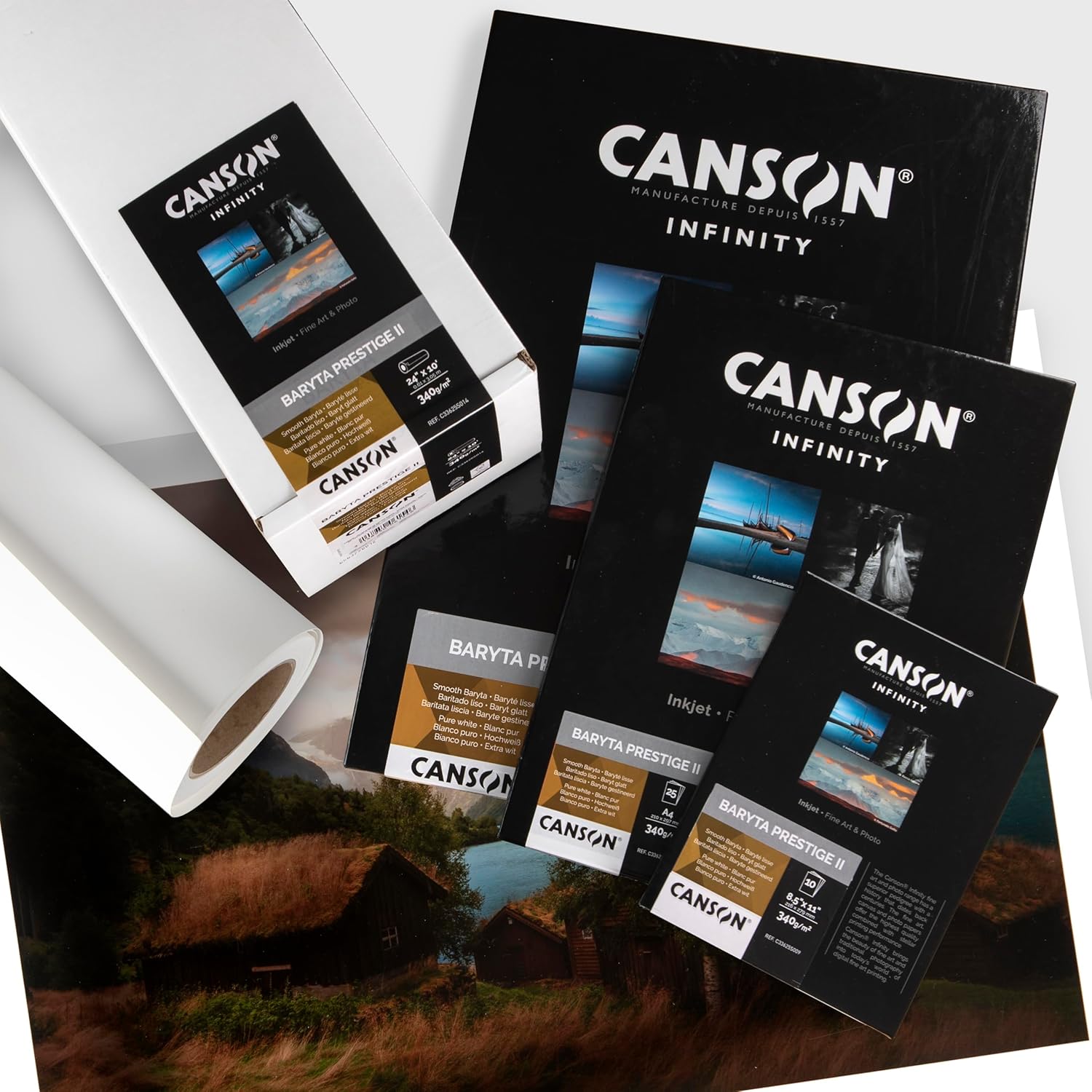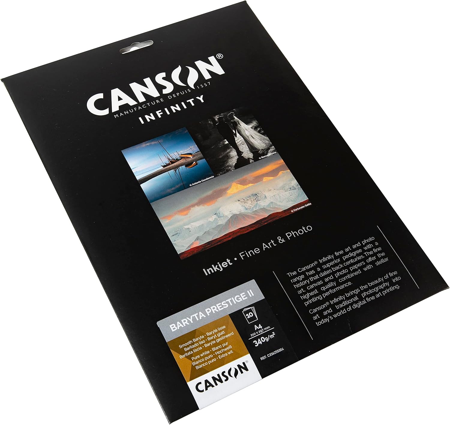 Baryta Prestige II 340gr possiede l'estetica di una carta tradizionale per camera oscura Rivestimento di solfato di bario prima dello strato per la ricezione dell'inchiostro E' composta da una base di colore bianco naturale senza l'utilizzo di azzurranti ottici (OBA) Finitura lucida che esalta i neri profondi e i bianchi puri, oltre alla vivace gamma di colori La carta offre un'eccezionale qualità dell'immagine, dettagli e una gamma tonale per riproduzioni superbe a bianco e nero e a colori