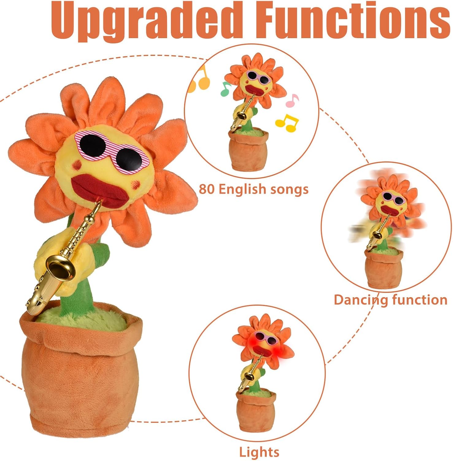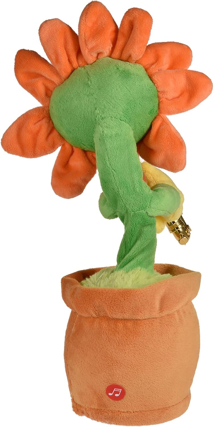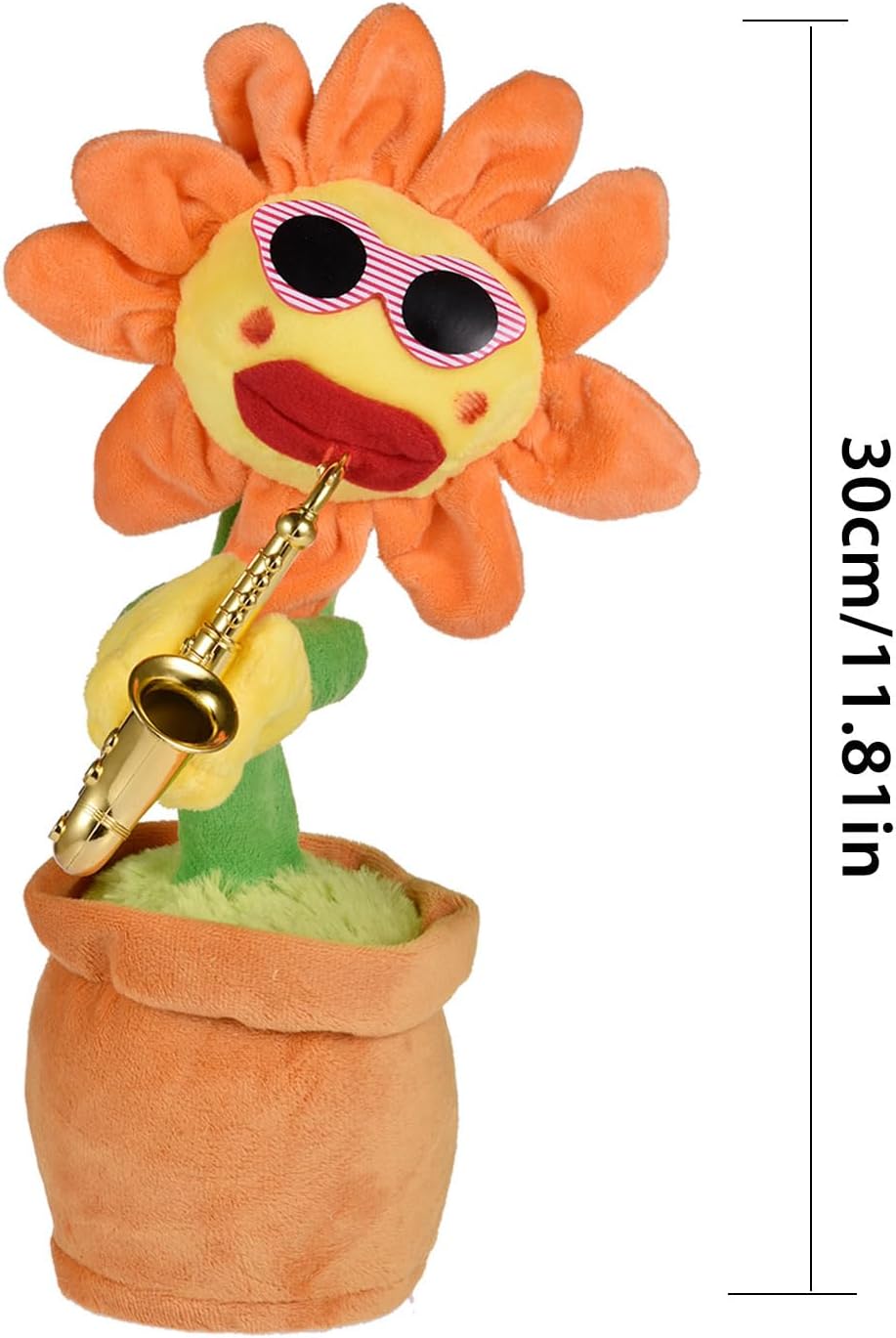 80 brani incorporati: per fornirti un prodotto aggiornato, ci sono 80 brani inclusi in questo giocattolo con luci rosse. Se vuoi riprodurre altri brani, premi nuovamente il pulsante dopo l'interruzione 'ultima musica. Le canzoni di questo giocattolo includono Time, Panama, Heart Beat, Far Away, No More, , Baby, Right Here Waiting, Wishing You Prosperity, Happy New Year, ecc. Sicuro e non tossico: realizzato in peluche sicuro e non tossico, il breve peluche girasole è comodo e morbido, assolutamente sicuro per i bambini. Il giocattolo divertente e che può ballare, cantare e muoversi offrirà ai bambini un felice momento di gioco. Come usare: Il giocattolo del girasole che necessita di 3 batterie AA autopreparate per l'alimentazione (le batterie non sono incluse nella consegna) è alto circa 30 cm/ 11,81 pollici. E può essere avviato accendendo l'interruttore sul fondo dopo aver installato le batterie. Quindi premere il pulsante 'etichetta sonora del prodotto, il girasole può iniziare a cantare e ballare. Giocattolo divertente: il divertente e magico giocattolo di girasole che può essere inviato come miglior regalo di Natale per bambini, amici e familiari può ballare e cantare, che è il giocattolo per i bambini. E può anche far rilassare gli adulti. Con il sassofono: con il design che balla al ritmo della musica, il giocattolo girasole che tiene in mano un sassofono è un giocattolo divertente che può portare gioia alle persone. Inoltre, possiede anche grandi labbra rosse e occhiali da sole.