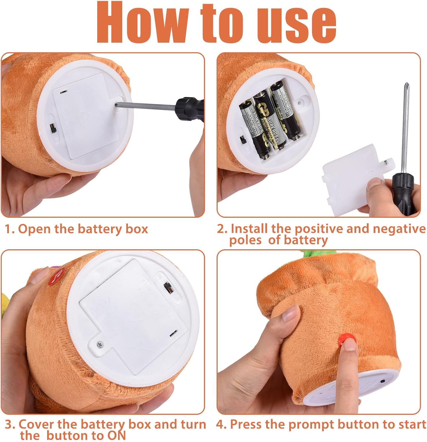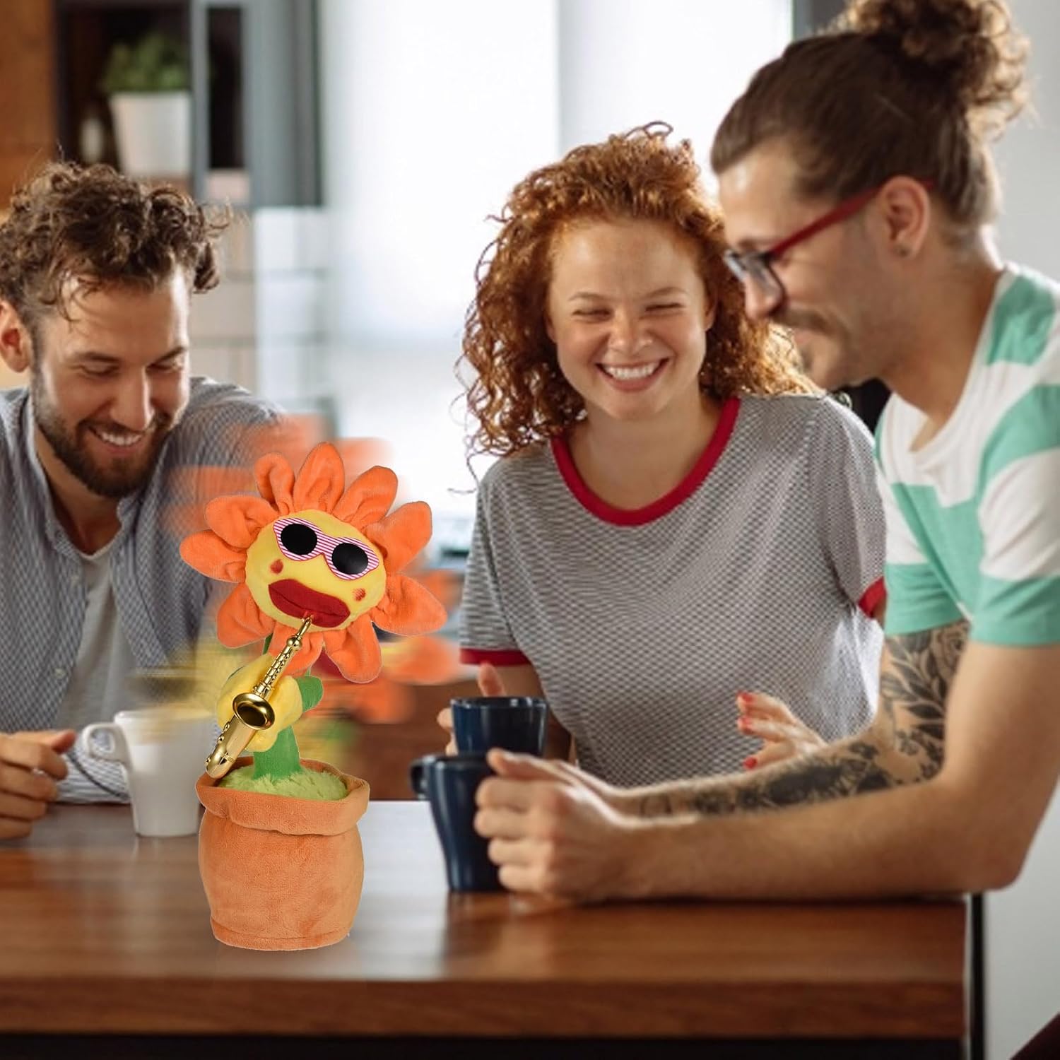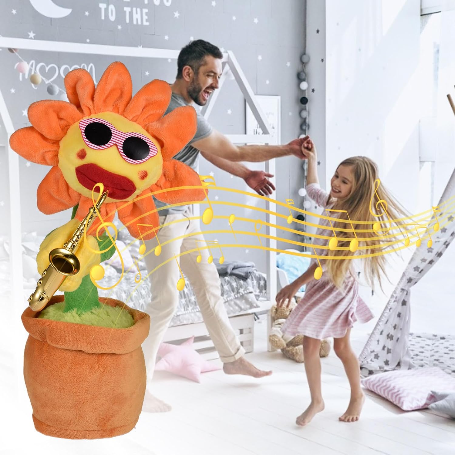 80 brani incorporati: per fornirti un prodotto aggiornato, ci sono 80 brani inclusi in questo giocattolo con luci rosse. Se vuoi riprodurre altri brani, premi nuovamente il pulsante dopo l'interruzione 'ultima musica. Le canzoni di questo giocattolo includono Time, Panama, Heart Beat, Far Away, No More, , Baby, Right Here Waiting, Wishing You Prosperity, Happy New Year, ecc. Sicuro e non tossico: realizzato in peluche sicuro e non tossico, il breve peluche girasole è comodo e morbido, assolutamente sicuro per i bambini. Il giocattolo divertente e che può ballare, cantare e muoversi offrirà ai bambini un felice momento di gioco. Come usare: Il giocattolo del girasole che necessita di 3 batterie AA autopreparate per l'alimentazione (le batterie non sono incluse nella consegna) è alto circa 30 cm/ 11,81 pollici. E può essere avviato accendendo l'interruttore sul fondo dopo aver installato le batterie. Quindi premere il pulsante 'etichetta sonora del prodotto, il girasole può iniziare a cantare e ballare. Giocattolo divertente: il divertente e magico giocattolo di girasole che può essere inviato come miglior regalo di Natale per bambini, amici e familiari può ballare e cantare, che è il giocattolo per i bambini. E può anche far rilassare gli adulti. Con il sassofono: con il design che balla al ritmo della musica, il giocattolo girasole che tiene in mano un sassofono è un giocattolo divertente che può portare gioia alle persone. Inoltre, possiede anche grandi labbra rosse e occhiali da sole.
