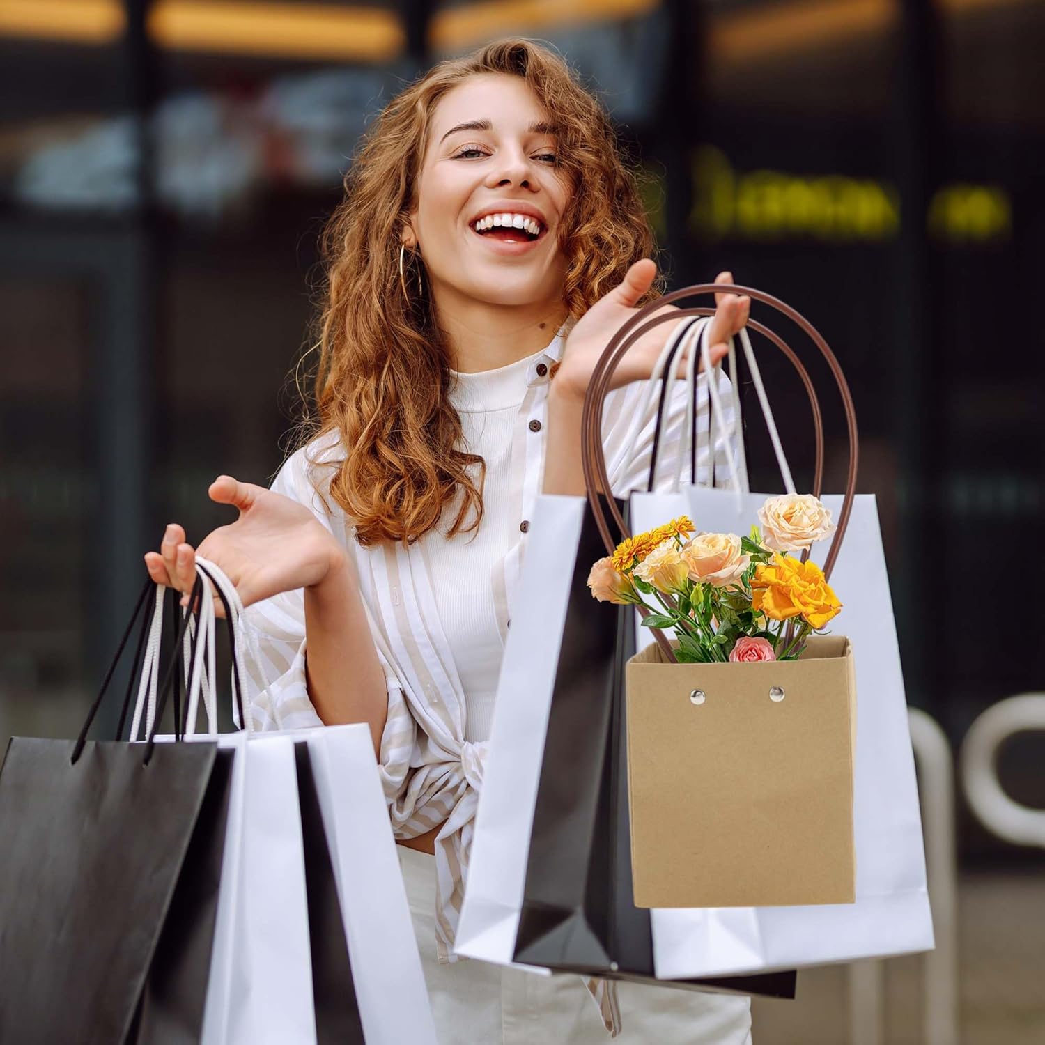 Quantità generosa: questo set contiene 10 sacchetti regalo con manici per garantire una fornitura adeguata per le diverse occasioni. Condividi con amici e familiari per diffondere gioia o tienilo a portata di mano per uso personale quando necessario. DUREVOLI E SOSTENIBILI: Realizzati con materiali durevoli, questi sacchetti per fiori sono robusti e leggeri, rendendoli adatti a molteplici usi. La loro natura riutilizzabile non solo riduce gli sprechi, ma promuove anche pratiche sostenibili in modo da poter godere della loro funzionalità riducendo al minimo l'impatto ambientale. Design intuitivo: le robuste maniglie di questi sacchetti regalo floreali li rendono facili da trasportare sia che tu stia trasportando fiori o regali. Quando non vengono utilizzate, queste borse possono essere riposte in piano per risparmiare spazio e mantenere in ordine l'area di stoccaggio. Applicazioni versatili: dalla confezione floreale e regalo all'organizzazione di cosmetici e articoli quotidiani, queste versatili borse floreali coprono una varietà di esigenze. Adatte a varie occasioni come la festa della mamma, matrimoni, compleanni e celebrazioni festive, queste borse aggiungono un tocco incantevole alle tue esperienze di regali. Opzioni di personalizzazione: lascia risplendere la tua creatività personalizzando questi sacchetti regalo per riflettere il tuo stile unico. Che tu preferisca disegni carini, messaggi sinceri, adesivi decorativi, nastri o altri abbellimenti, queste borse fungono da tela per la tua espressione artistica e ti consentono di creare presentazioni uniche.
