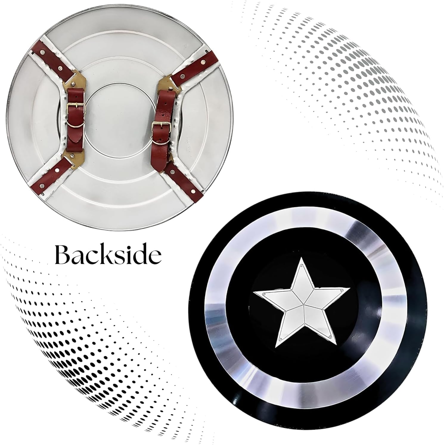 Lunghezza totale: 55,9 cm, peso: 4 kg circa 100% fatto a mano: questo è uno scudo rotondo di alta qualità fatto a mano. Appendere al braccio o al muro: lo scudo adulto Capitan America ha due cinghie in pelle regolabili e un gancio triangolare sul retro. Può essere appeso al braccio o alla parete come ornamento. Captain America Metal Shield: l'iconico motivo rosso, bianco e blu è abbinato a un delicato cinturino in pelle per realizzare una replica 1:1 dello scudo di Capitan America nel film. Processo di aggiornamento frontale: processo di pressofusione, motivo rosso, bianco e blu, rivestimento avanzato di protezione ambientale, forte struttura metallica.