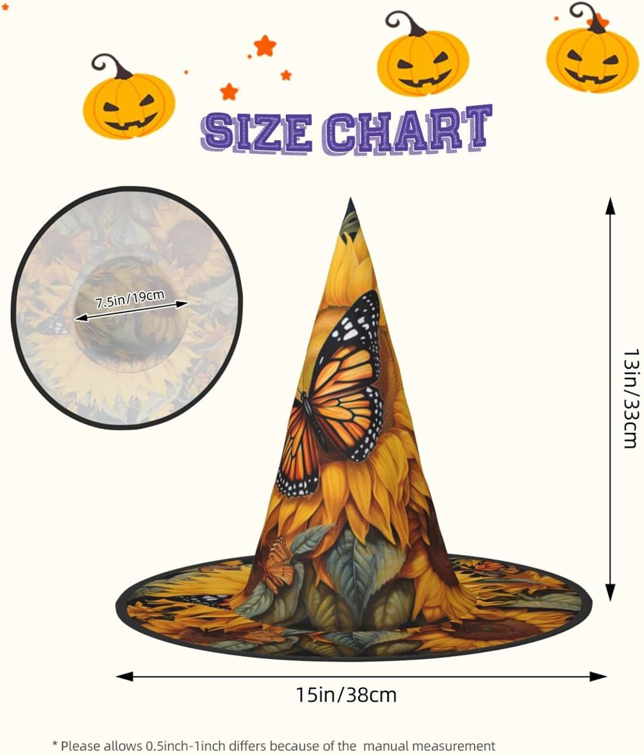 Realizzati in comodo tessuto Oxford, questi cappelli con stampa a farfalla e girasole promettono una vestibilità aderente e un uso duraturo. Con un design unico, questi cappelli con stampa farfalla girasole possono essere serrati, attorcigliati e piegati secondo le tue esigenze, aggiungendo un pizzico di stile e convenienza al tuo enssemble di Halloween. Progettati per adattarsi alla maggior parte delle persone, questi cappelli con stampa a farfalla sono facili da trasportare per feste di Halloween, carnevale, feste in maschera ed eventi cosplay. Essendo lavabili in lavatrice e a mano, questi cappelli richiedono una cura minima. Evitare l'uso di candeggina per il lavaggio.