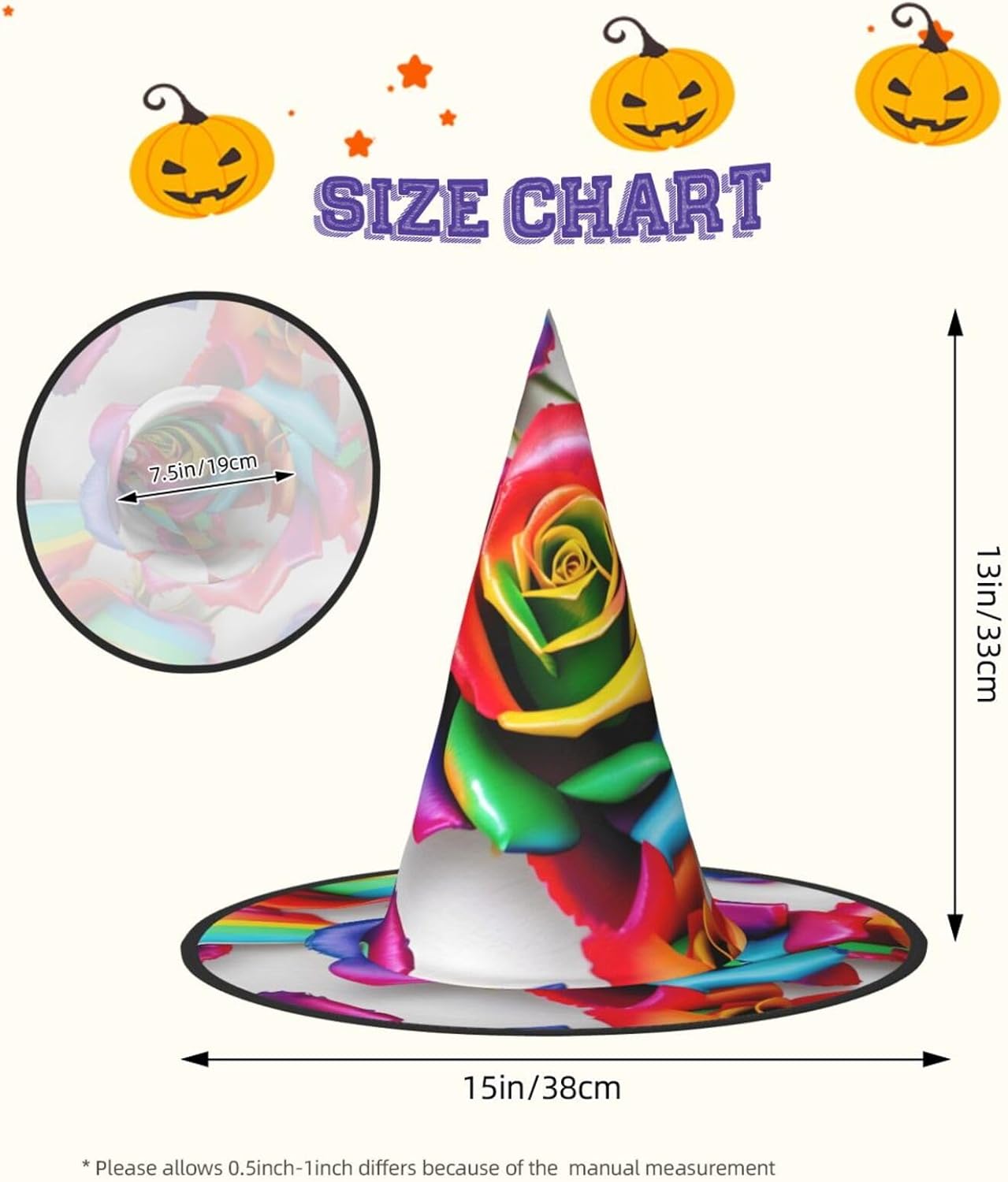 Realizzati in tessuto confortevole, morbido e Oxford, questi cappelli con stampa floreale rosa arcobaleno sono ideali per Halloween e feste in costume. Il design unico e leggero consente di piegare e torcere le falde del cappello, offrendo una facile conservazione e portabilità. Con una dimensione che si adatta alla maggior parte, questi cappelli di Halloween con stampa di fiori di rosa arcobaleno per uomini e donne sono ideali per carnevale, balli in maschera ed eventi di ruolo. Diventa il centro dell'attenzione in qualsiasi riunione! Inoltre, i nostri cappelli da strega sono facili da pulire: lavare a mano o in lavatrice, asciugare rapidamente e non richiedono candeggina. Festeggia Halloween con stile con i nostri cappelli da strega con stampa di fiori di rosa arcobaleno!