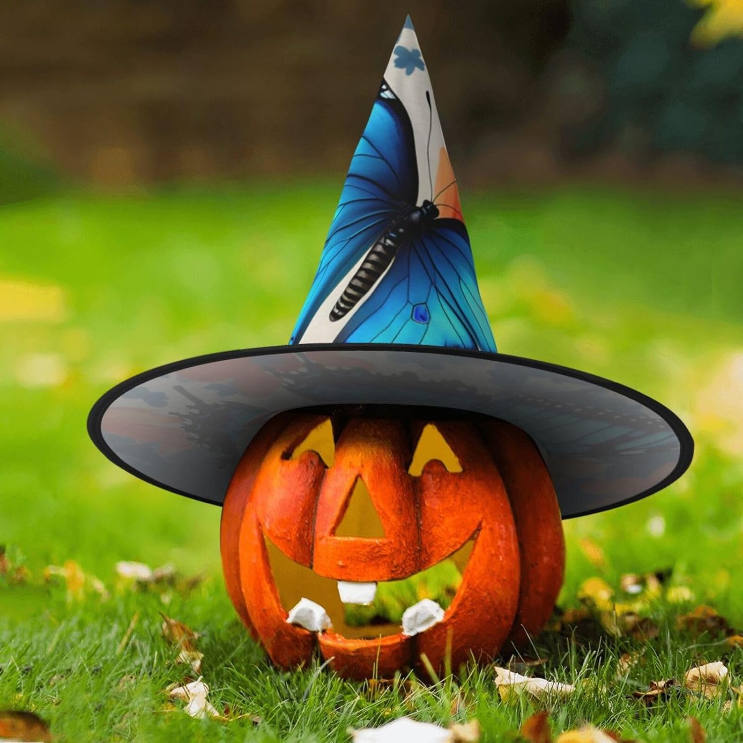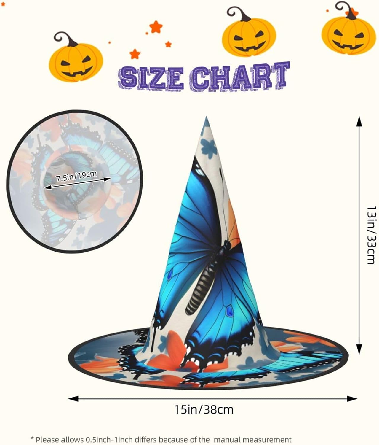 Realizzato con comodo panno Oxford, questo cappello da strega blu con stampa farfalla non è solo un accessorio; è un investimento per molte stagioni di Halloween a venire. Il design unico del cappello consente di restringere la parte superiore e la tesa di essere attorcigliata e piegata, rendendolo compatto e facile da riporre. Nonostante la sua struttura, è incredibilmente leggero e può essere trasportato ovunque senza problemi. Il nostro cappello da strega di Halloween con stampa farfalla blu è progettato per adattarsi comodamente alla maggior parte delle persone, rendendolo una scelta ideale per qualsiasi festa di Halloween, carnevale, mascherata o evento cosplay. Il suo design accattivante ti renderà il punto focale della festa.