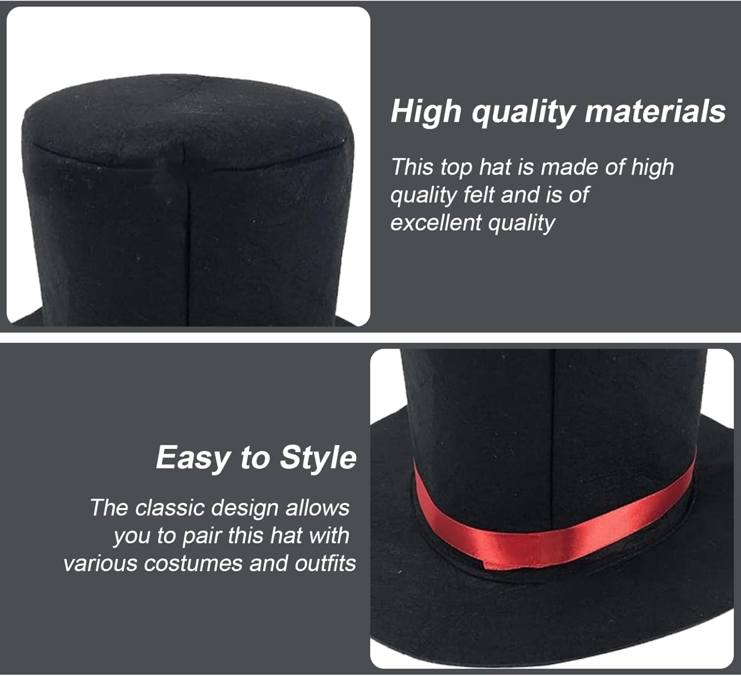 Descrizione del prodotto Cappello a cilindro, cappello a cilindro nero, cappello da mago alla moda, cappelli Fedora retrò per uomo donna bambino costume da maggiordomo per ruoli feste a tema festival, cappelli per adulti Descrizione: Migliora il tuo gioco di costumi con il nostro cappello premium, perfetto per maghi, buter o chiunque cerchi di aggiungere un pizzico di fascino. Realizzato in feltro di alta qualità, questo cappello premium è un accessorio versatile adatto per adulti, bambini e persino animali domestici, con una comoda circonferenza di 56-58 cm (22,05-22,83 pollici). Il suo design senza tempo lo rende un'ottima scelta per giochi di ruolo, feste in maschera e festival, ti garantirà di distinguerti tra la folla.. Che tu stia eseguendo trucchi magici o partecipando a un evento a tema, questo cappello premium è il tocco finale ideale per il tuo outfit.. Abbraccia la magia e la raffinatezza che porta!. Caratteristiche:.. CAPPELLO.. -Colore:.. -Materiale: feltro.. -Dimensioni: circonferenza 56-58 cm. Sostituire se usurato.. Utilizzare solo come previsto.. Conservare in un luogo fresco e asciutto quando non in uso.. La confezione include 1 pezzo * Avviso di sicurezza del cappello a cilindro Attenzione: questo prodotto è destinato esclusivamente a giochi di ruolo e feste a tema e non è adatto per l'uso quotidiano. Do not use it for dangerous activities such as climbing or driving. Tenerlo pulito e asciutto.