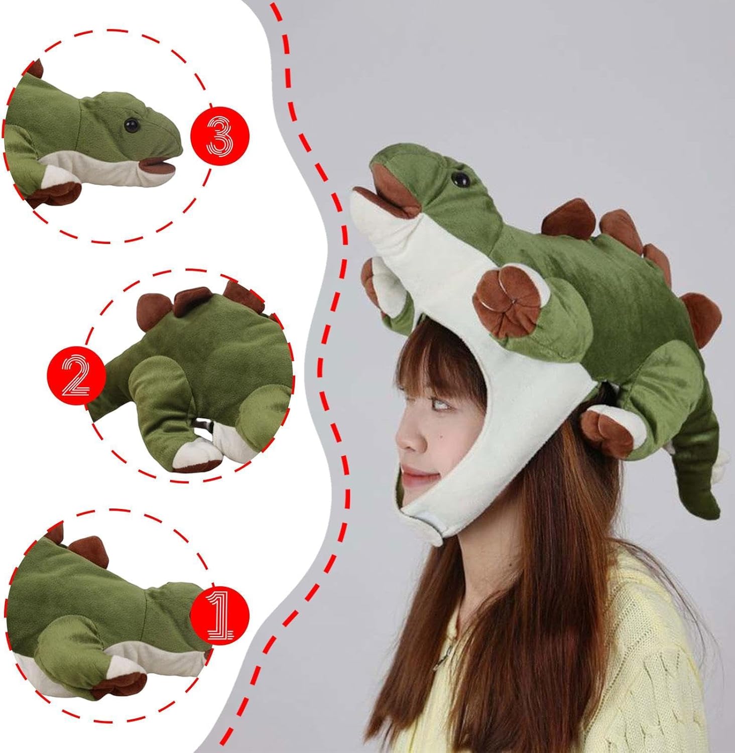 【Taglia】: Cappello da animale con lunghezza di 55 cm/21,65 pollici, questo copricapo con cinturino regolabile è progettato per adattarsi alla maggior parte degli adulti e dei bambini. Garantisce una vestibilità comoda e sicura durante l'uso, migliorando l'esperienza complessiva. 【Design creativo】: Il copricapo di peluche presenta un grazioso design a forma di dinosauro, che lo rende un accessorio ideale per servizi fotografici o spettacoli. Aggiunge immediatamente un tocco di divertimento e creatività a ogni occasione. 【Adatto a varie occasioni】: Questo simpatico cappello a forma di animale è ideale per l'uso quotidiano, feste, giochi di ruolo, mostre, eventi cosplay, costumi, oggetti di scena fotografici, Halloween, Pasqua, spettacoli teatrali e altro ancora 【Materiale premium】: questo copricapo da dinosauro è realizzato in poliestere di qualità, morbido, confortevole, resistente all'usura e riutilizzabile 【Ottimi regali】: Ottimo regalo per i tuoi amici, questo copricapo in peluche da è solo un cappello invernale, un copricapo in peluche, un berretto per foto di feste, in di tenere al caldo