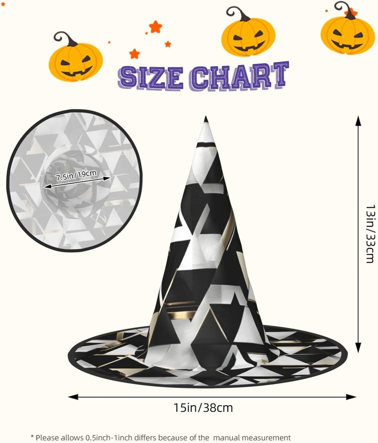 Trasforma la tua festa di Halloween o Carnevale con il nostro cappello da strega di Halloween, progettato per aggiungere stile e divertimento a qualsiasi evento a tema. Alto 33 cm con un diametro esterno impressionante di 38 cm, questo cappello non è solo accattivante ma anche incredibilmente versatile. Realizzato in tessuto Oxford, il cappello offre una vestibilità comoda e una qualità di lunga durata. Il design completamente stampato garantisce che si distingua da qualsiasi folla, mentre la struttura pieghevole consente un facile stoccaggio e trasporto. Che tu stia partecipando a un ballo in maschera, a un evento cosplay o decorando la tua casa per le vacanze, questo cappello da strega sarà l'accessorio. Le dimensioni generose e le funzionalità regolabili lo rendono adatto a un'ampia gamma di utenti, garantendo che tutti possano godere del suo fascino. Aggiungi un tocco di fantasia al tuo outfit o usalo come pezzo decorativo per l'arredamento delle tue vacanze. Migliora la tua esperienza di festa e diventa il centro dell'attenzione con questo fantastico cappello da strega del carnevale di Halloween