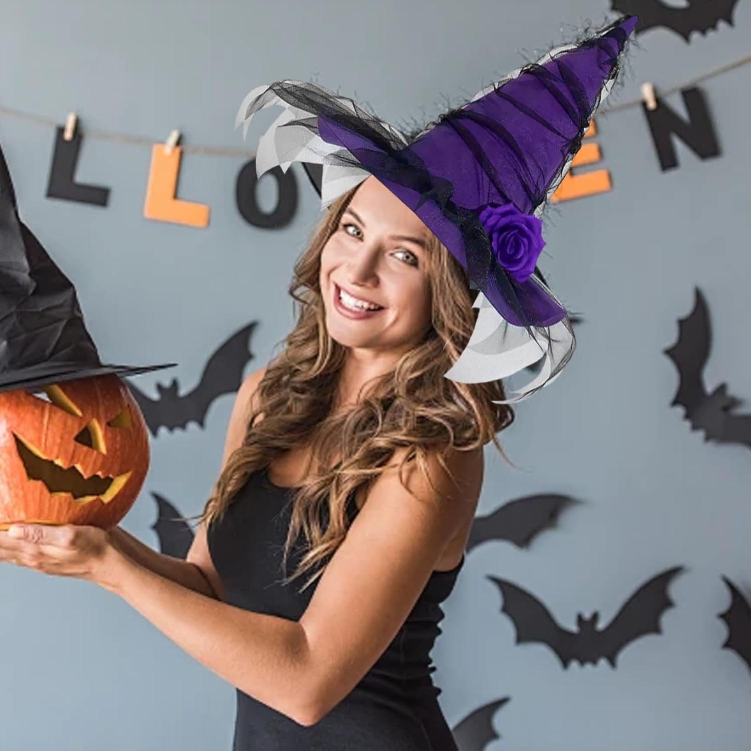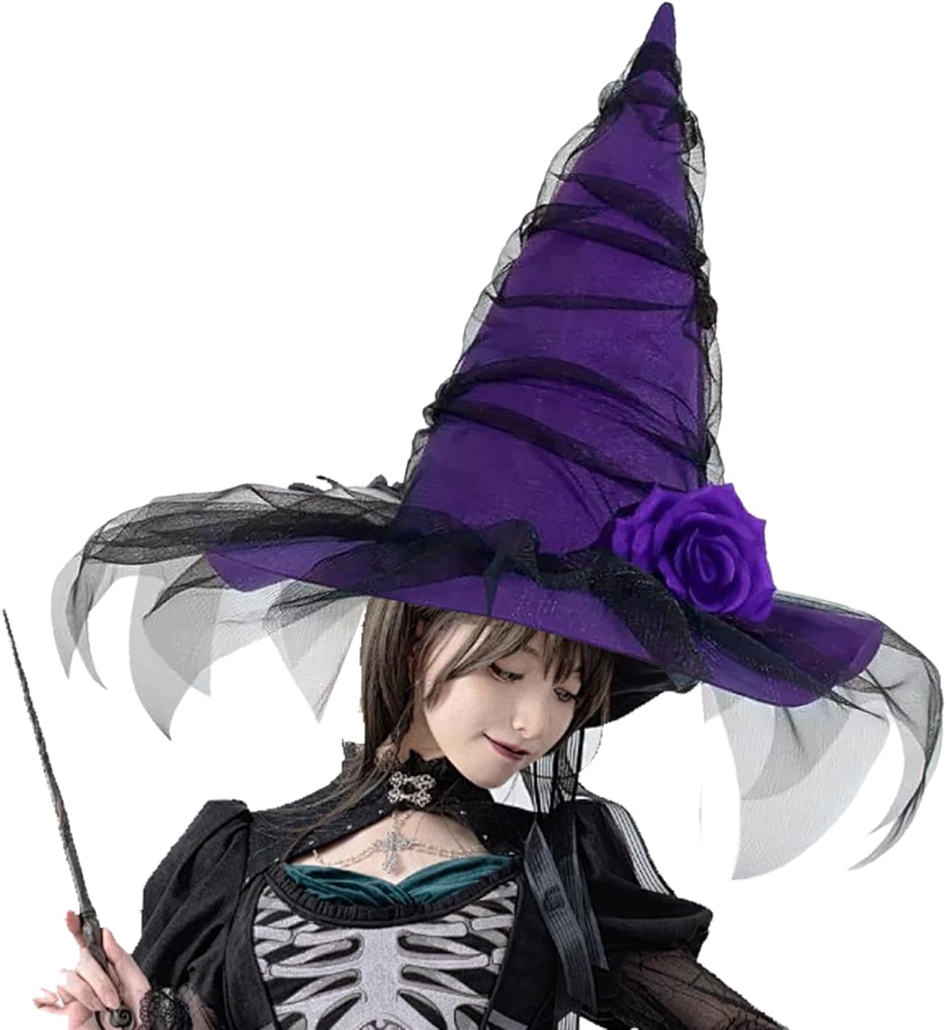 Uso versatile: perfetto per feste in costume di Halloween, eventi cosplay, spettacoli teatrali o servizi fotografici a tema, questo cappello da strega abbina facilmente a una varietà di look, dalle streghe classiche agli stili gotici moderni. Materiali di alta qualità: realizzato con tessuto e decorazioni di alta qualità, questo cappello da strega rimane leggero ma robusto, resiste alle rughe e ai danni e mantiene la sua forma attraverso l'uso ripetuto. Dettagli decorativi unici: la garza inclusa stratificata sopra la tesa e il dettaglio del fiore artificiale realizzato a mano ne migliorano l'estetica autentica e spettrale e lo distinguono dai generici cappelli da strega sul mercato. Vestibilità comoda per le donne: progettato per adattarsi comodamente alla maggior parte delle dimensioni della testa degli adulti, il materiale traspirante e la struttura regolabile garantiscono un'usura sicura per tutta la notte, rendendolo ideale per feste, eventi o lunghe sessioni di cosplay. Elegante design gotico: questo cappello da strega presenta una classica tesa larga 26,8x13,4 e una punta alta e appuntita, realizzato in ricco tessuto nero con garza delicata e un accattivante fiore artificiale, perfetto per aggiungere un tocco drammatico e mistico a qualsiasi outfit di Halloween o cosplay.