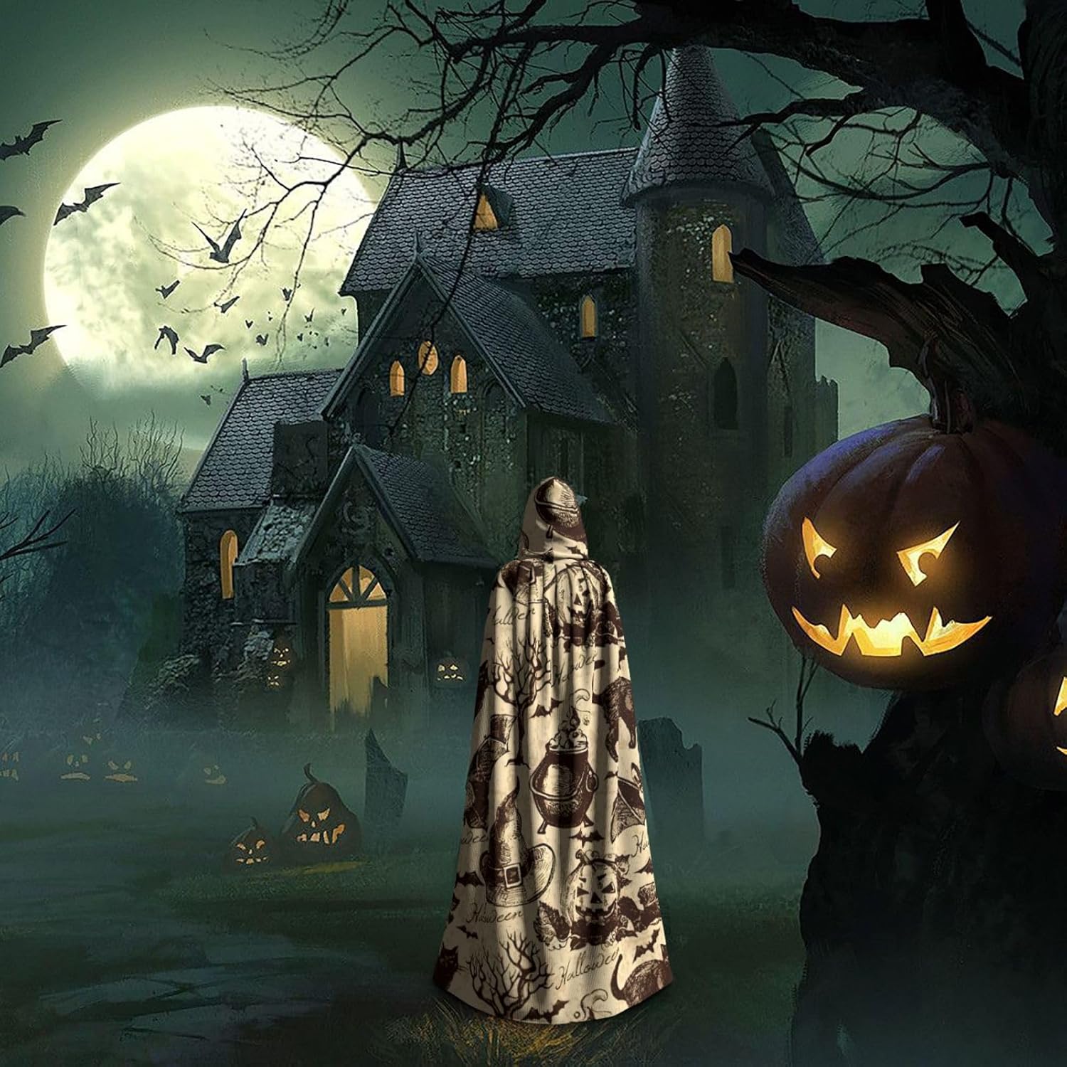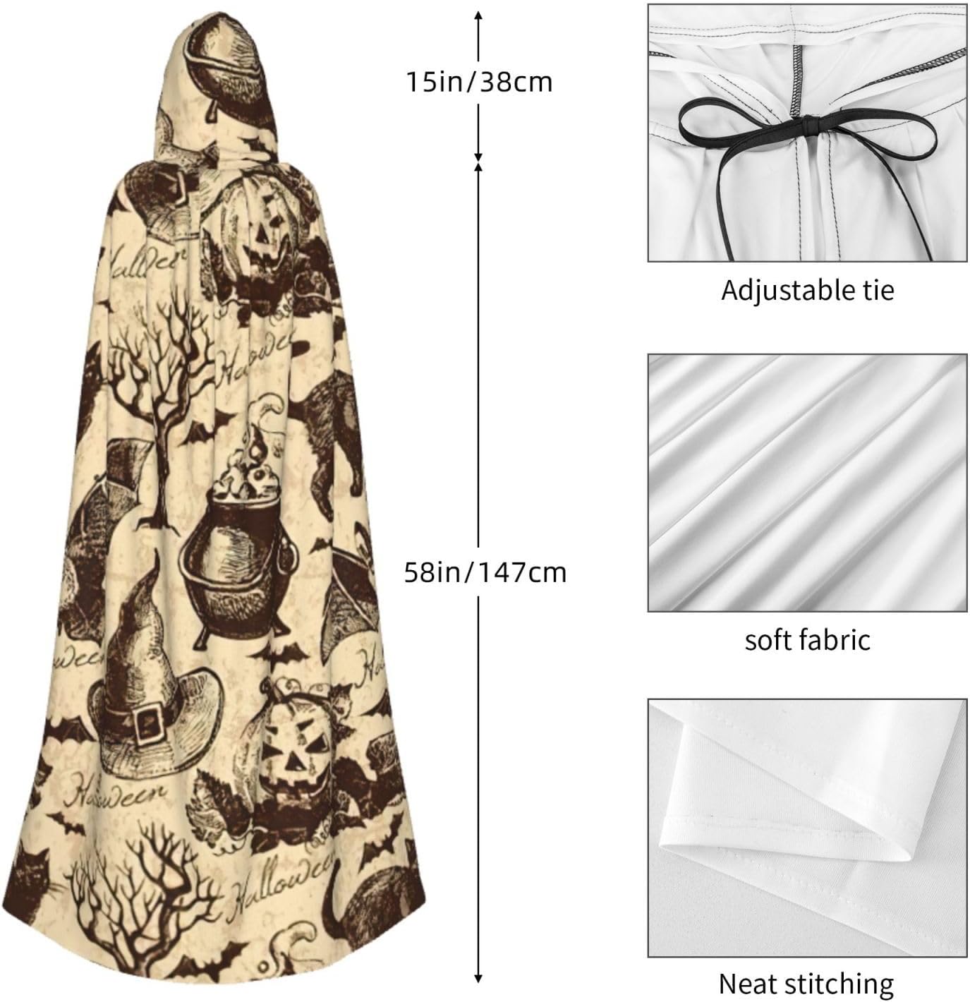 Il design senza cerniera, abbinato a un grande mantello con cappuccio e cravatta al collo, migliora il tuo mistero mantenendoti comodo con il suo tessuto non prurito. Con una lunghezza di 147 cm, larghezza di 154 cm e un'altezza del cappuccio di 38 cm, il nostro mantello con cappuccio con stampa a cappello da strega offre una copertura completa, assicurandoti di distinguerti in ogni occasione. Vari eventi come Halloween, cosplay, costumi da palcoscenico, feste a tema, balli, convegni di fumetti e molto altro ancora, il nostro mantello è versatile e conveniente. Facile da mantenere e di lunga durata, il nostro mantello con cappuccio con stampa cappello da strega è lavabile in lavatrice e lavabile a mano. Con un design neutro, il nostro mantello è perfetto per uomini e donne.