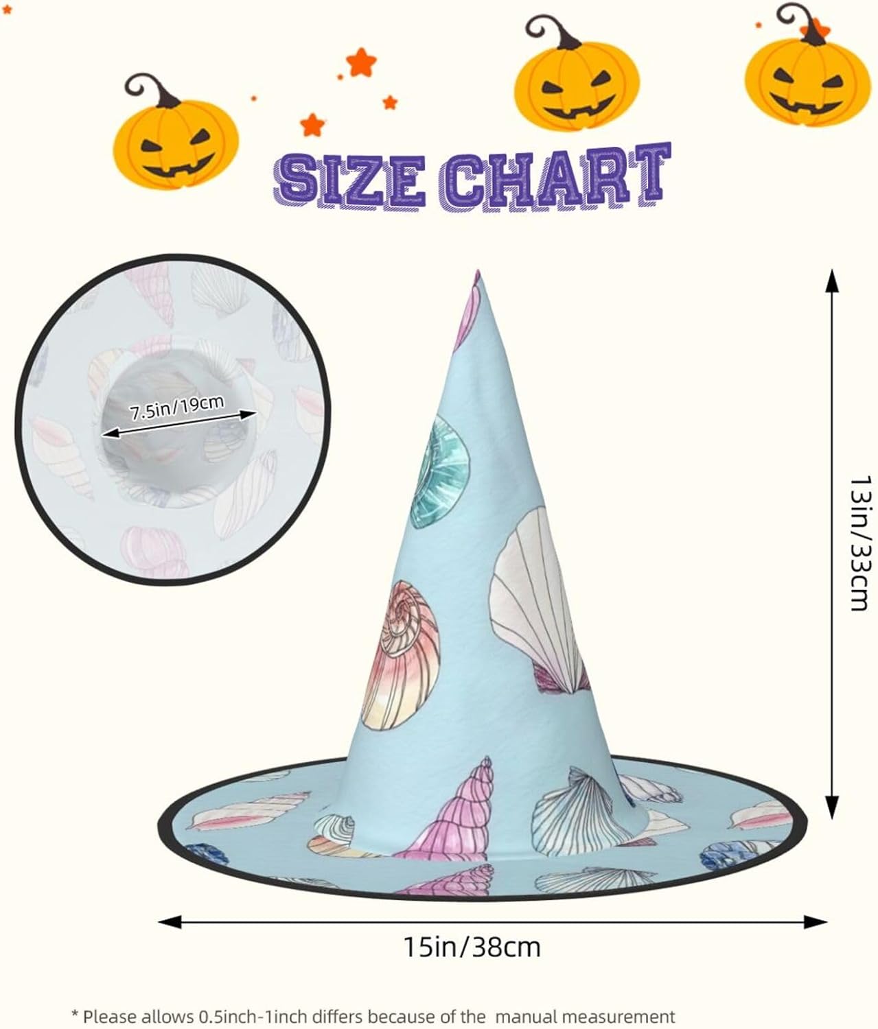 Realizzato con comodo panno Oxford, questo cappello da strega con stampa di conchiglie marine non è solo un accessorio; è un investimento per molte stagioni di Halloween a venire. Il design unico del cappello consente di restringere la parte superiore e la tesa di essere attorcigliata e piegata, rendendolo compatto e facile da riporre. Nonostante la sua struttura, è incredibilmente leggero e può essere trasportato ovunque senza problemi. Il nostro cappello da strega di Halloween con stampa a conchiglia è progettato per adattarsi comodamente alla maggior parte delle persone, rendendolo una scelta ideale per qualsiasi festa di Halloween, carnevale, mascherata o evento cosplay. Il suo design accattivante ti renderà il punto focale della festa.