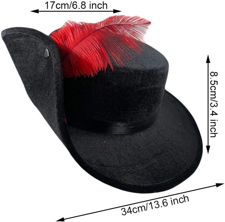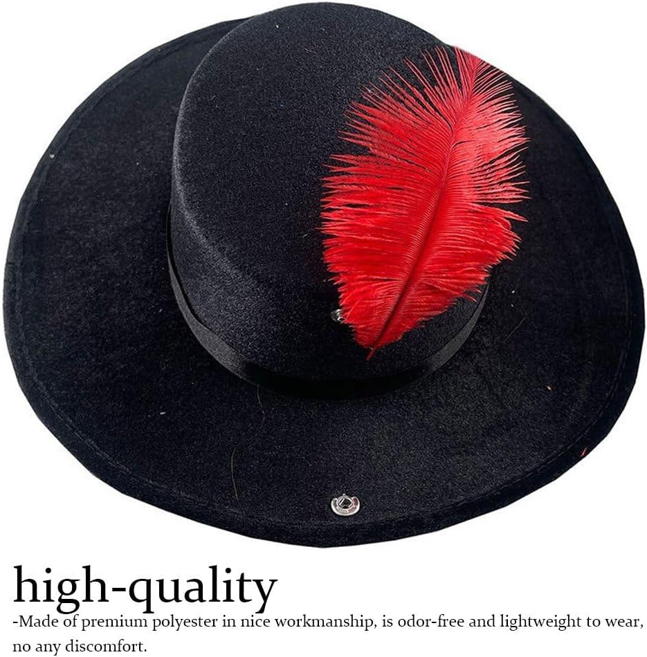 Adatto per Halloween, cosplay, spettacoli, carnevali, feste in maschera, nightclub, fotografia, ecc. Realizzato in poliestere di alta qualità con una bella finitura, è leggero da indossare, senza alcun disagio. Classico cappello a tesa larga decorato con vere piume, bottone sul davanti per ripiegare la falda, rendendolo un cappello da moschettiere. I materiali di alta qualità conferiscono un look esclusivo, aggiungendo un tocco di lusso al tuo outfit di Halloween. Taglia unica. Un cappello ideale, abbinandolo ad un completo da gentleman di Manhattan, sarebbe perfetto un completo da moschettiere dei costumi anni '20.