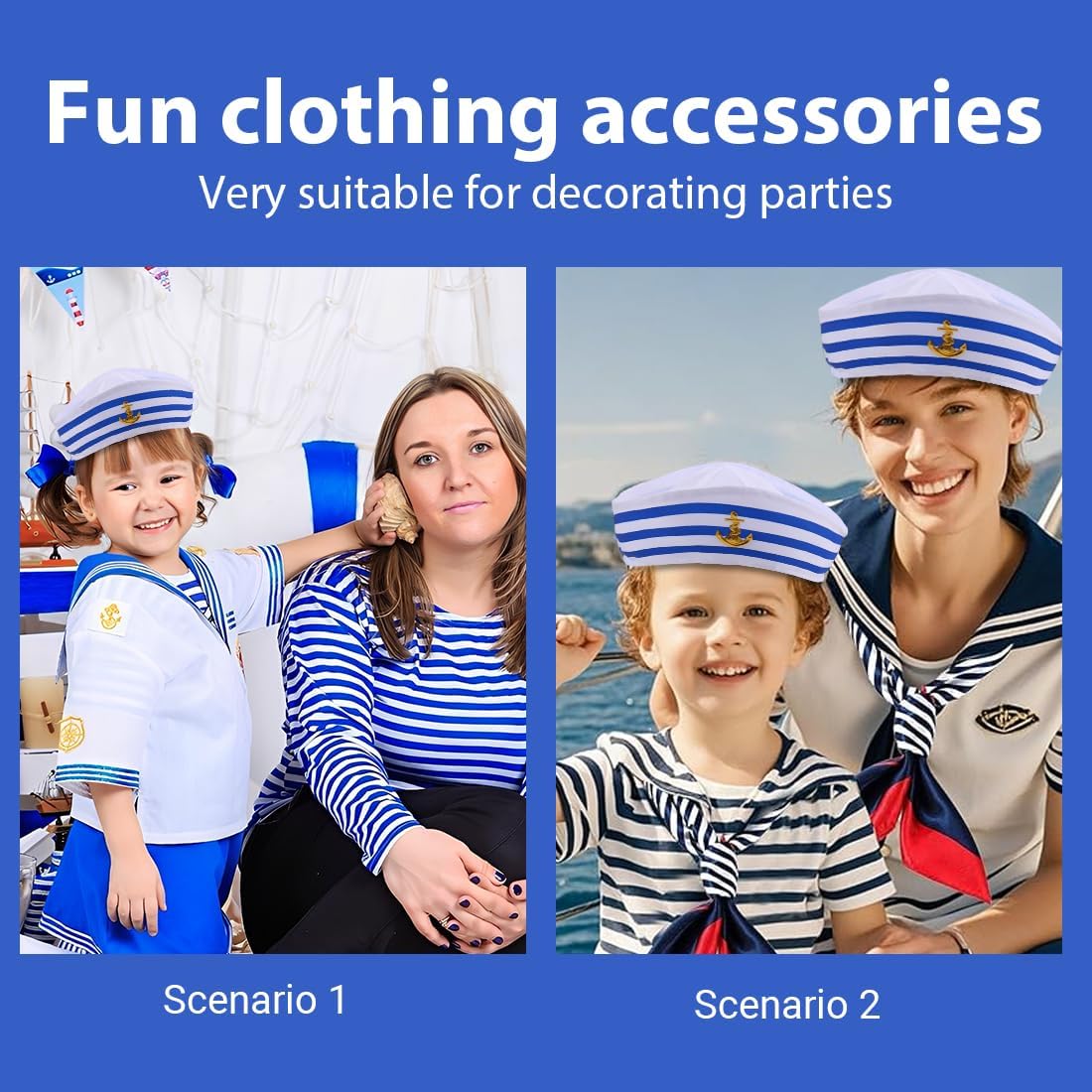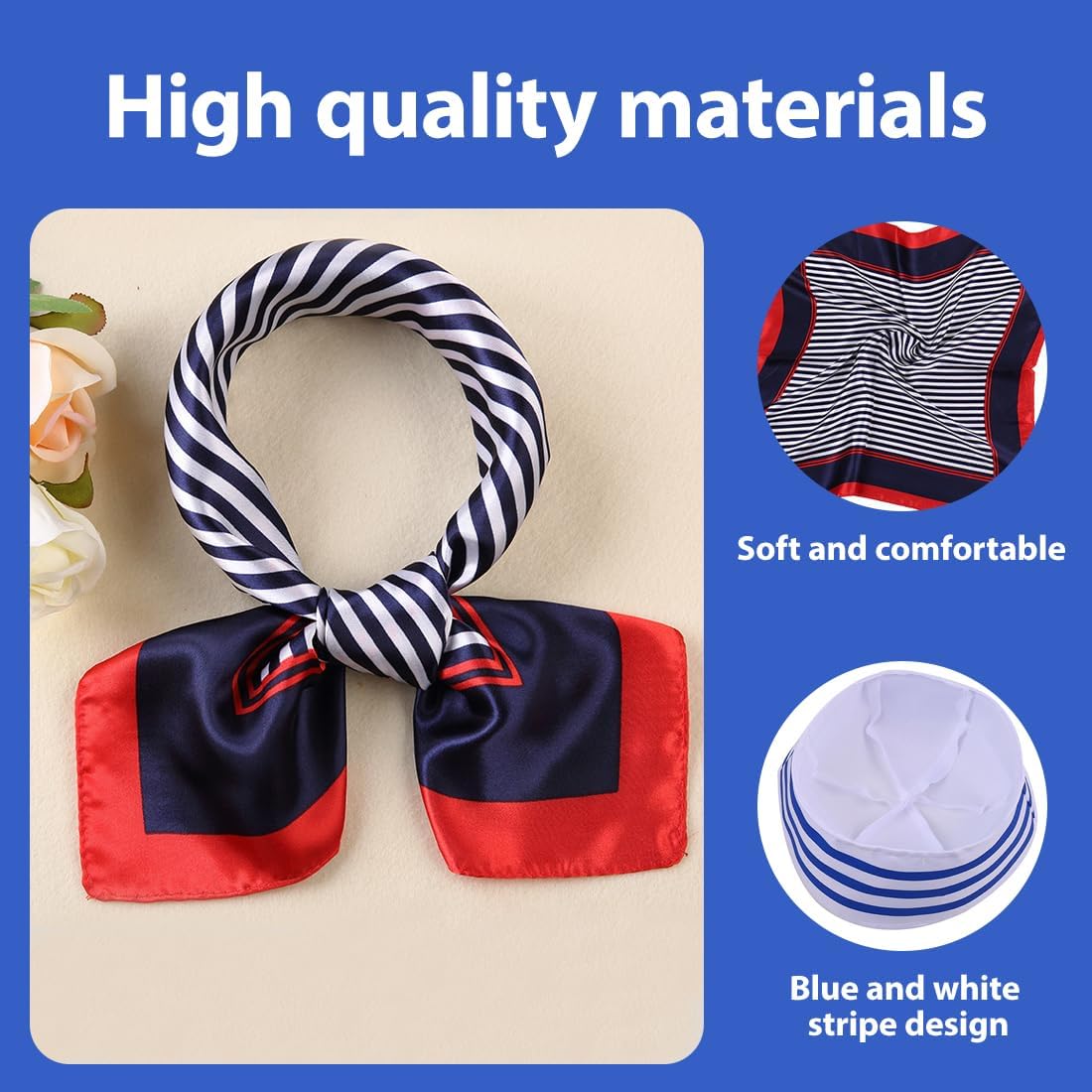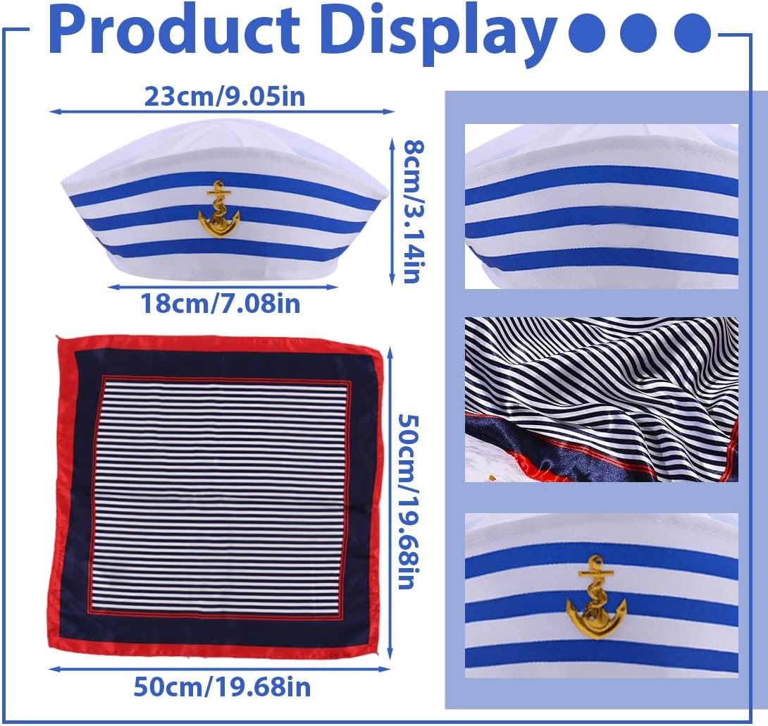 La confezione include: Riceverai un cappello da marinaio blu e bianco e una sciarpa da marinaio Materiale confortevole: le tute da marinaio sono realizzate principalmente in poliestere e finta seta, materiali comodi, morbidi, traspiranti e delicati sulla pelle. Misure adatte La circonferenza del cappello da marinaio è di 56 cm e quella della sciarpa è di 50 x 50 cm. Adatto alla maggior parte degli adolescenti e degli adulti COSTUME DA FESTA: Questo costume da marinaio è adatto per feste in barca, Halloween, crociere, vacanze, pesca, vela, spettacoli teatrali, giochi di ruolo, feste in piscina Ampiamente utilizzato: il costume da marinaio è perfetto per chiunque ami la vela, le feste in yacht, gli addii al celibato, le feste in maschera, le feste a tema nautico, le feste in piscina, ecc., per brillare alla festa Servizio post-vendita: se hai domande sui nostri prodotti, non esitare a contattarci e ti risponderemo entro 24 ore