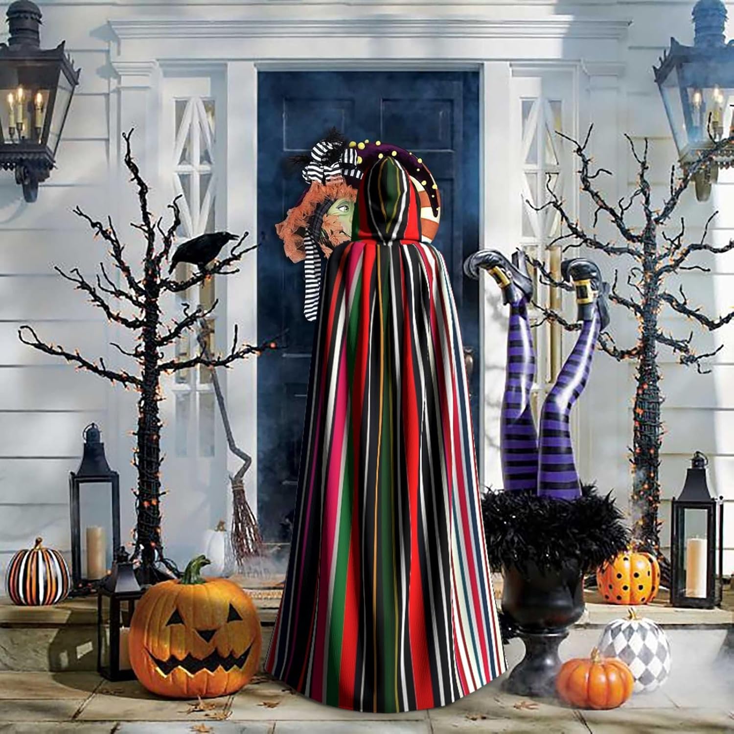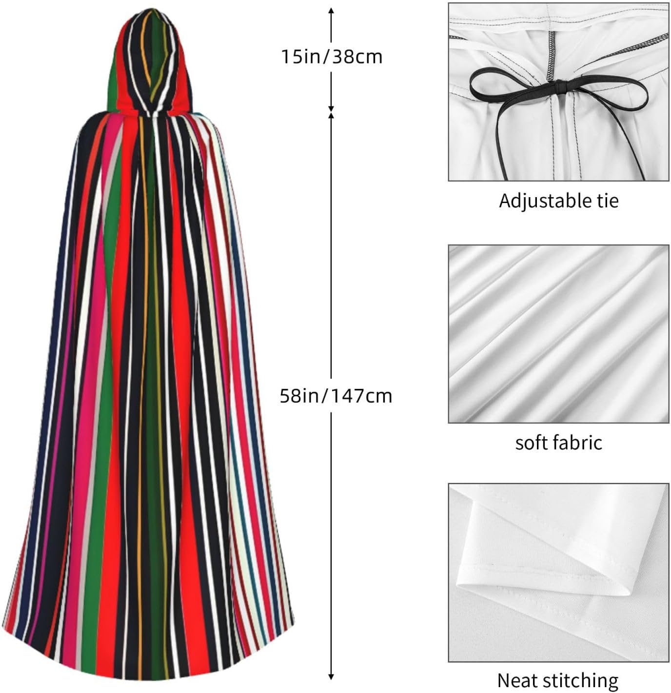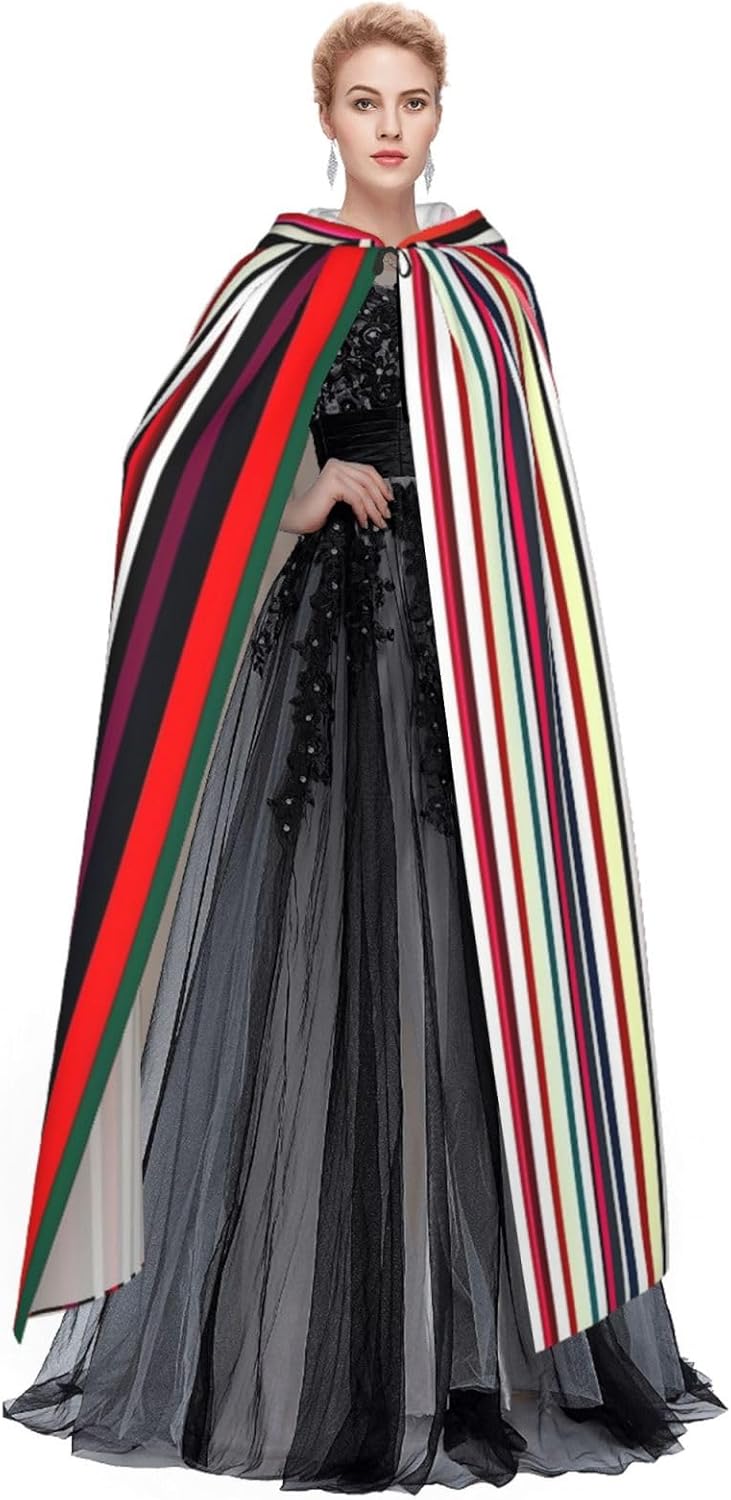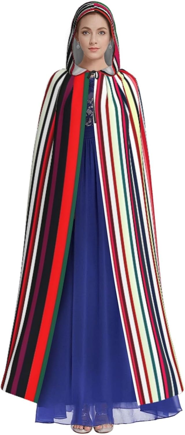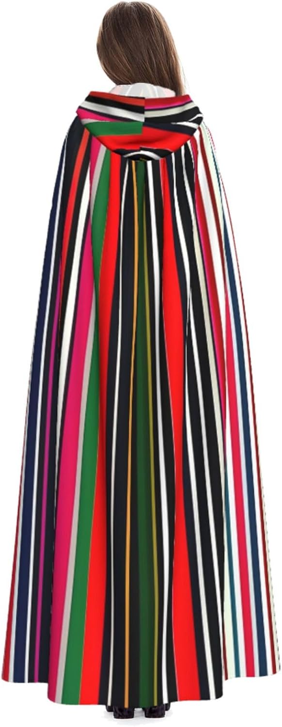 Il design senza cerniera, abbinato a un grande mantello con cappuccio e cravatta al collo, migliora il tuo mistero mantenendoti comodo con il suo tessuto non prurito. Con una lunghezza di 147 cm, una larghezza di 154 cm e un'altezza del cappuccio di 38 cm, il nostro mantello con cappuccio con stampa verticale a strisce colorate offre una copertura completa, assicurandoti di distinguerti in ogni occasione. Vari eventi come Halloween, cosplay, costumi da palcoscenico, feste a tema, balli, convegni di fumetti e molto altro ancora, il nostro mantello è versatile e conveniente. Facile da mantenere e di lunga durata, il nostro mantello con cappuccio con stampa verticale a strisce colorate è lavabile in lavatrice e lavabile a mano. Con un design neutro, il nostro mantello è perfetto per uomini e donne.