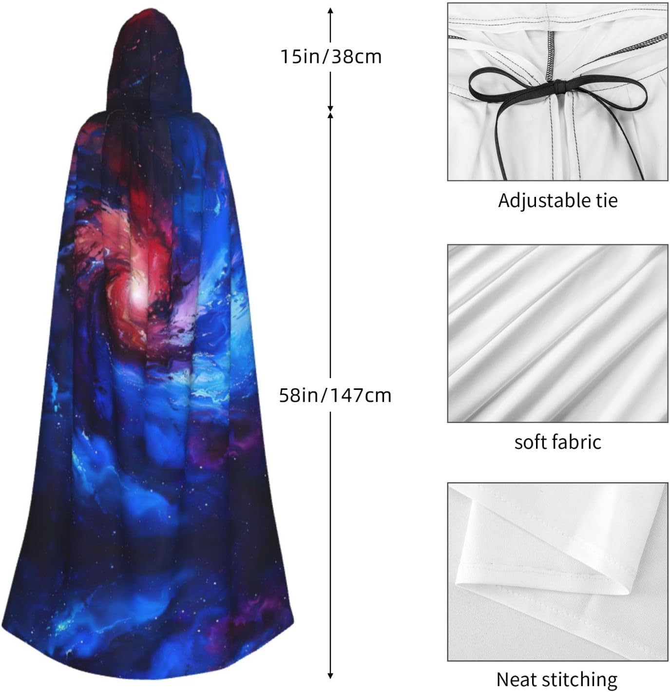 Il design senza cerniera, abbinato a un grande mantello con cappuccio e cravatta al collo, migliora il tuo mistero mantenendoti comodo con il suo tessuto non prurito. Con una lunghezza di 147 cm, una larghezza di 154 cm e un'altezza del cappuccio di 38 cm, il nostro mantello con cappuccio con stampa galassia rossa e blu offre una copertura completa, assicurandoti di distinguerti in ogni occasione. Vari eventi come Halloween, cosplay, costumi da palcoscenico, feste a tema, balli, convegni di fumetti e molto altro ancora, il nostro mantello è versatile e conveniente. Facile da mantenere e di lunga durata, il nostro mantello con cappuccio con stampa galassia rossa e blu è lavabile in lavatrice e lavabile a mano. Con un design neutro, il nostro mantello è perfetto per uomini e donne.