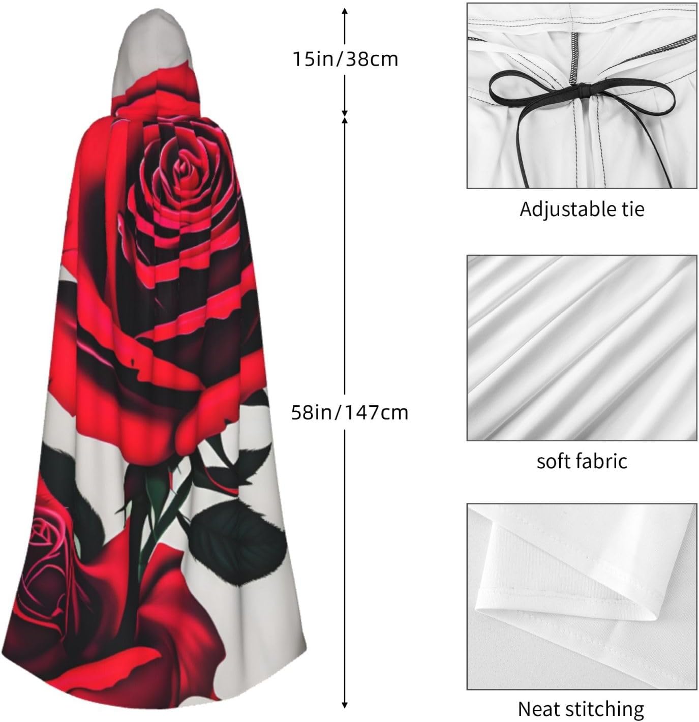 Il design senza cerniera, abbinato a un grande mantello con cappuccio e cravatta al collo, migliora il tuo mistero mantenendoti comodo con il suo tessuto non prurito. Con una lunghezza di 147 cm, larghezza di 154 cm e un'altezza del cappuccio di 38 cm, il nostro mantello con cappuccio con stampa di rose rosse offre una copertura completa, assicurandoti di distinguerti in ogni occasione. Vari eventi come Halloween, cosplay, costumi da palcoscenico, feste a tema, balli, convegni di fumetti e molto altro ancora, il nostro mantello è versatile e conveniente. Facile da mantenere e di lunga durata, il nostro mantello con cappuccio con stampa rosa rossa è lavabile in lavatrice e lavabile a mano. Con un design neutro, il nostro mantello è perfetto per uomini e donne.