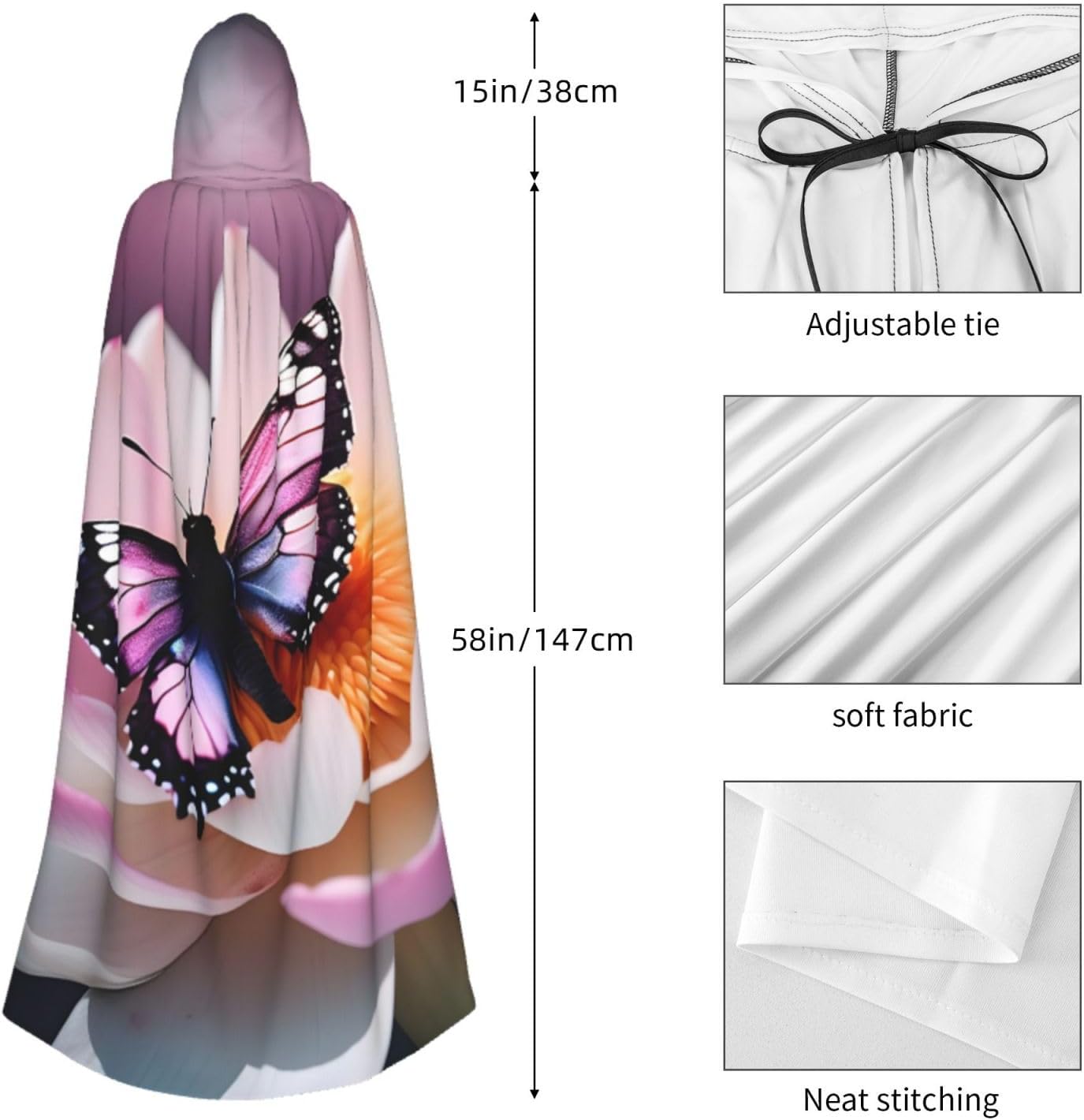 Il design senza cerniera, abbinato a un grande mantello con cappuccio e cravatta al collo, migliora il tuo mistero mantenendoti comodo con il suo tessuto non prurito. Con una lunghezza di 147 cm, larghezza di 154 cm e un'altezza del cappuccio di 38 cm, il nostro mantello con cappuccio con stampa a farfalla rossa offre una copertura completa, assicurandoti di distinguerti in ogni occasione. Vari eventi come Halloween, cosplay, costumi da palcoscenico, feste a tema, balli, convegni di fumetti e molto altro ancora, il nostro mantello è versatile e conveniente. Facile da mantenere e di lunga durata, il nostro mantello con cappuccio con stampa farfalla rossa è lavabile in lavatrice e lavabile a mano. Con un design neutro, il nostro mantello è perfetto per uomini e donne.