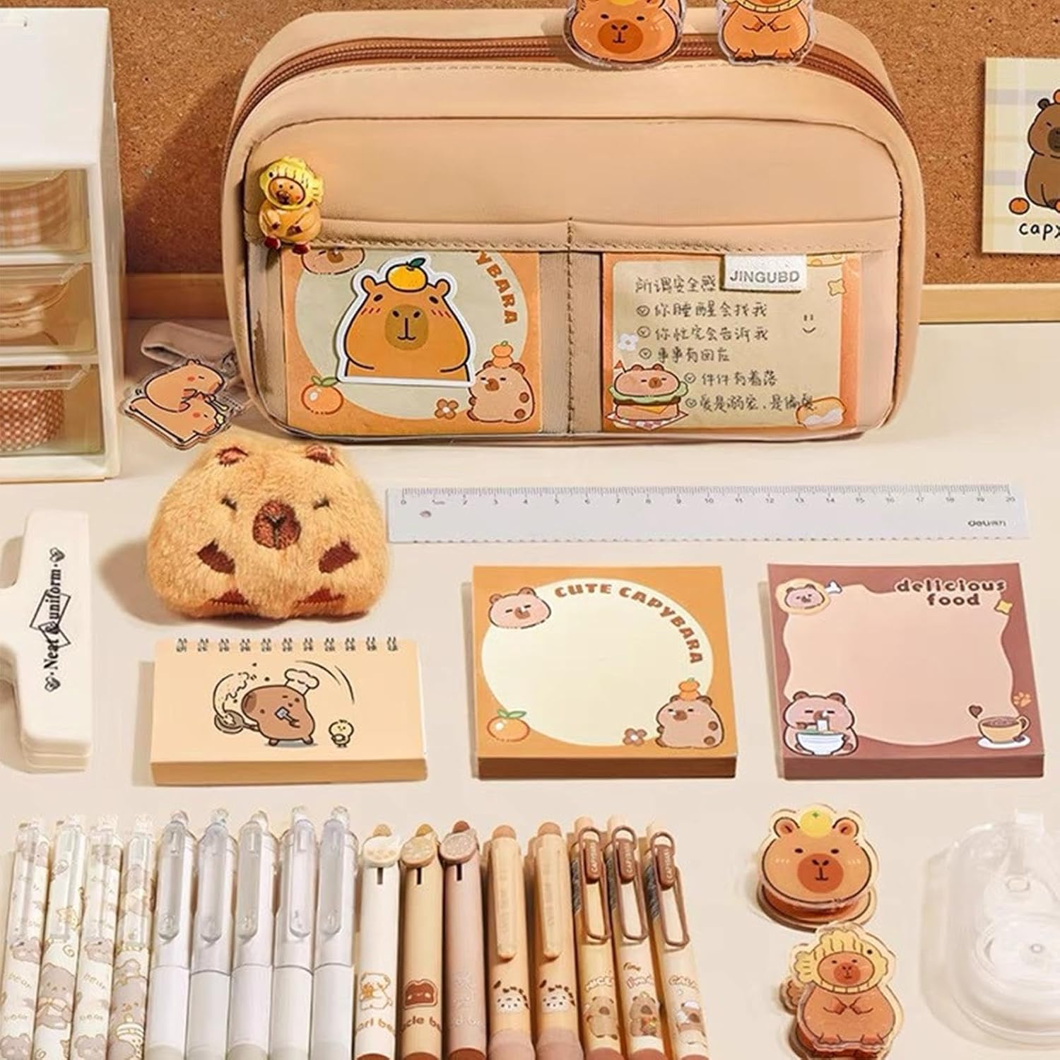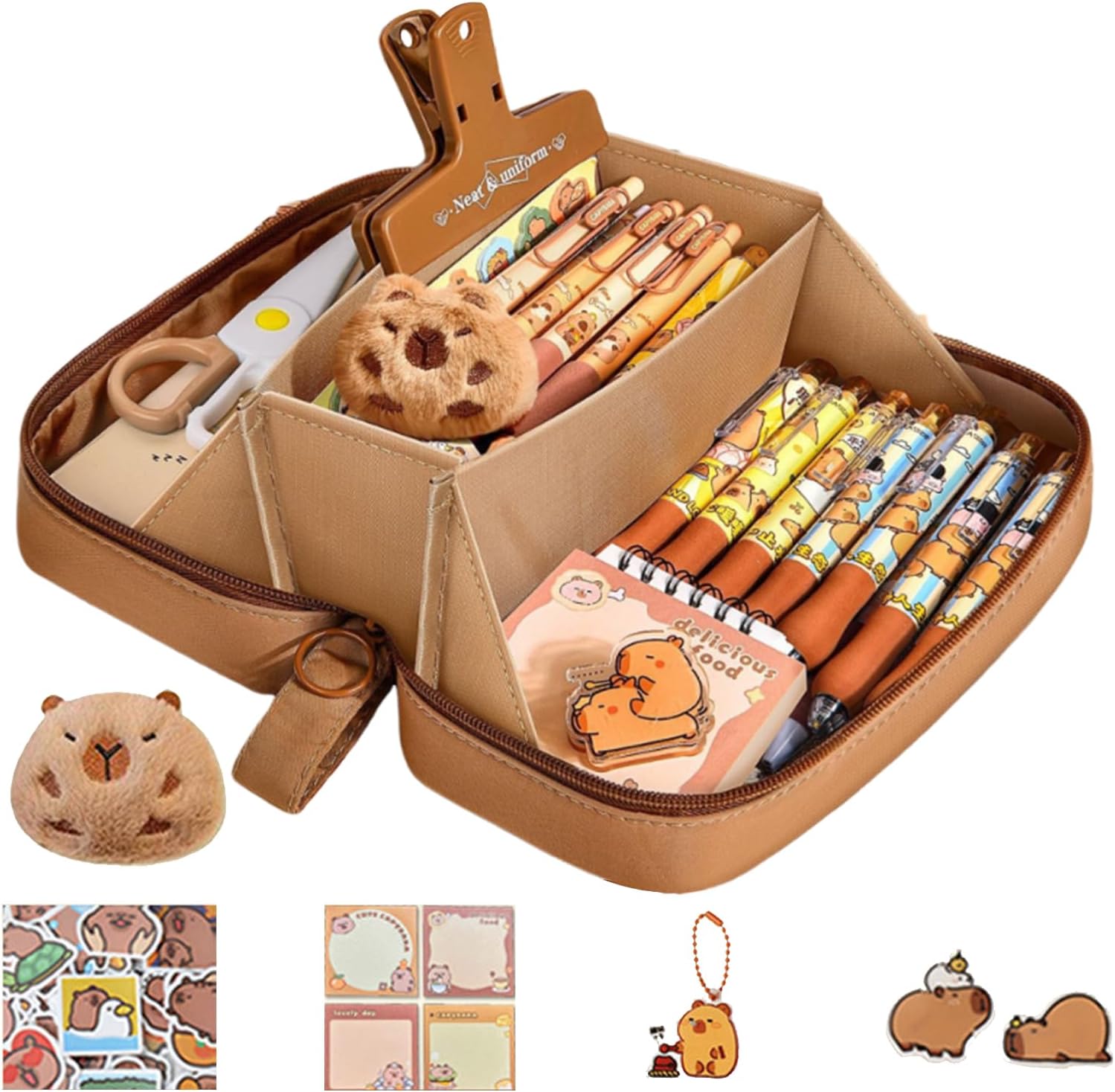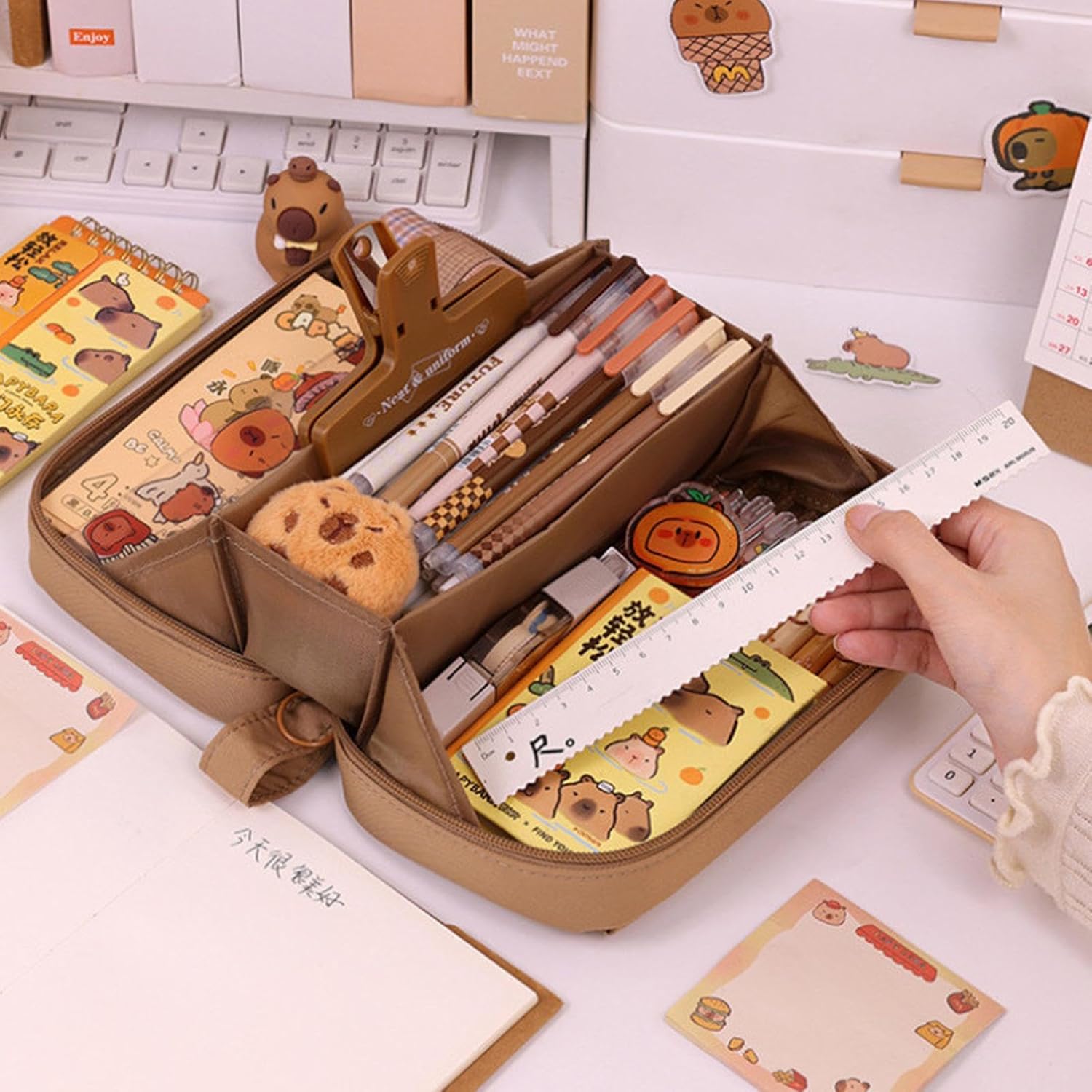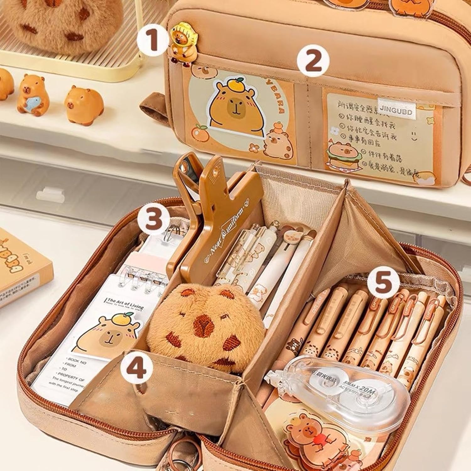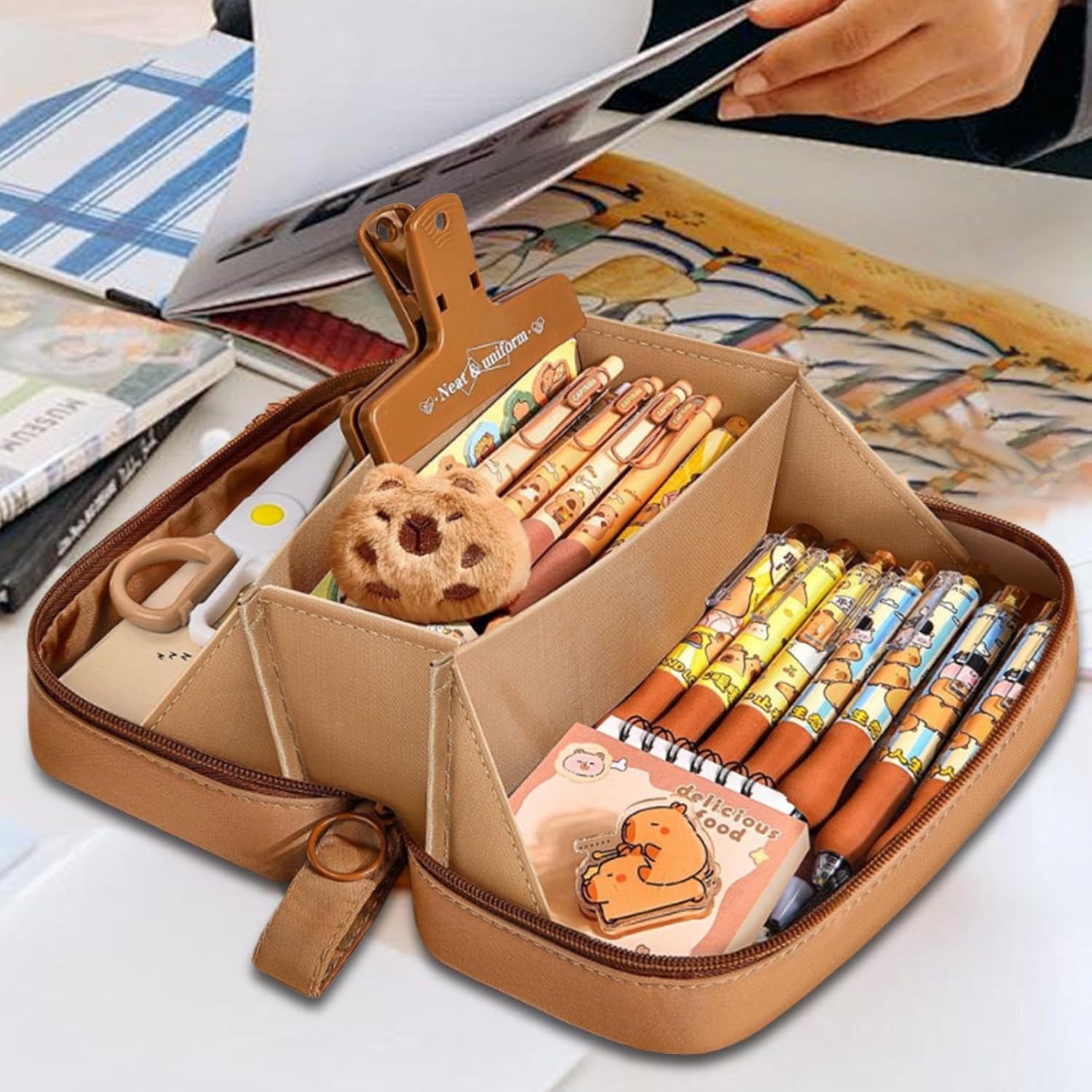 Facile da trasportare: prova la facilità ideale di organizzazione con l'astuccio Capybara. Le sue piccole dimensioni e il peso leggero lo rendono facile da trasportare, assicurandoti di poter trasportare e accedere alla tua cancelleria indispensabile ovunque tu vada Molteplici usi: dotato di ampio spazio e scomparti, l'astuccio Capybara può soddisfare le tue esigenze di trasporto all'aperto, sia al campus che in viaggio Design ad ampia apertura: adottando un design ad ampia apertura, il nostro astuccio Capybara rende l'accesso e la sistemazione dei tuoi oggetti un gioco da ragazzi. Mantieni il tuo posto di lavoro ordinato e organizzato con facilità, e tieni i tuoi oggetti indispensabili per scrivere a portata di mano ogni volta che ne hai bisogno Organizzazione efficiente: il grazioso astuccio Capybara è dotato di uno speciale scomparto per penne e una borsa trasparente, per mantenere gli oggetti in ordine Uso a lungo termine: mantieni la tua cancelleria organizzata con il nostro astuccio Capybara. La tasca interna in rete offre ulteriore spazio mentre lo strato esterno, realizzato con tessuti selezionati di alta qualità, è robusto ed elegante