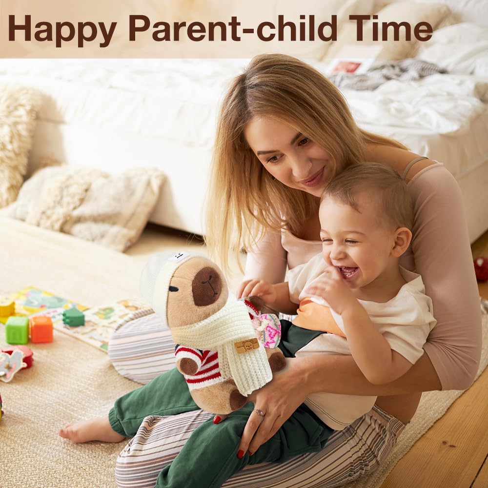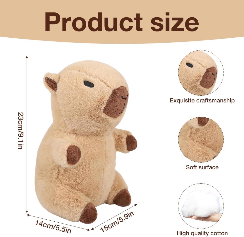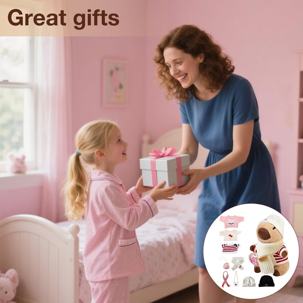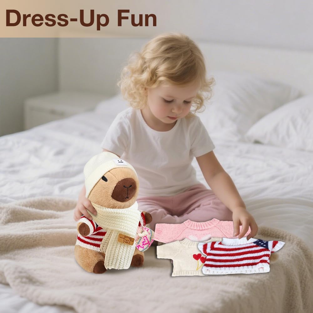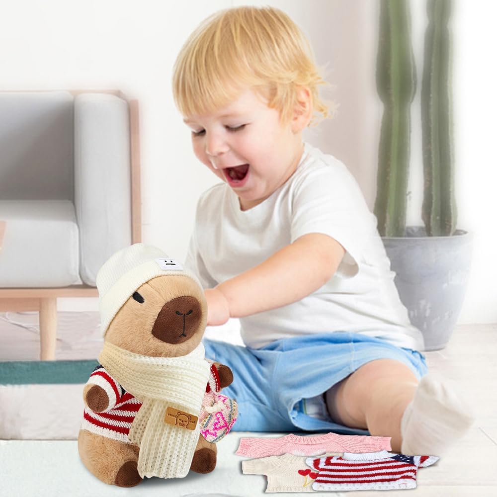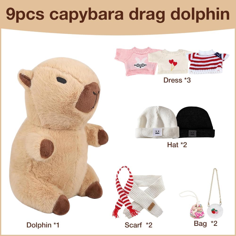[Capybara peluche] Riceverai 7 accessori, 4 indumenti, 2 tasche, 1 cappello. Questo peluche di capybara ha una forma unica e un'espressione carina. Grazie alle sue dimensioni ridotte, è facile da trasportare, quindi è un'ottima scelta per attirare i bambini. [Materiali di alta qualità] Questo peluche capybara è realizzato in tessuto di peluche ultra morbido delicato sulla pelle e sicuro ed è riempito con cotone PP sintetico con piume, delicato e confortevole al tatto, soffice ed elastico, non si deforma facilmente e offre ai bambini una piacevole esperienza tattile. [Facile da pulire] La superficie di questo simpatico capybara plushies è lavabile, può essere pulita quotidianamente o semplicemente pulita con un po' di sapone e acqua per rimuovere le macchie e poi lasciata asciugare naturalmente. Il peluche marrone capybara non si sporca facilmente e non sbiadisce dopo il lavaggio, sembra sempre come nuovo. Versatile: questo peluche a forma di maiale d'acqua è adatto per persone di tutte le età, dai bambini agli adulti, ed è molto adatto per camera da letto, soggiorno, ufficio e tutti gli altri luoghi che ti piacciono, e capybara può essere utilizzato come cuscino o decorazione per aggiungere più divertimento alla tua vita. [Regalo squisito] Con il suo design raffinato e i ricchi accessori, questo peluche capybara è un regalo perfetto per la famiglia, gli amici e i bambini, che si tratti di compleanno, Natale, giorno del Ringraziamento o altre festività speciali, l'animale di peluche di capybara può portare gioia e sorpresa.