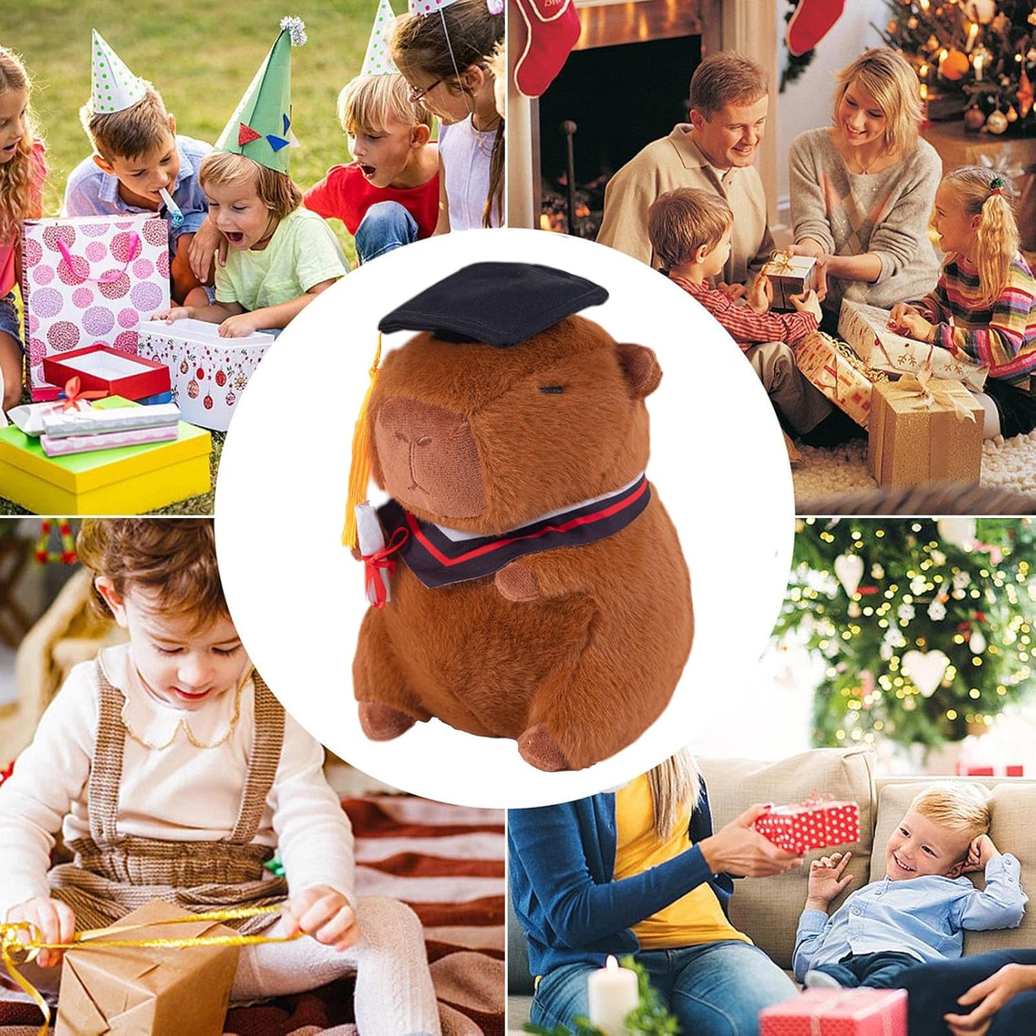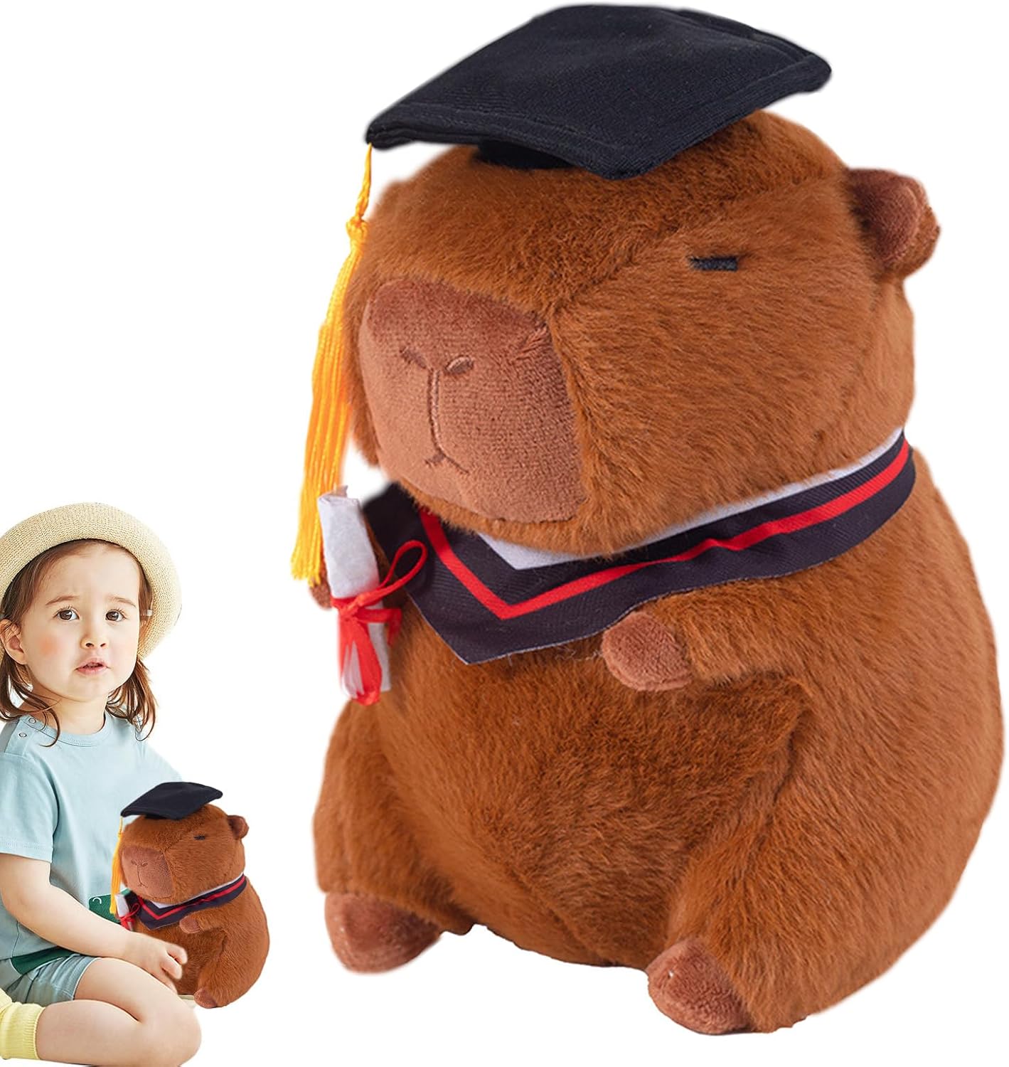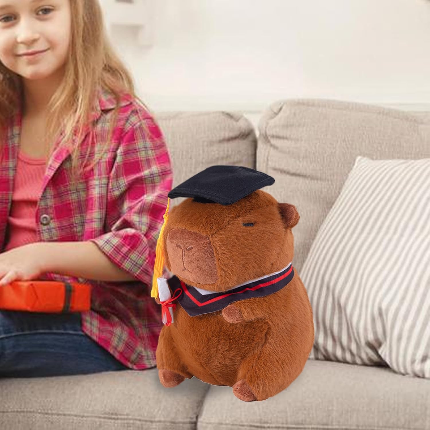 Materiale traspirante: con il suo tessuto elastico corto e lussuoso, questo peluche Capybara è morbido e accogliente e resistente alla deformazione delle coccole. Crea un luogo accogliente: usato come attraente decorazione per mobili, questo animale pieno di capybara aggiunge un po 'di divertimento, si adatta perfettamente all'estetica della tua stanza e rende la tua stanza calda e accogliente Festeggia un accademico: decorato con tappi di laurea e fondazioni accademiche, questo animale farcito a Capybara rende la vita nel campus felice e funge da prezioso simbolo di risultati accademici e La maggior parte del tempo: con il suo fascino stravagante, lo splendore di questa capybara è un'opzione divertente che renderà felice la festa dei bambini, Natale, compleanni e altre feste. Perfetto per coccolare o decorare la stanza Regalo straordinario: festeggia un momento speciale con questo divertente giocattolo Capybara di peluche.