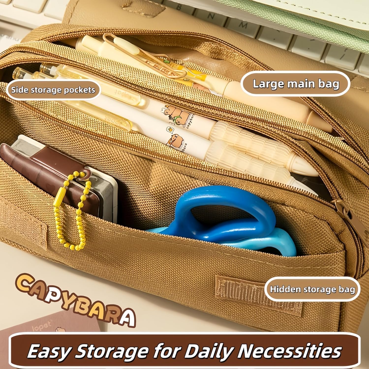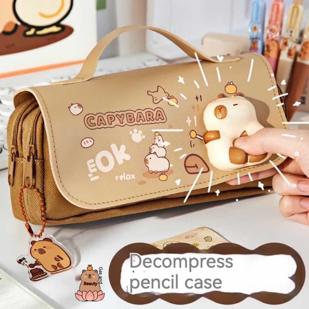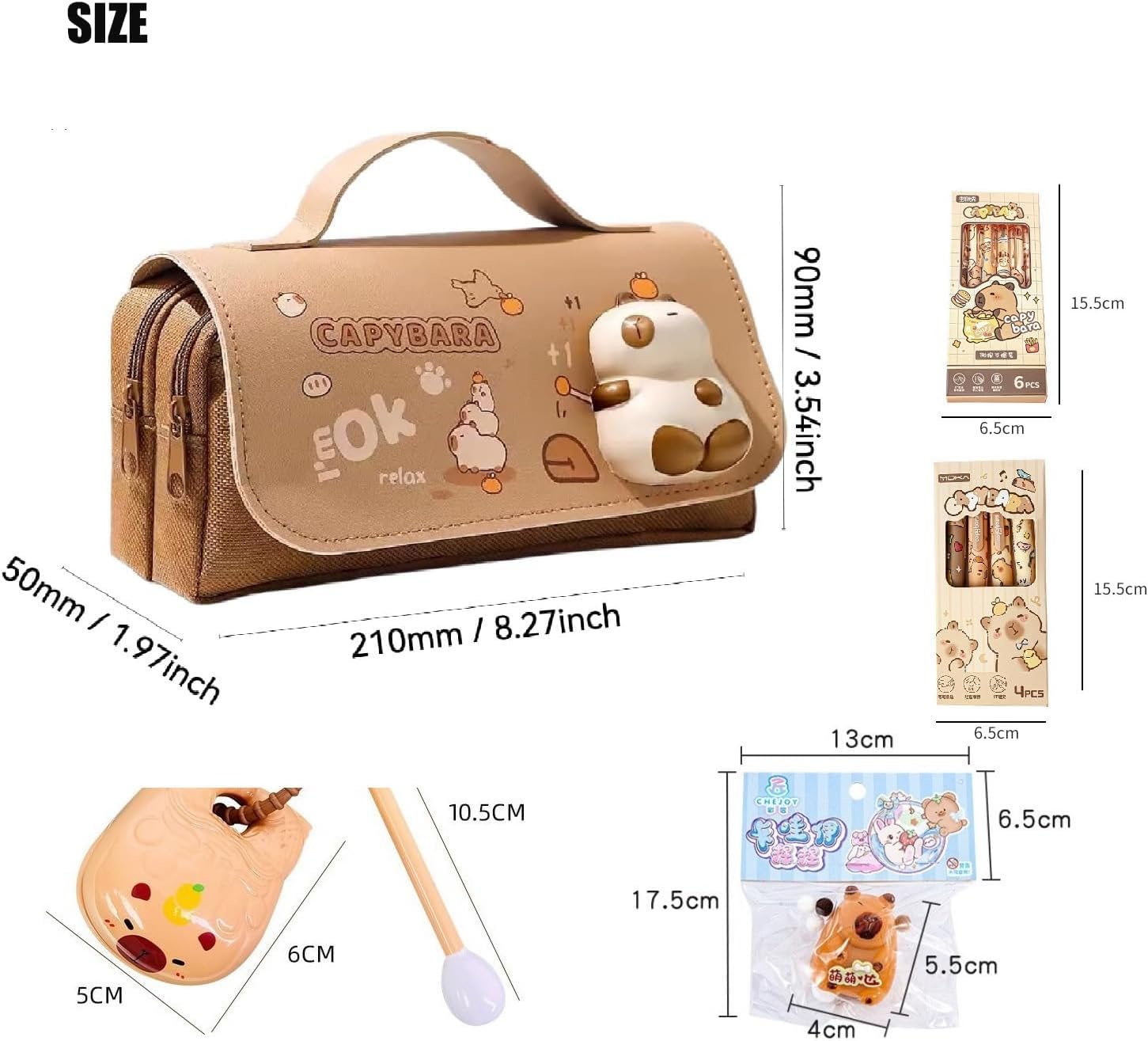 【Capybara Stationery Set】The capybara pencil case features a well-designed storage system with multiple compartments, allowing for neat organization of items and individual classification according to your needs. 【Unique Design】A cute capybara is attached to the storage box. Made of a slow-rebound sponge, it can be squeezed multiple times without deformation or damage, reducing stress during work and study. 【Premium Quality】Made of durable PVC material, the capybara bag is scratch-resistant and waterproof, offering exceptional durability and wear resistance for long-lasting daily use. 【Large-Opening Solution】Thanks to its spacious opening and smooth-running zippers, this capybara stationery set allows quick and easy access to your belongings, making everyday use more convenient. 【Ideal Gift】Our capybara stationery set is the perfect solution for keeping your pencils, rulers, erasers, and pens organized and safe. This capybara pencil case set is the perfect gift for children and friends.