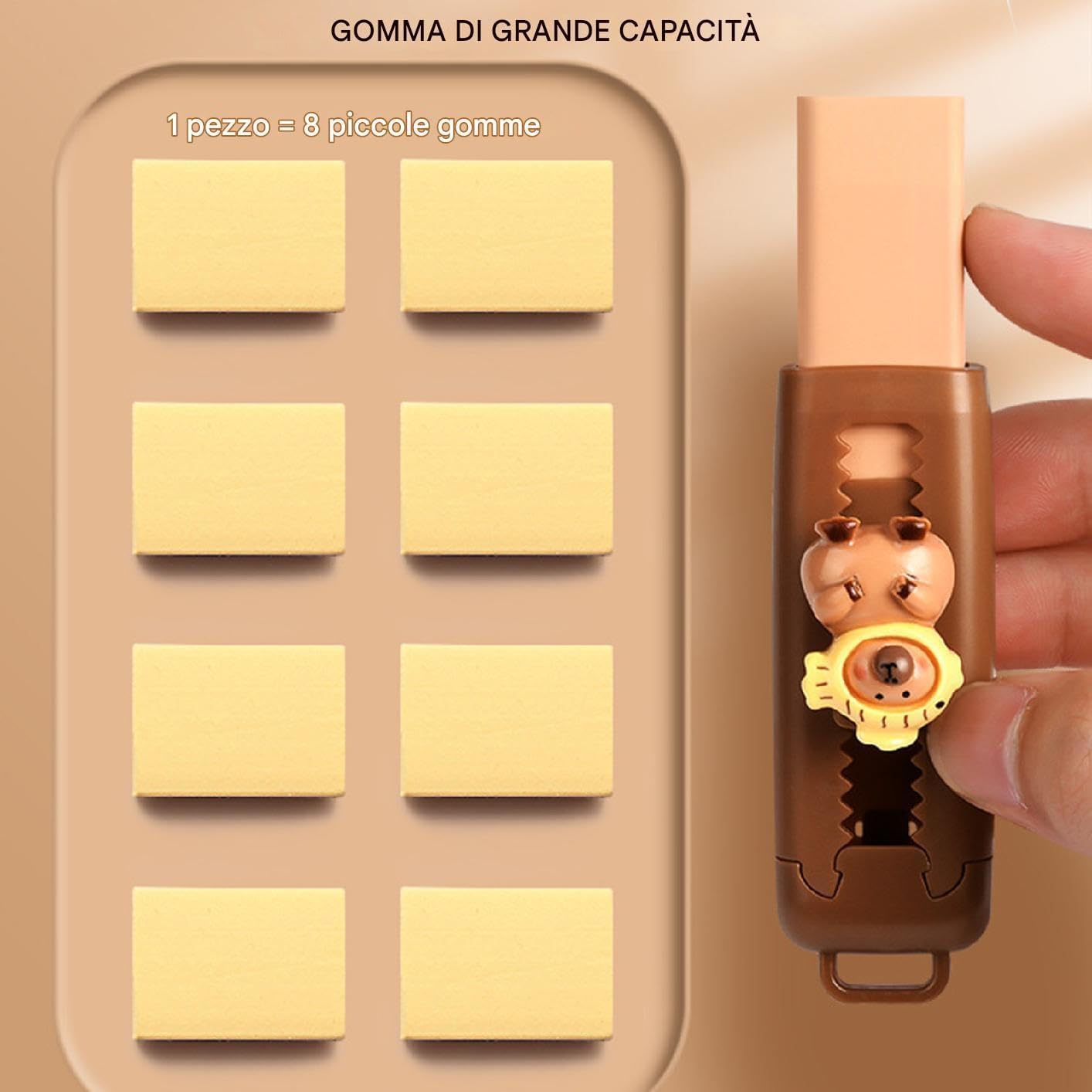 Materiali sicuri: realizzati con materiali sicuri, le nostre adorabili gomme capybara non sono facili da rompere o deformare, assicurando un uso duraturo per più divertimento. La di alta qualità fornisce una consistenza liscia e bordi rotondi per cancellatura sicura e inodore Cancella senza sforzo errori: presenta un design retrattile con un meccanismo di scorrimento, che consente di regolare facilmente la lunghezza della e spingere delicatamente per cancellare gli errori sul tuo documento con una a penna retrattile. produttivo e organizzato con questa comoda e veloce Uso diffuso: sul luogo di lavoro, nella scuola o a casa, queste simpatiche gomme Capybara sono perfette per correggere gli errori durante l'apprendimento, la pittura, lo schizzo o la stesura, rendendoli un must per chiunque voglia strumenti versatili Facile da trasportare: perfetti per le mani piccole, con il loro design portatile, possono essere facilmente messi in una borsa a penna o in una tasca e usate sempre e ovunque. Una scelta ideale per bambini e adulti, queste gomme sono piccole e leggere che li rendono facili da portare in per qualsiasi attività all'aperto Design unico: con un modello di cartone animato Capybara creativo, queste gomme vantano una forma carina e colori vivaci, progettati per portare un tocco vibrante e accattivante alla tua scrivania, migliorando il tuo mentre lavori
