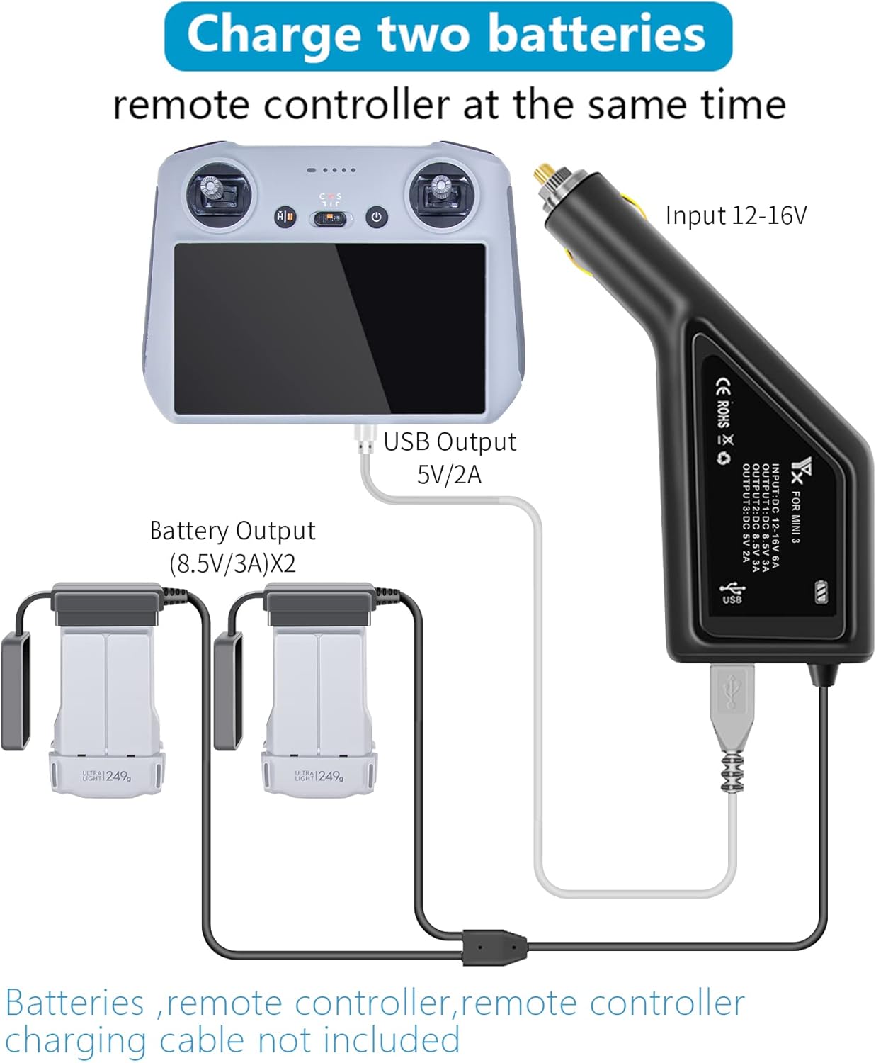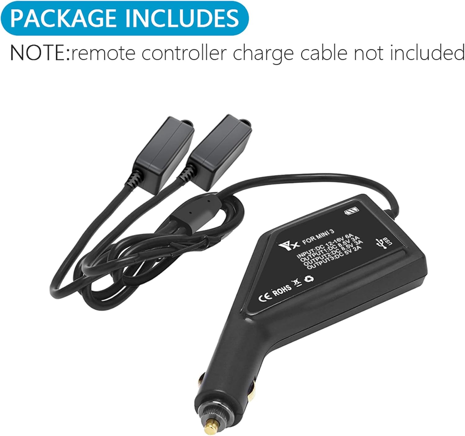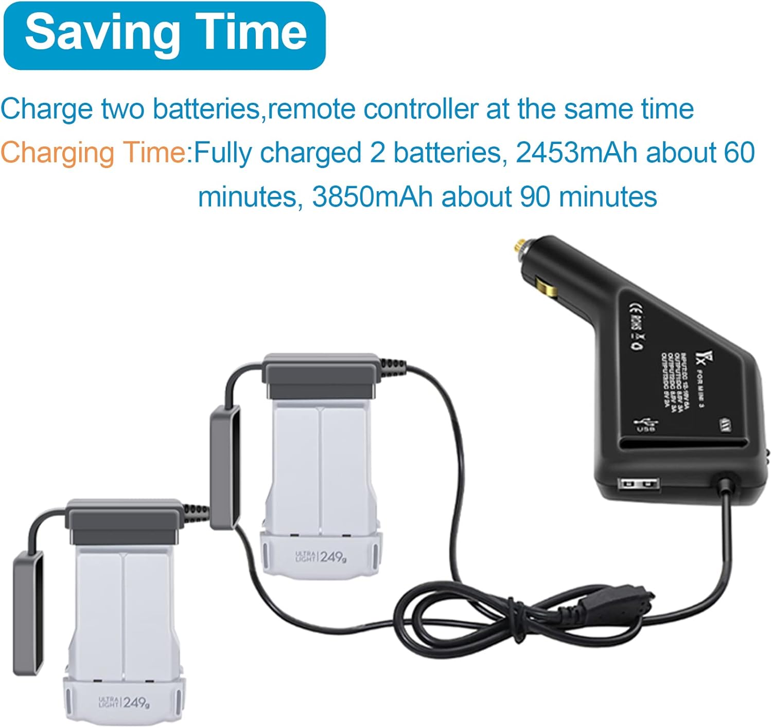 È possibile caricare 2 batterie + 1 telecomando allo stesso tempo. Il tempo di ricarica per la batteria da 2453 mAh è di circa 60 minuti e per la batteria da 3850 mAh di 90 minuti. Ricordi: non per le batterie dei droni DJI Mavic mini e mini 2. Il caricabatterie per auto viene utilizzato per caricare la batteria Smart Flight o il telecomando tramite l'accendino in auto. Temperatura di funzionamento: da 0 ° C a 40 ° C (da 32 ° a 104 ° F), ingresso DC: 12V -16V / 6A. , uscita DC: connessione batteria 8.5V / 3A; USB 5V/2A. Ha una protezione da sottotensione e da surriscaldamento che smette automaticamente di ricaricare se la tensione iniziale della batteria è troppo bassa o la presa dell'accendino supera una certa temperatura.