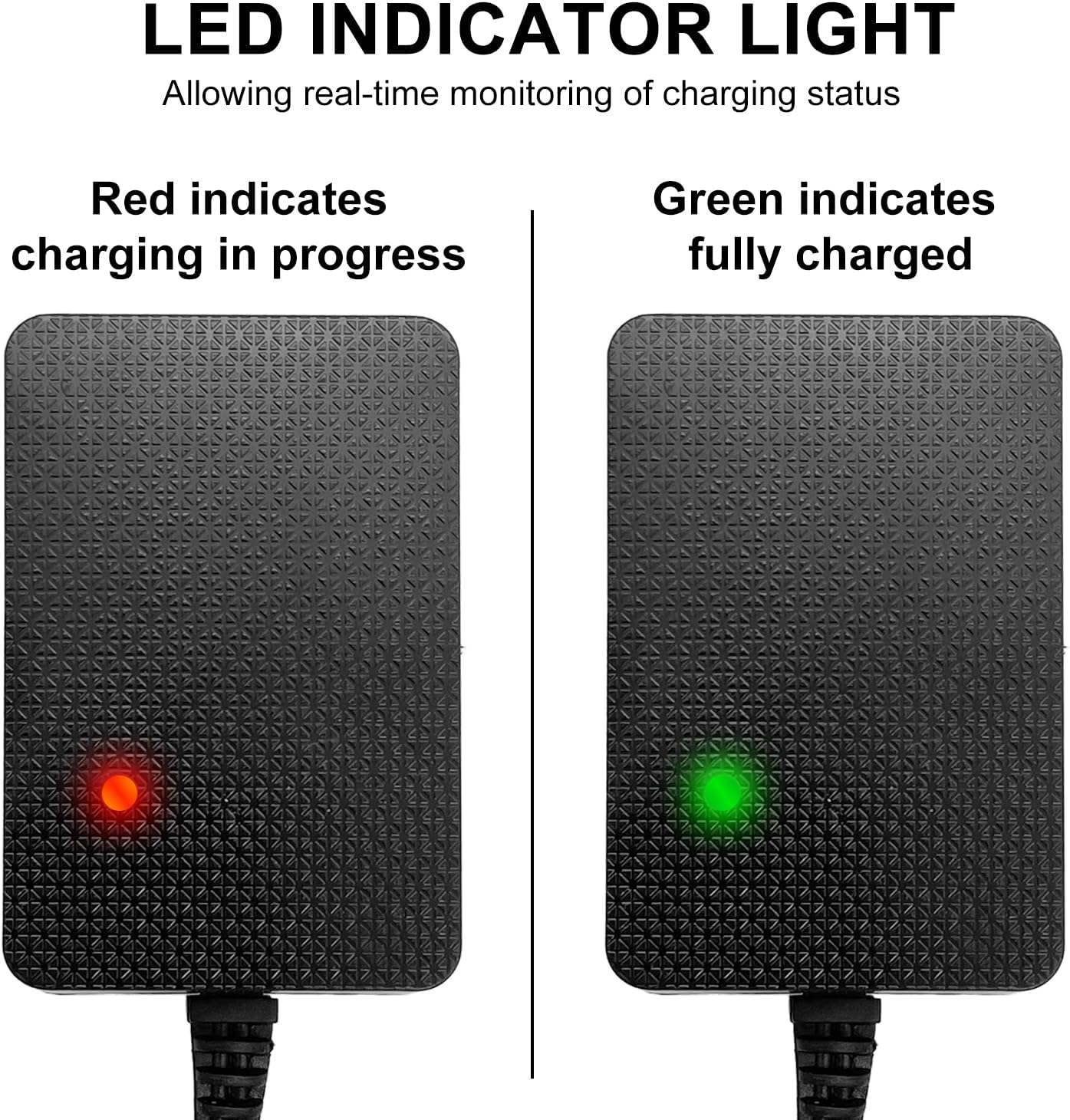 Caricatore per auto elettriche, compatibile con la maggior parte delle auto elettriche per bambini da 12 V, adatto per auto elettriche per bambini con fori di ricarica rotondi, passeggini a quattro ruote, motociclette elettriche, SUV elettrici, ATV, jeep, camion e altri modelli di giocattoli. Protezione di ricarica, chip IC intelligente integrato, che previene efficacemente sovratensione, sovracorrente, surriscaldamento e sovraccarico, fornendo una ricarica più sicura. Caricabatterie 12V, tensione di ingresso 100V-240V, universale, uscita 12V 1A, cavo di alimentazione lungo 1,5 m, flessibile e comodo da usare. Il display LED mostra lo stato di carica in tempo reale: la luce rossa indica che la ricarica è in corso, la luce verde indica che la ricarica è completa, il funzionamento è semplice ed intuitivo. Certificato ETL/CETL e testato CE/FCC, può essere rapidamente sostituito in caso di problemi di qualità. Prima di ordinare verificare se l'interfaccia/spina del dispositivo di bordo è la stessa.