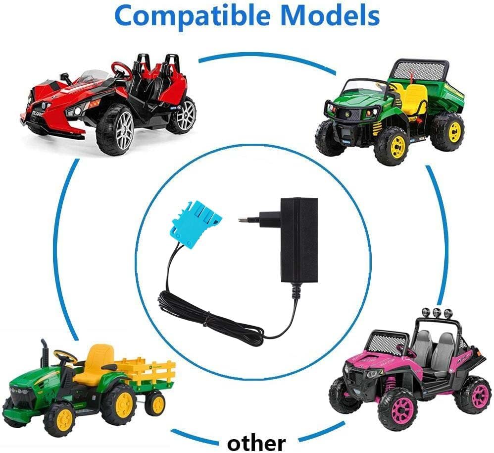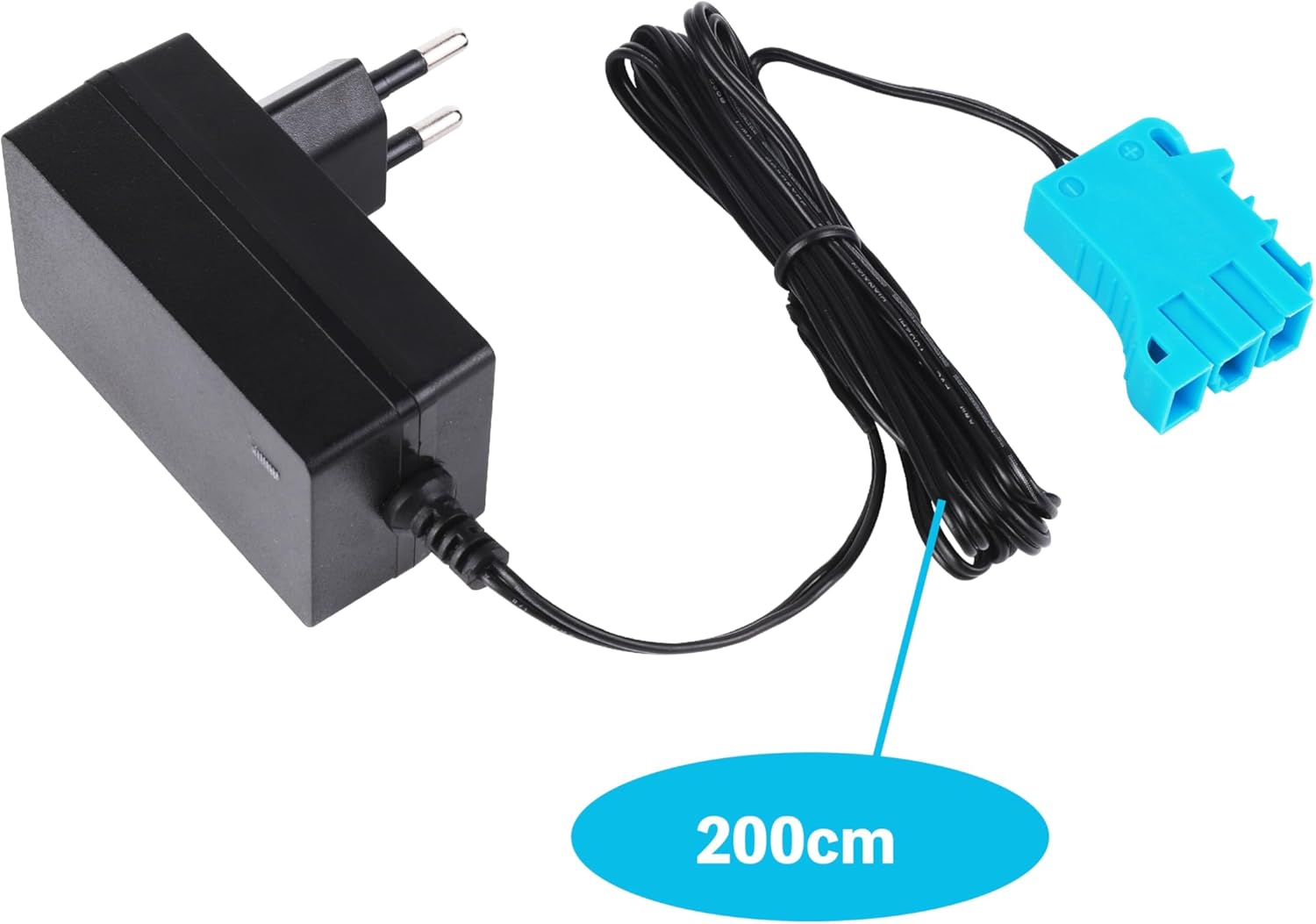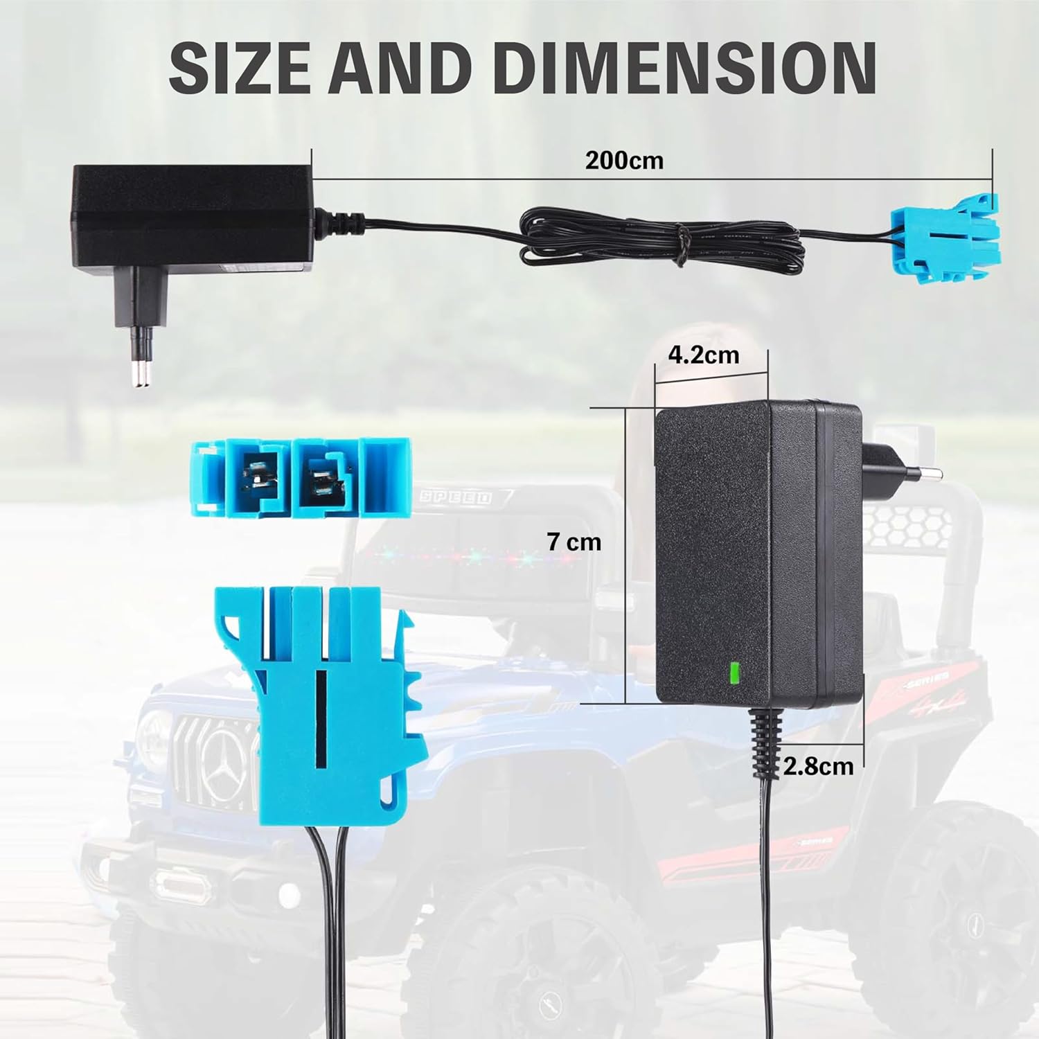 Ingresso: 100-240 VAC 50-60 Hz, Uscita: 12 V 1000 MA, lunghezza del cavo di collegamento: 2 metri. Compatibile con veicoli elettrici da 12 Volt per bambini Indicatore LED: rosso carica/verde completamente carica Caricatore universale da 12 V per bambini con spia di controllo della carica. Con una potenza di uscita di 12 V, ricarica l'auto elettrica per bambini in modo affidabile. Di norma, ci vogliono un paio d'ore per raggiungere una carica completa, e poi i bambini sono pronti per la loro prossima avventura.Anche l'operazione è semplicissima. Basta collegare il caricabatterie alla presa di corrente e l'auto e il gioco è fatto. Non ci sono impostazioni o pulsanti complicati, basta collegare e giocare.