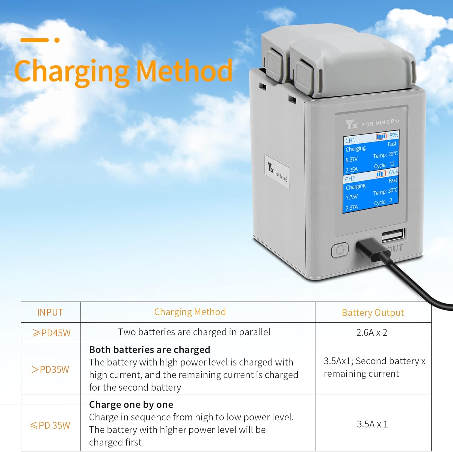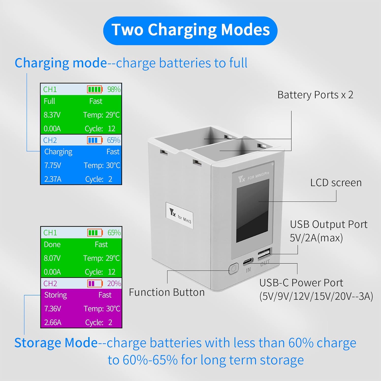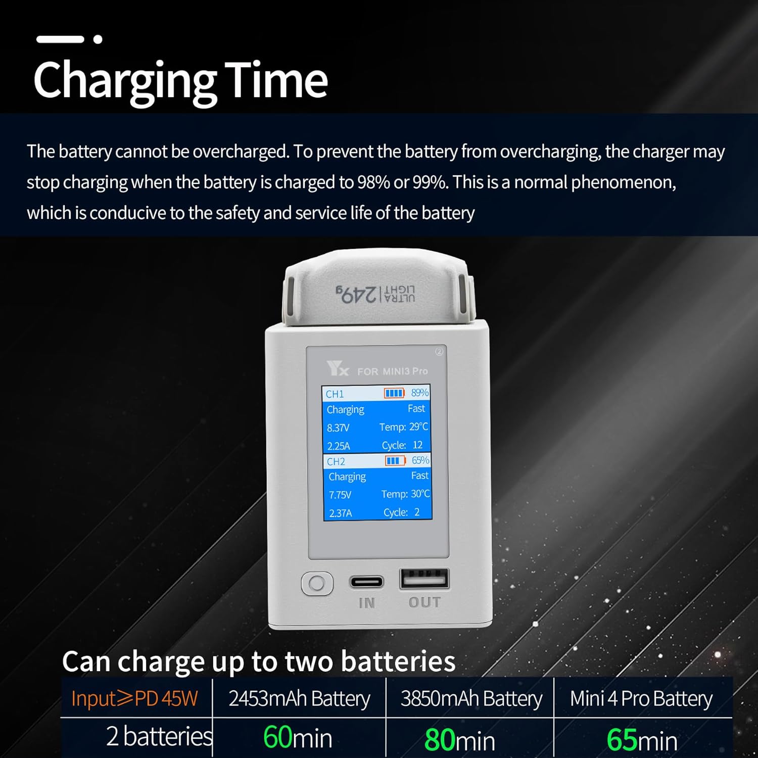 Appositamente progettato per drone DJI Mini 4 Pro, Mini 3, Mini 3 Pro batteria standard ed estensione. Ingresso (connettore di alimentazione USB-C): (5V/9V/12V/15V/20V--3A (max)),Uscita (USB): 5V/2A (MAX), uscita (2 porte batteria): 8,5 V = 5,0 A (max.) La stazione di ricarica a due vie può caricare due batterie una dopo l'altra. Può essere utilizzata anche come fonte di alimentazione mobile per caricare telecomandi o altri dispositivi USB e per riporre le batterie per un comodo trasporto Con il caricatore USB C PD da 45 W o più (non incluso) è possibile caricare una batteria da 2453 mAh in circa 60 minuti per due batterie (circa 30 minuti per batteria); carica una batteria da 3850 mAh in circa 80 minuti per due batterie (circa 40 minuti per batteria) La sicurezza è garantita. L'hub di ricarica è dotato di un chip di sicurezza intelligente ad alta tecnologia che può sempre rilevare lo stato dell'hub e della batteria. In questo modo la stazione di ricarica può raggiungere la protezione da surriscaldamento, protezione da sovraccarico, protezione del circuito, è possibile riposare il cuore durante la ricarica La ricarica a due vie può controllare il livello della batteria. Lo stato di carica della batteria può essere letto esattamente tramite il display digitale. Contenuto della confezione: 1 x Mini 3 Pro schermo a colori caricabatterie a due vie, 1 x cavo di ricarica USB-A a USB-C, 1 x cavo di ricarica USB-C a USB-C