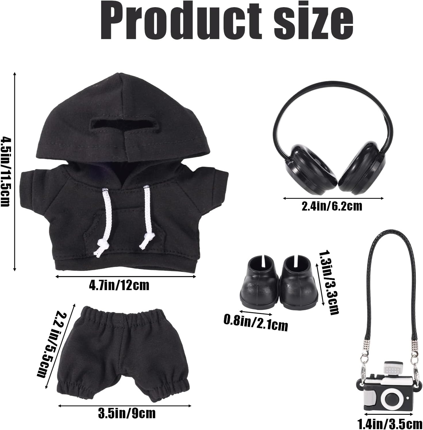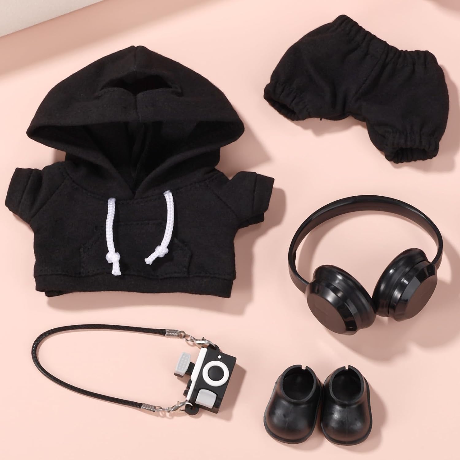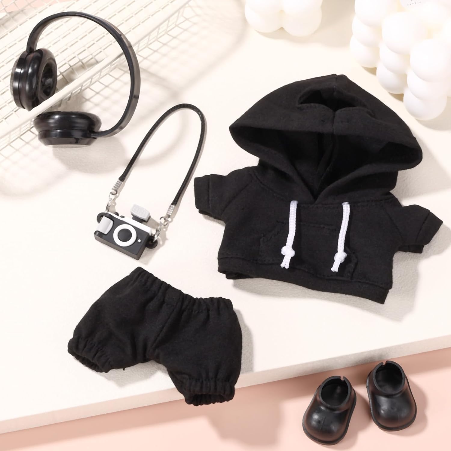 Contenuto del pacchetto: otterrai 1 felpa con cappuccio nero, 1 paio di pantaloni, 1 fotocamera in miniatura, 1 paio di scarpe e 1 paio di cuffie. Un outfit versatile impostato per migliorare lo stile e il display delle bambole. Materiali Durevoli: Realizzati In Cotone, La Felpa E I Pantaloni Sono Morbidi E Comodi Da Indossare, Mentre Gli Accessori Sono In Plastica, Resistenti E Durevoli. Dimensione del prodotto: felpa con cappuccio di circa 12x11,5 cm, pantaloni circa 9x5,5 cm, scarpe circa 2,1x3,3 cm, fotocamera circa 3,5 cm, cuffie circa 6,2 cm. Adatto a bambole e facili da conservare. Elegante design nero: il vestito con cappuccio casual completamente nero abbinato agli accessori crea un look moderno e giocoso, rendendo le bambole più attraenti per la fotografia e la collezione. Ampie applicazioni: perfetto per la fotografia delle bambole, la visualizzazione creativa e le collezioni personali. Una scelta regalo premurosa per appassionati di bambole, hobbisti e collezionisti.