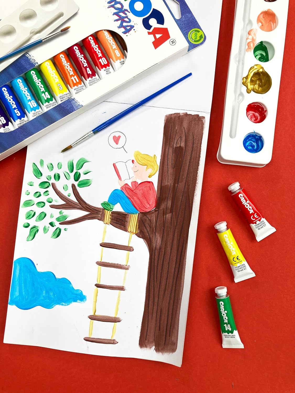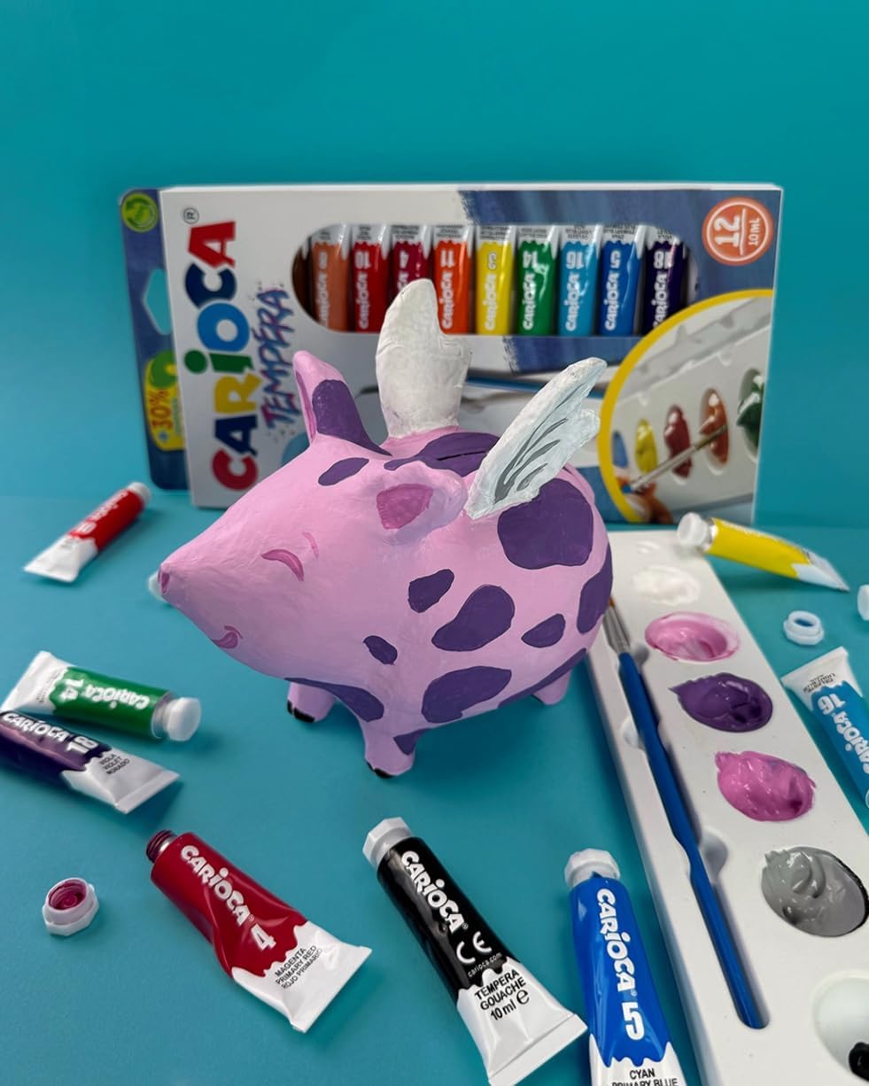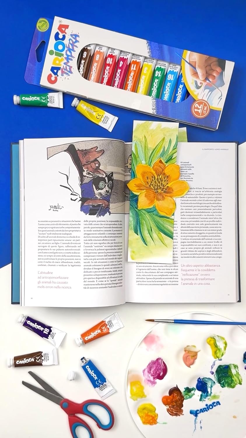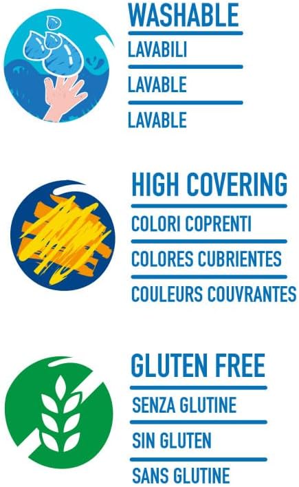Set di 12 tubetti di tempera pronta di 12 ml Colori superlavabili, miscelabili tra di loro Si applica su tutti i materiali porosi Alta coprenza Packaging 100% riciclabile