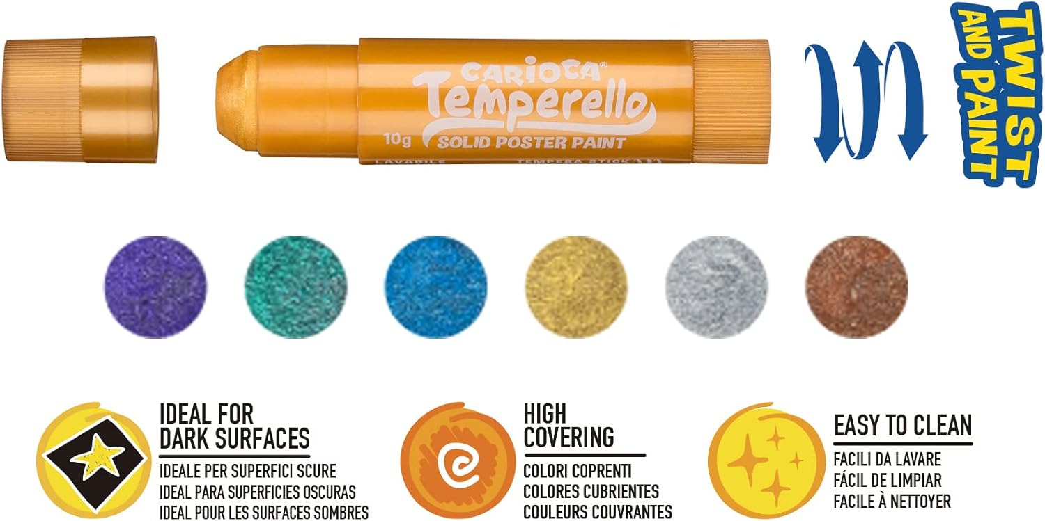 Contenuto: La confezione contiene 24 tempere solide per bambini super lavabili in formato stick, di cui 12 Temperello Classic, 6 Temperello Metallic e 6 Temperello Neon Temperello: Un set di tempere con colori assortiti, brillanti, super lavabili, ad alta coprenza e mischiabili tra loro, ideali su carta, cartoncino, cartone e legno Multieffetto: premi leggermente la punta per un effetto pastello a cera, premi più forte per ottenere un effetto tempera Consigli: Adatto per bambini di qualsiasi età, da usare a scuola e nel tempo libero per stimolare la creatività dei bambini Extra: Tempere senza solventi, asciugano rapidamente senza ondulare la carta, finitura satinata che non necessita di vernice protettiva