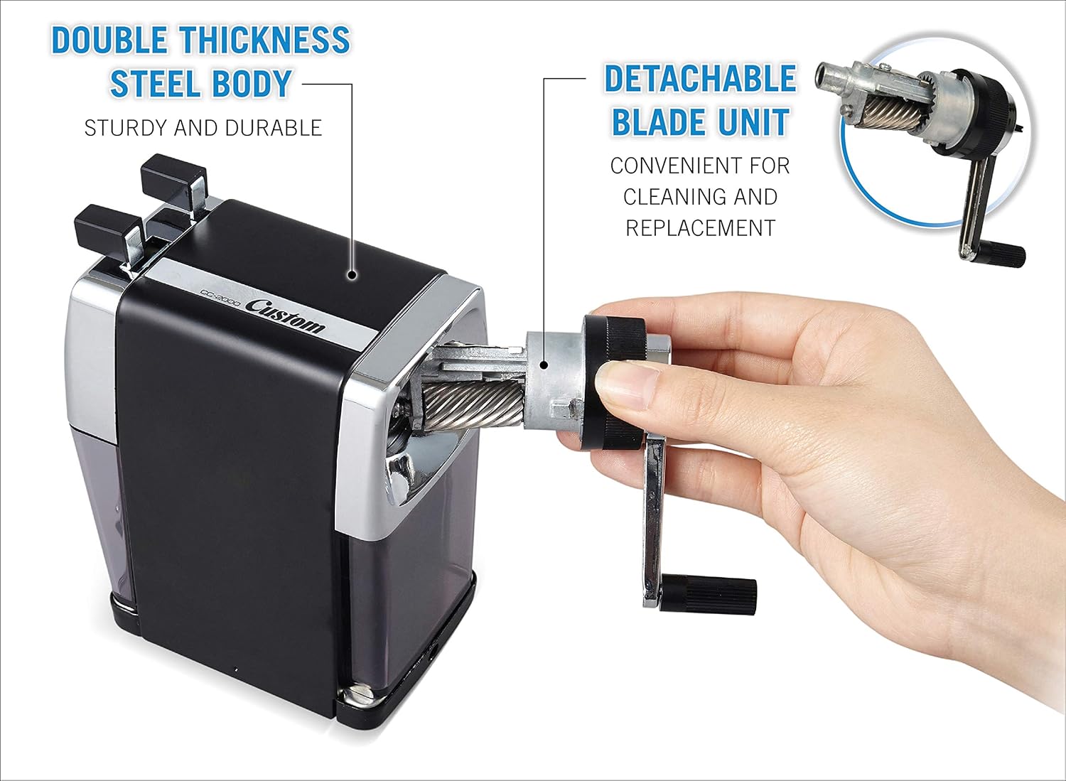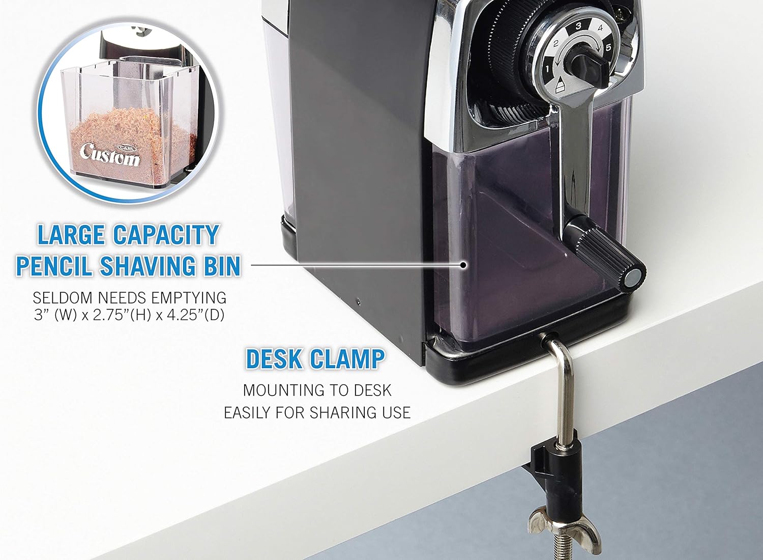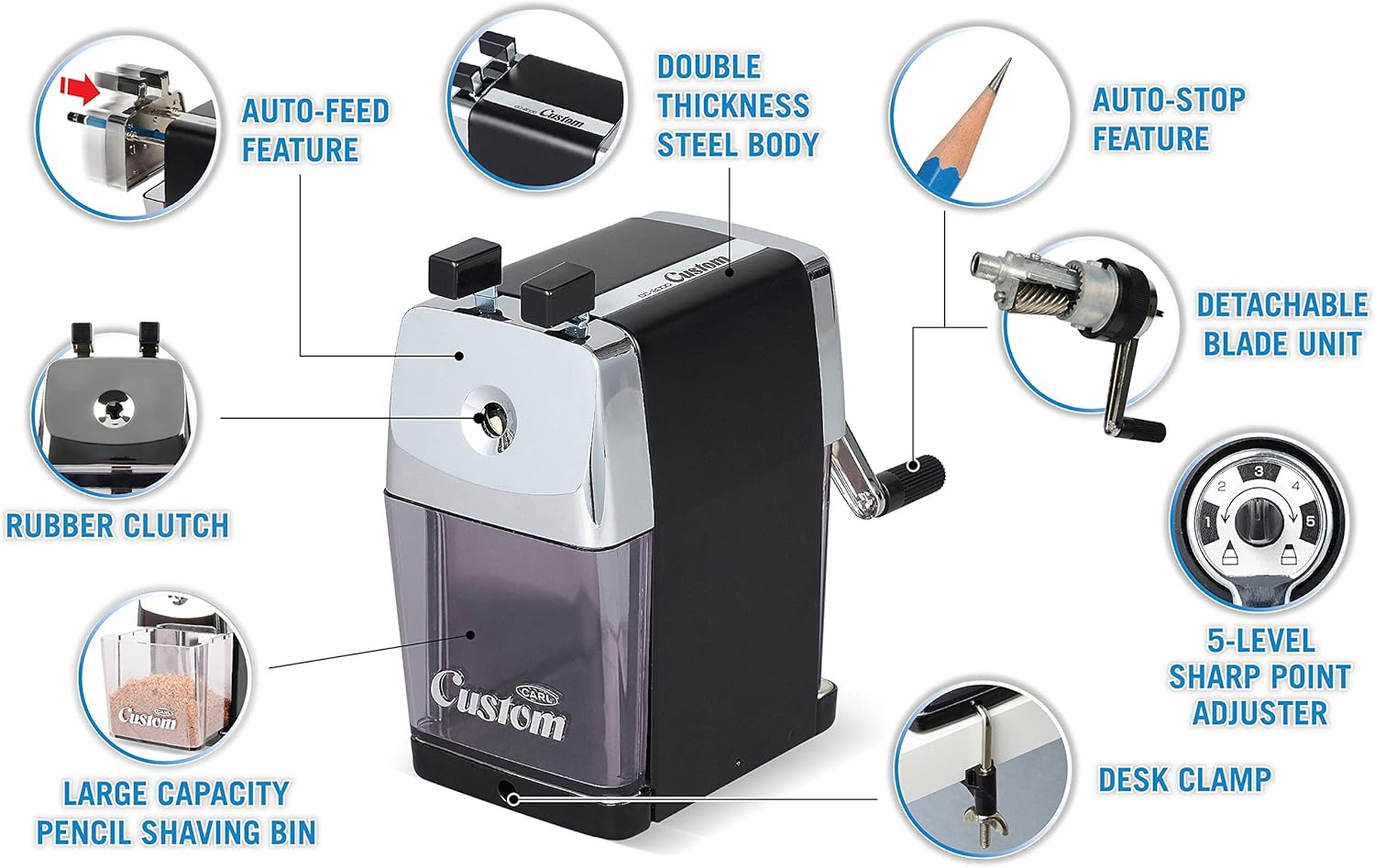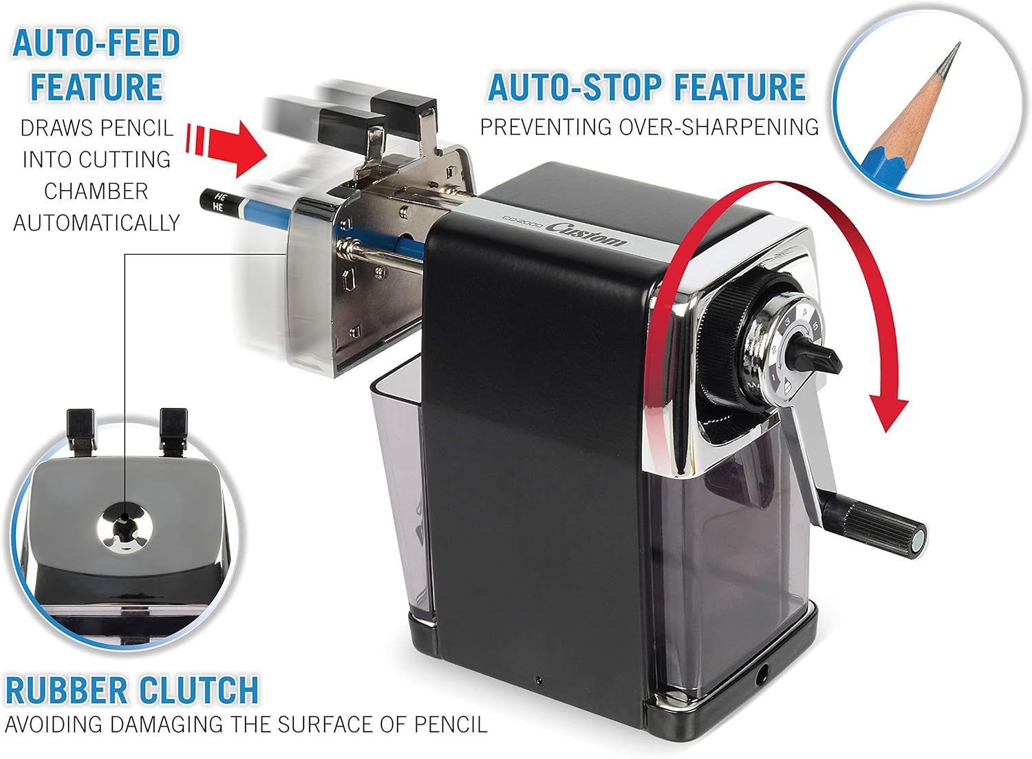 Scegli da una punta molto affilata a una punta smussata con selettore personalizzato a 5 punti Meccanismo di affilatura durevole in acciaio Tira automaticamente la matita nella camera di taglio e previene l'affilatura eccessiva Morsetto da tavolo incluso Vassoio rimovibile per rimuovere i trucioli per un facile svuotamento