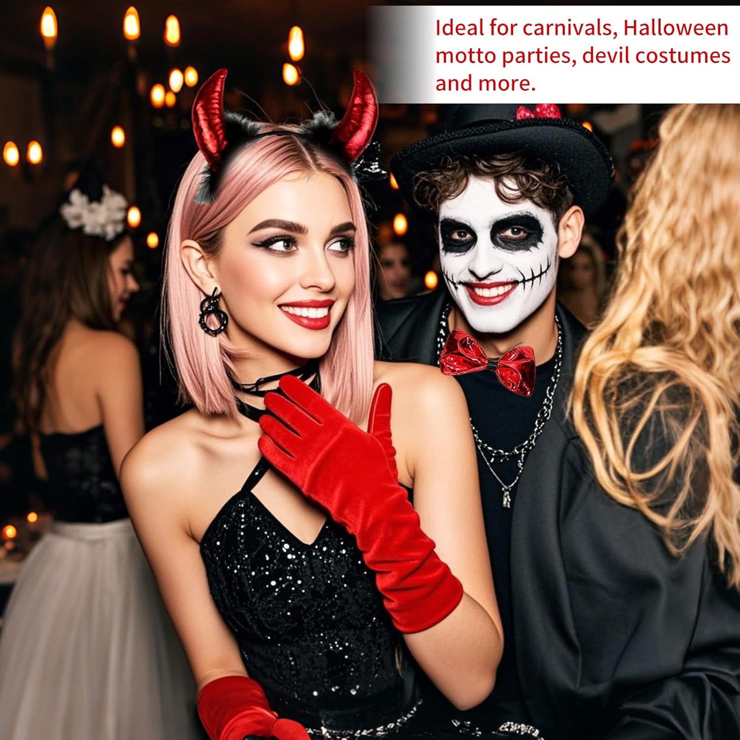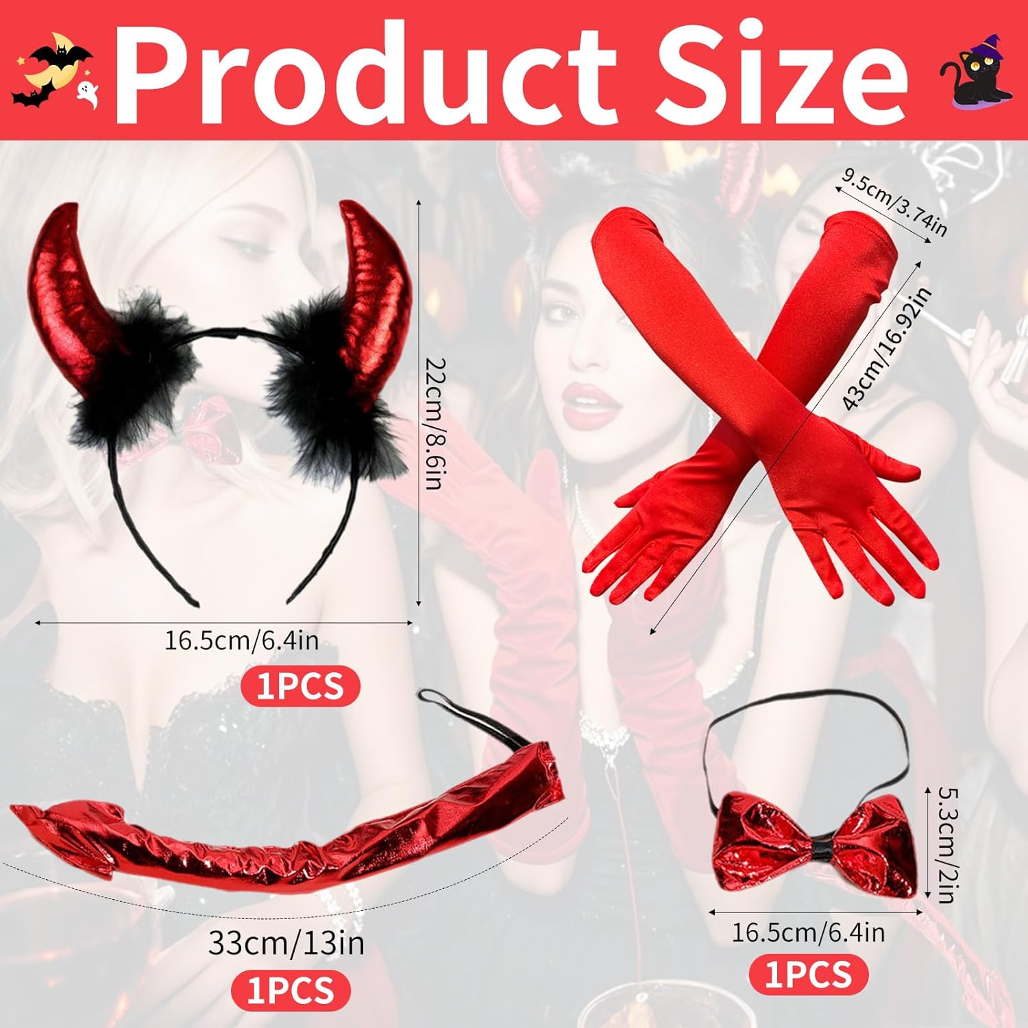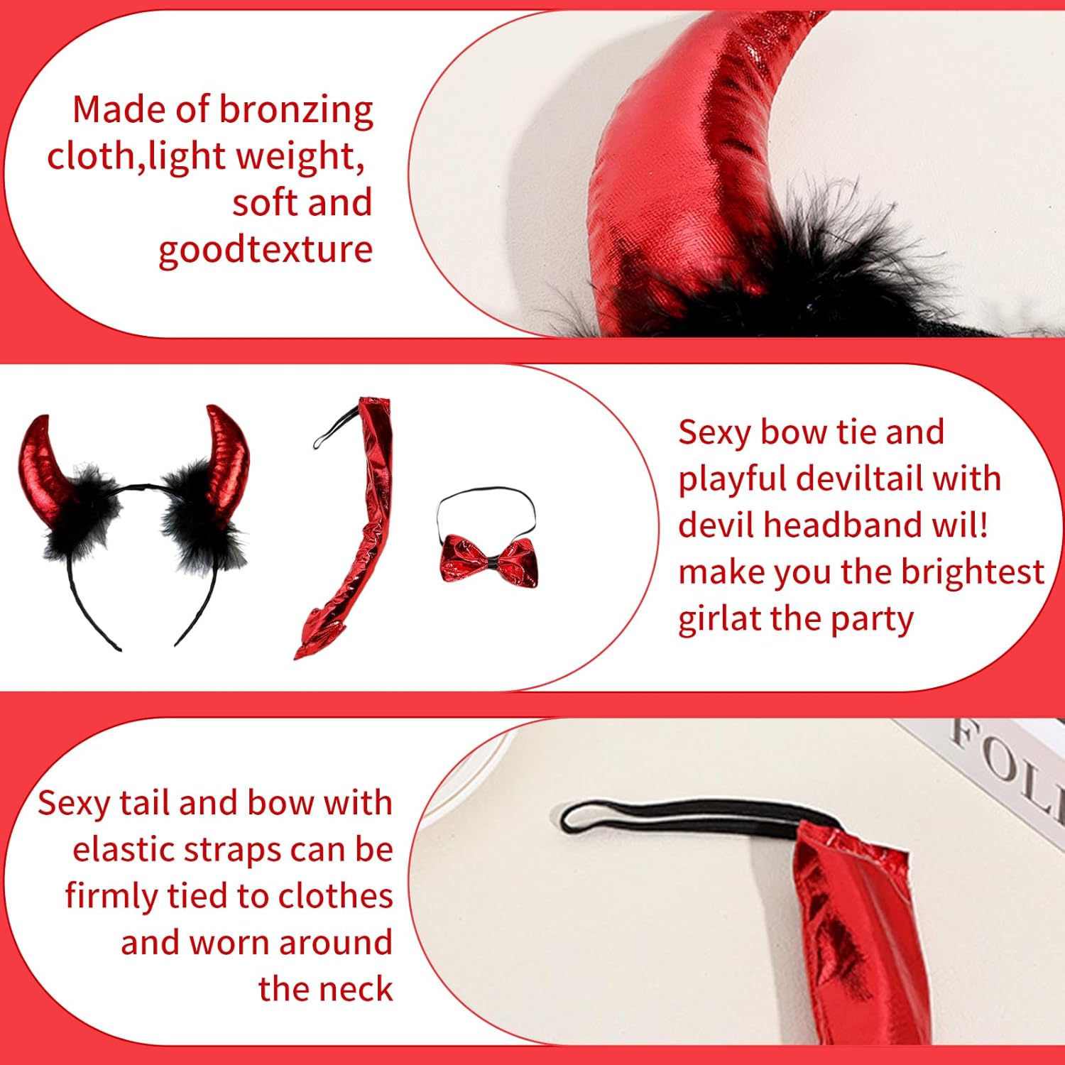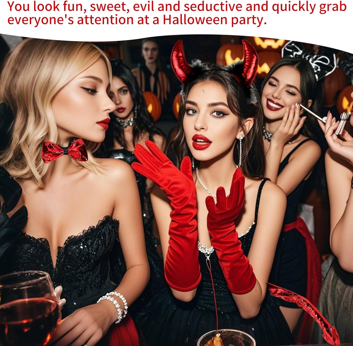4-teiliges Set für Halloween: Diese Teufels-Kostümsammlung enthält alles, was du für deinen perfekten Auftritt brauchst – 1 Teufelshörner Haarband, 1 Teufels-Halsband, 1 Teufelsschwanz und 1 Paar rote Satin-Handschuhe. Die perfekte Wahl für jedes Halloween-Event. Hohe Qualität: Hergestellt aus hochwertigem, weichem Plüsch und Polyester, bietet dieses Set eine angenehme Trageerfahrung. Die Materialien sind langlebig, pflegeleicht und wiederverwendbar, ideal für jedes Jahr. Einheitsgröße für Kinder und Erwachsene: Das Teufels-Haarband ist dehnbar und passt sich verschiedenen Kopfgrößen an. Auch das Halsband und der Schwanz verfügen über einen elastischen Riemen, sodass sie sowohl von Kindern als auch von Erwachsenen problemlos getragen werden können. Verführerisches Design: Mit den verspielten Teufelsohren, dem roten Schwanz und dem passenden roten Halsband wirst du sowohl niedlich als auch böse wirken. Der Look ist nicht nur auffällig, sondern auch eine perfekte Mischung aus Spaß und Mystik. Perfekt für Halloween und Karneval: Diese Teufels-Kostümausstattung eignet sich hervorragend für Halloween-Partys, Karnevalsveranstaltungen und andere Kostümfeiern. Mit diesem Set ziehst du garantiert alle Blicke auf dich.