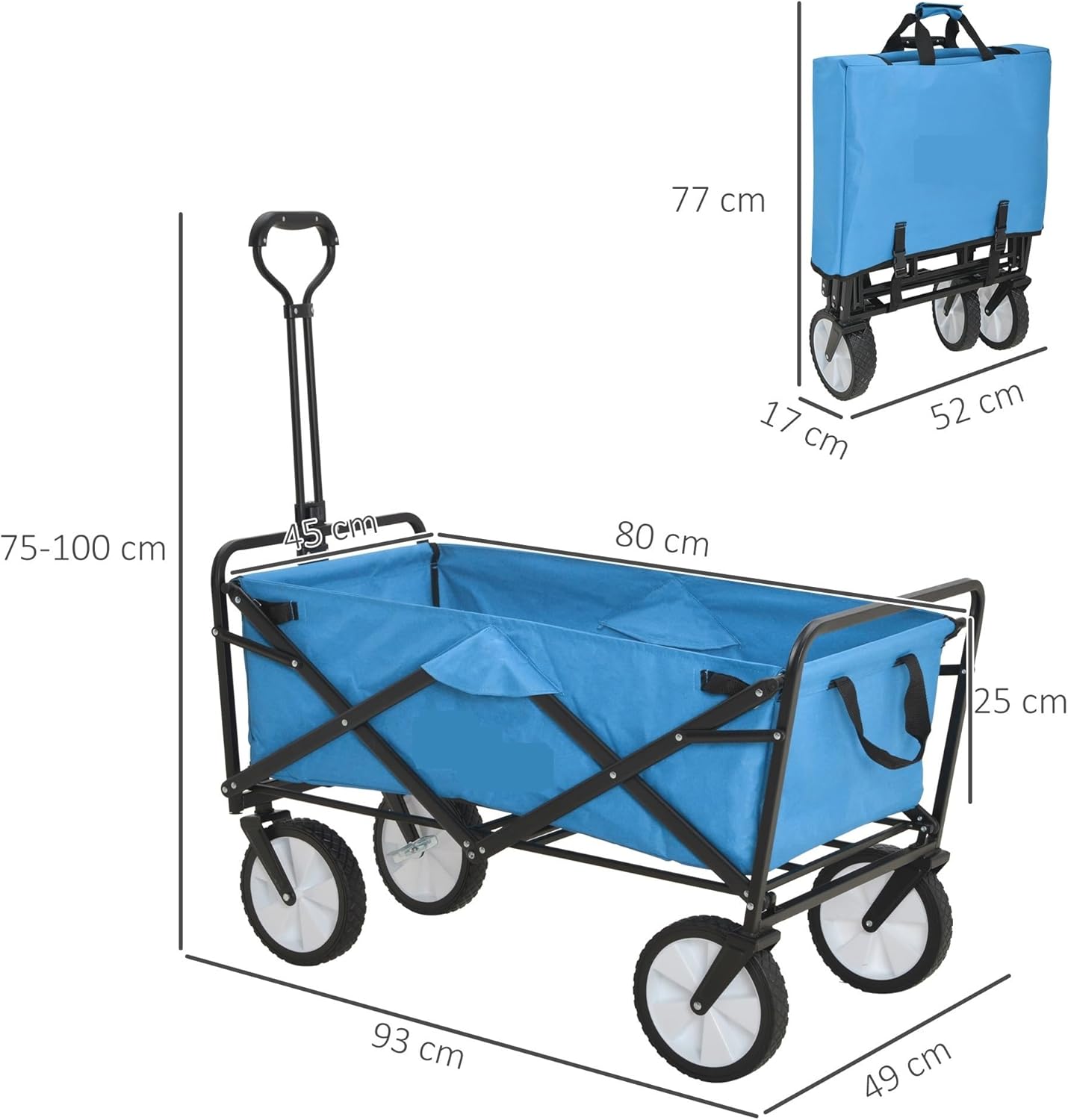 Design versatile: il carrello da campeggio pieghevole è progettato per varie attività all'aperto come campeggio, picnic, gite in spiaggia e giardinaggio. Grazie agli interni spaziosi, puoi trasportare facilmente tutte le tue cose importanti. Facile da riporre e trasportare: questo carrello si ripiega comodamente fino a raggiungere dimensioni compatte per riporlo facilmente nel bagagliaio o nell'armadio. La sua struttura leggera lo rende facile da trasportare, così puoi portarlo ovunque. Costruzione robusta: Realizzato con materiali durevoli, il camper pieghevole può trasportare carichi pesanti, assicurando che possa trasportare di tutto, da frigoriferi e sedie all'attrezzatura sportiva senza compromettere la stabilità Caratteristiche facili da usare: Dotato di maniglie regolabili per un comodo traino e ruote scorrevoli che navigano su varie superfici, questo carrello è progettato per un facile utilizzo, rendendo le tue avventure all'aria aperta senza problemi Tanto spazio: Grazie alla generosa capacità di carico, il carrello offre molto spazio per la tua attrezzatura, generi alimentari o giocattoli per bambini. Grazie al design accurato, tutto rimane organizzato e facilmente accessibile durante i tuoi viaggi.