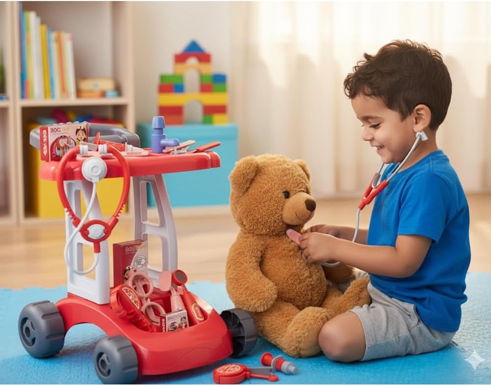 Carrello giocattolo per bimbo dotato di ripiani e vani porta oggetti per riporvi gli accessori inclusi nella confezione, come: stetoscopio, siringa, forbici, ecc.. Tipo di prodotto: carrello giocattolo Dimensioni: 37x37x31 cm Materiale: plastica Età consigliata: 3+