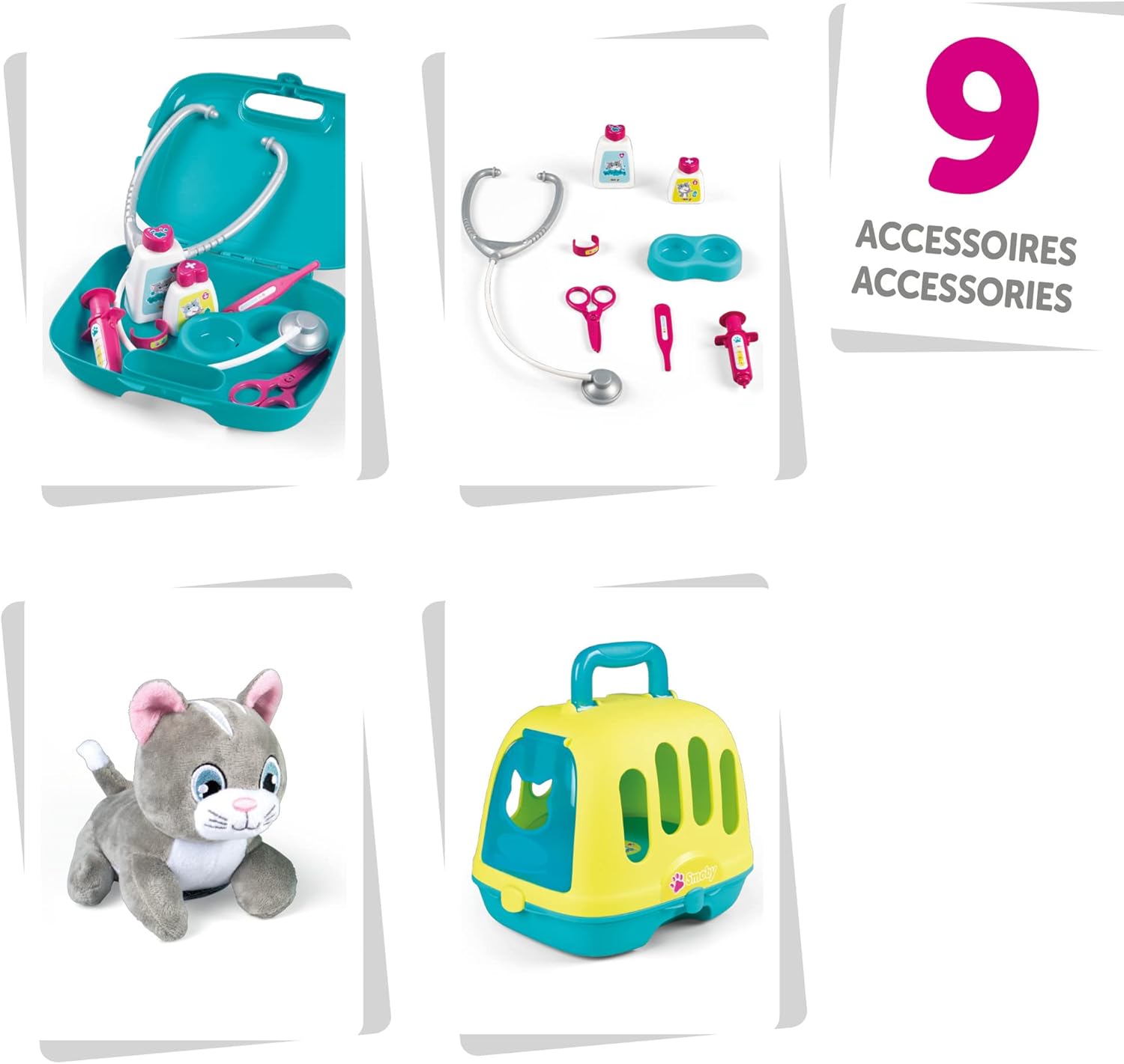 Clinica veterinaria su ruote - Il peluche preferito ha bisogno di aiuto medico? Con il set per veterinari arrotolabile (31 x 32 x 55 cm) i giovani veterinari e veterinari a partire dai 3 anni saranno rapidamente sul luogo di utilizzo Valigia mobile: la valigetta per giocattoli rimovibile è riempita con tutto il necessario per trattare gli amici a quattro zampe: stetoscopio, siringa, forbici, termometro, ciotola e molto altro ancora. Con gattino e trasportino – La valigetta del medico si trasforma in pochi gesti in una scatola per il trasporto. Nel set è incluso anche un gattino grigio da coccolare, coccolare e curare. Giocattolo adatto ai bambini: il set colorato di dottori per animali è stato prodotto in Francia e stimola i bambini e i bambini a giocare di ruolo creativo, che stimola le capacità motorie e sociali. Smoby Qualità dal 1924: grazie ai costanti controlli di qualità, alla lunga esperienza, all'uso di materiali di alta qualità e ai più moderni impianti di produzione, garantiamo giocattoli sicuri.