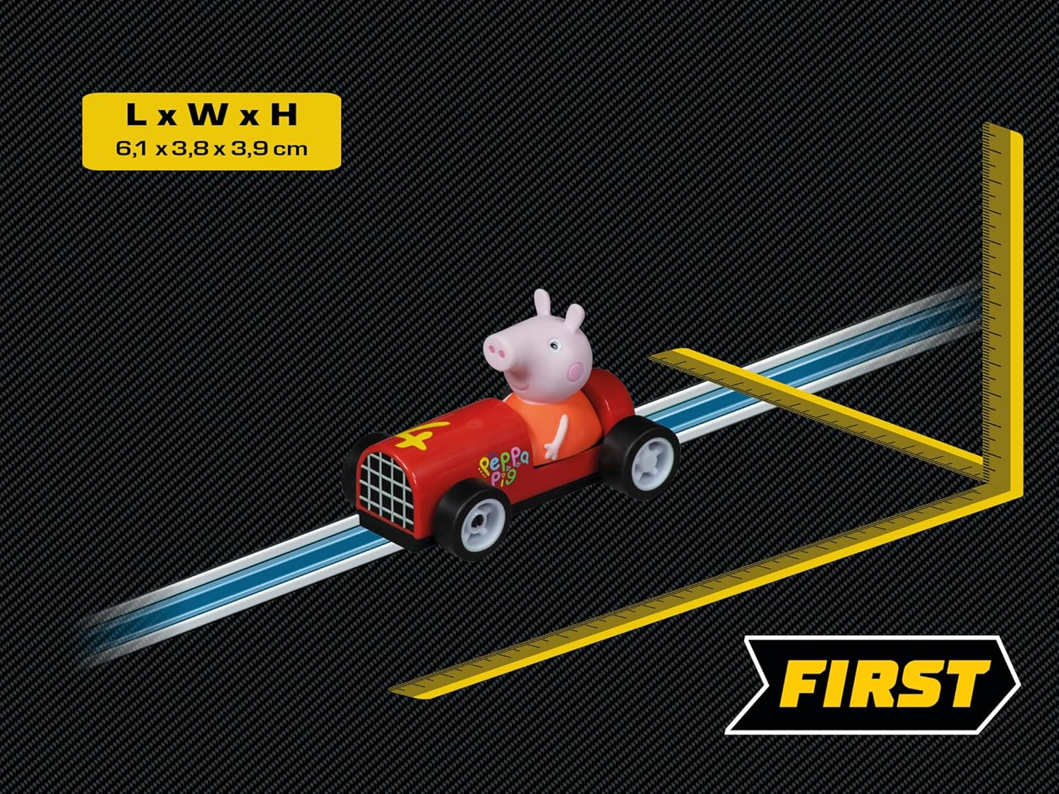 Nella sua soapbox la bambina maialina Peppa sfreccia attraverso il fairway Carrera simile a un fulmine. Su una scala di 1:50 la simpatica slot car Carrera FIRST con la licenza popolare fornisce anche il più piccolo per le luci negli occhi. Insieme ai loro eroi della serie i bambini dall'età di 3 anni si godono ore di divertimento. 0 0 0