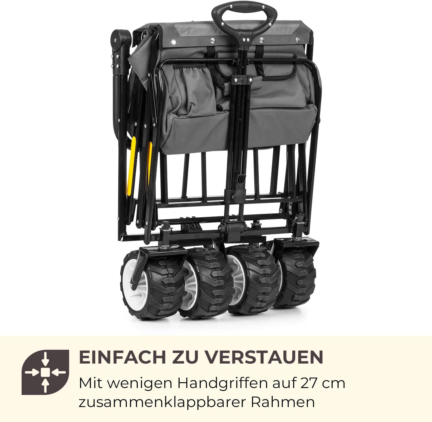 EXTRA SICURO: i freni, le due cinture di sicurezza interne e i catarifrangenti all'esterno dell'auto garantiscono una maggiore sicurezza, cosa particolarmente importante quando si trasportano bambini. Grazie alla base imbottita si ottiene un elevato comfort di seduta. PNEUMATICI EXTRA LARGI: la nuova edizione delle ruote in plastica extra larghe, spesse 10 cm, può essere utilizzata su quasi tutte le superfici. Il profilo delle ruote fornisce facilmente il supporto necessario. Questo rende anche il percorso attraverso le dune sabbiose un gioco da ragazzi. PIEGHEVOLE: il carretto Easy Rider è adatto a tutte le piccole e grandi avventure. Che tu stia passeggiando con i bambini, andando in spiaggia o trasportando bevande, non vorrai mai più fare a meno del carretto pieghevole. TUBO D'ACCIAIO: dopo l'uso, la struttura pieghevole del telaio in robusto tubo d'acciaio consente di ripiegare rapidamente il pratico aiutante e riporlo risparmiando spazio. ASTA TELESCOPICA: Con l'aiuto dell'asta telescopica estensibile nella parte anteriore e dell'asta di spinta pieghevole nella parte posteriore, il carretto Waldbeck può essere tirato o spinto con meravigliosa facilità. Le ruote sono liberamente mobili e dotate di cuscinetti a sfera.