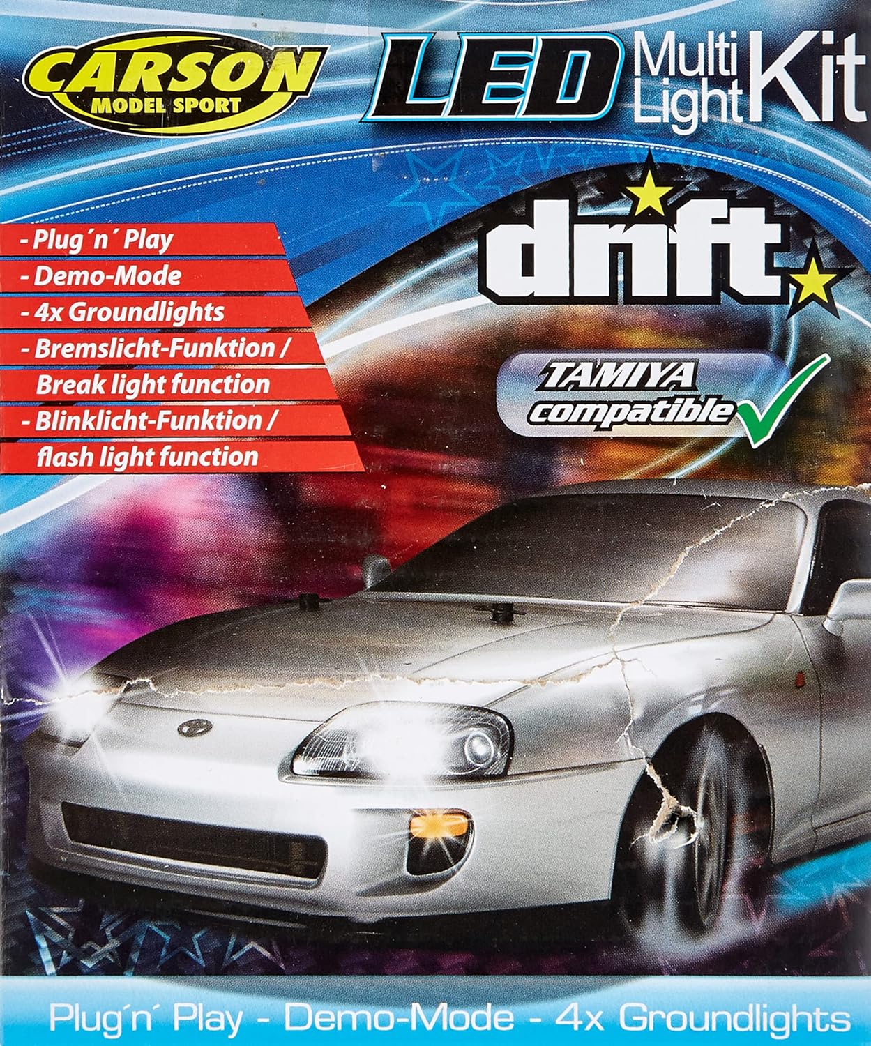 Dimensioni imballo articolo (L x P x A) in pollici: 4,8 x 4,02 x 2,44 Molte funzioni sono implementate dall'unità di controllo e controllano i 10 LED in totale e le 4 funi luminose sotto il veicolo. È possibile simulare le seguenti funzioni: Indicatori di direzione anteriori sinistro/destro 3 mm - Indicatori di direzione posteriori sinistro/destro 3 mm - Luci anteriori sinistro/destro 5 mm (4 volte) - Luci posteriori/stop sinistro/destro 5 mm - Luci blu bilanciere sinistra/destra e anteriore/posteriore - Luci di posizione anteriori/posteriori 5 mm (4 volte). (4x) - Modalità demo Età consigliata dal produttore: 14 anni e oltre