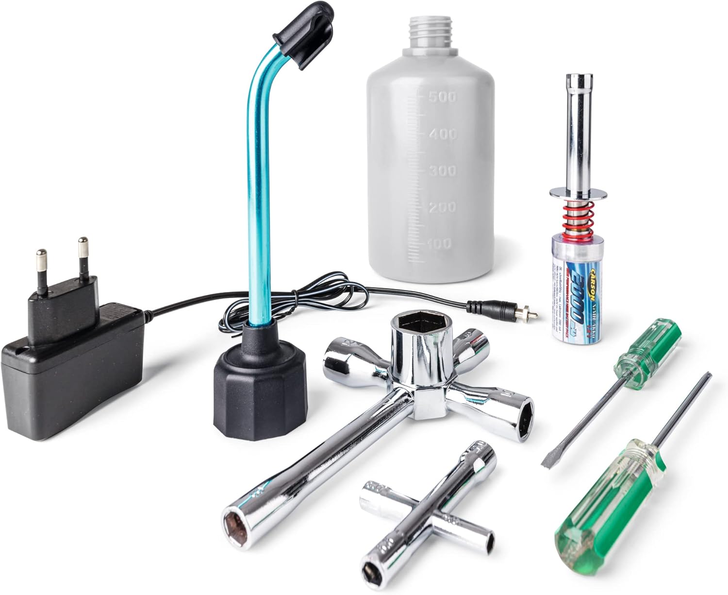 Accessori per tutti i veicoli a combustione RC - Il Nitro Starter Set è uno starter kit completo e di base per il tuo modello di auto. Il kit è compatibile con tutti i veicoli a combustione presenti sul mercato. Contenuto - Il Nitro Starter Kit contiene un accenditore per candelette ricaricabile, una bottiglia di carburante vuota (500 ml), una chiave regolabile grande e una piccola, nonché due piccoli cacciaviti che ti aiuteranno ad avviare e mantenere il tuo Nitro Truck. Qualità originale Carson - In qualità di specialista in veicoli telecomandati, Carson è da 25 anni garante di qualità eccezionale, massima sicurezza del prodotto e, naturalmente, tanto divertimento di guida!
