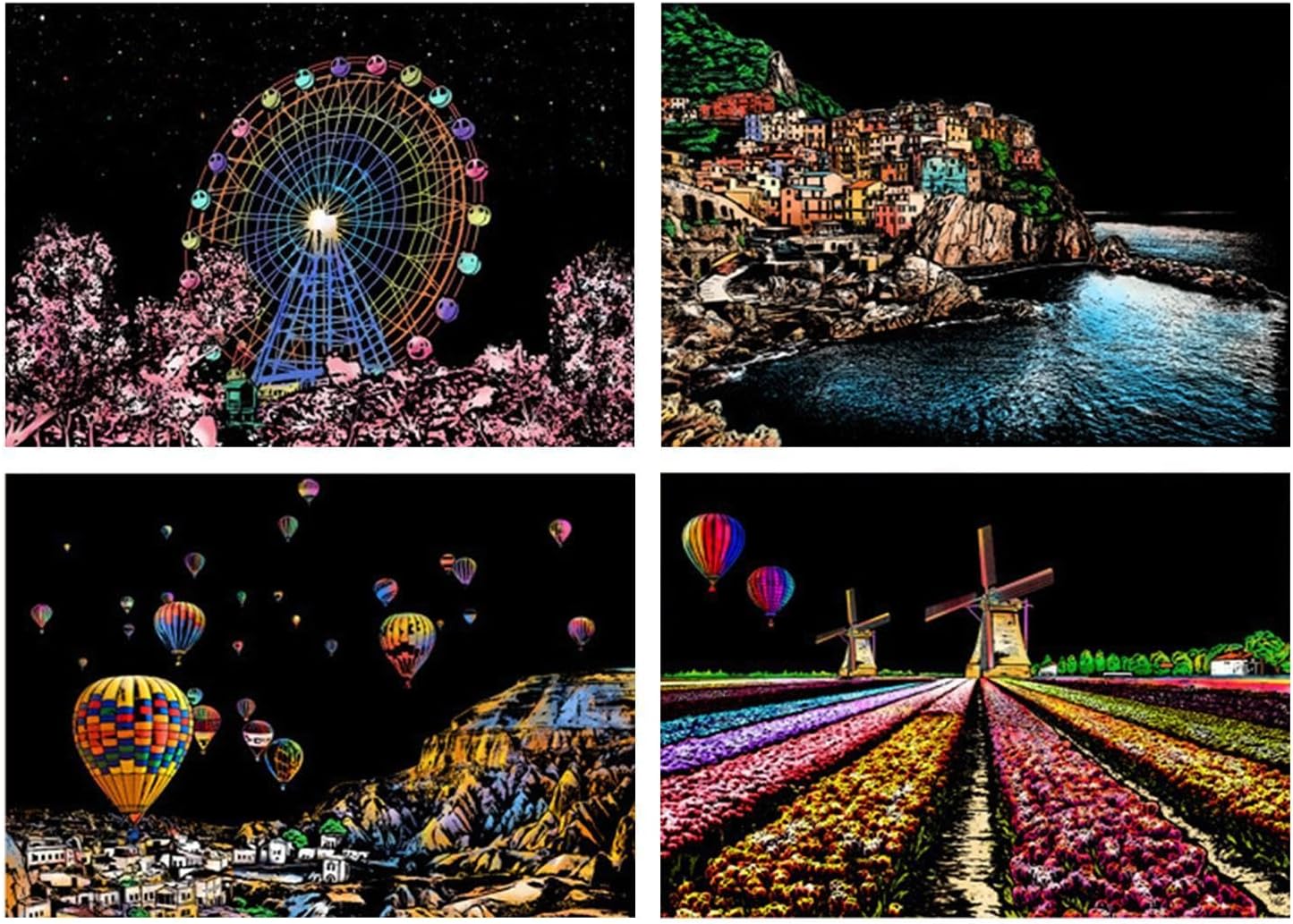 Design accattivante: con 4 fogli di carta da grattare in formato A4 per kit, che raffigurano splendide scene notturne della città, questo kit stimola la curiosità creativa, migliorando le capacità artistiche Facile da usare: con la sua finitura opaca che nasconde colori brillanti e motivi intricati, questo kit da grattare offre sbocco artistico entusiasmante. Usa la penna per rivelare il design invisibile e goditi la soddisfazione tattile di scolpire con le tue mani Porta gioia: progettato per bambini e adulti, questo kit di pittura da zero migliora le attività artigianali creative, garantendo a tutti di godersi il libero partecipando a attività didattiche e divertenti Comodo da trasportare: perfettamente dimensionato in formato A4, ideale per i viaggi o per un passaquotidiano, questo kit artistico da grattare consente sia ai bambini che agli adulti di esplorare il piacere di creare ovunque Accento domestico: trasforma il tuo spazio abitativo in una galleria d'arte con il nostro kit di pittura da zero. I capolavori finiti possono essere utilizzati come decorazioni domestiche, aggiungendo un sapore artistico