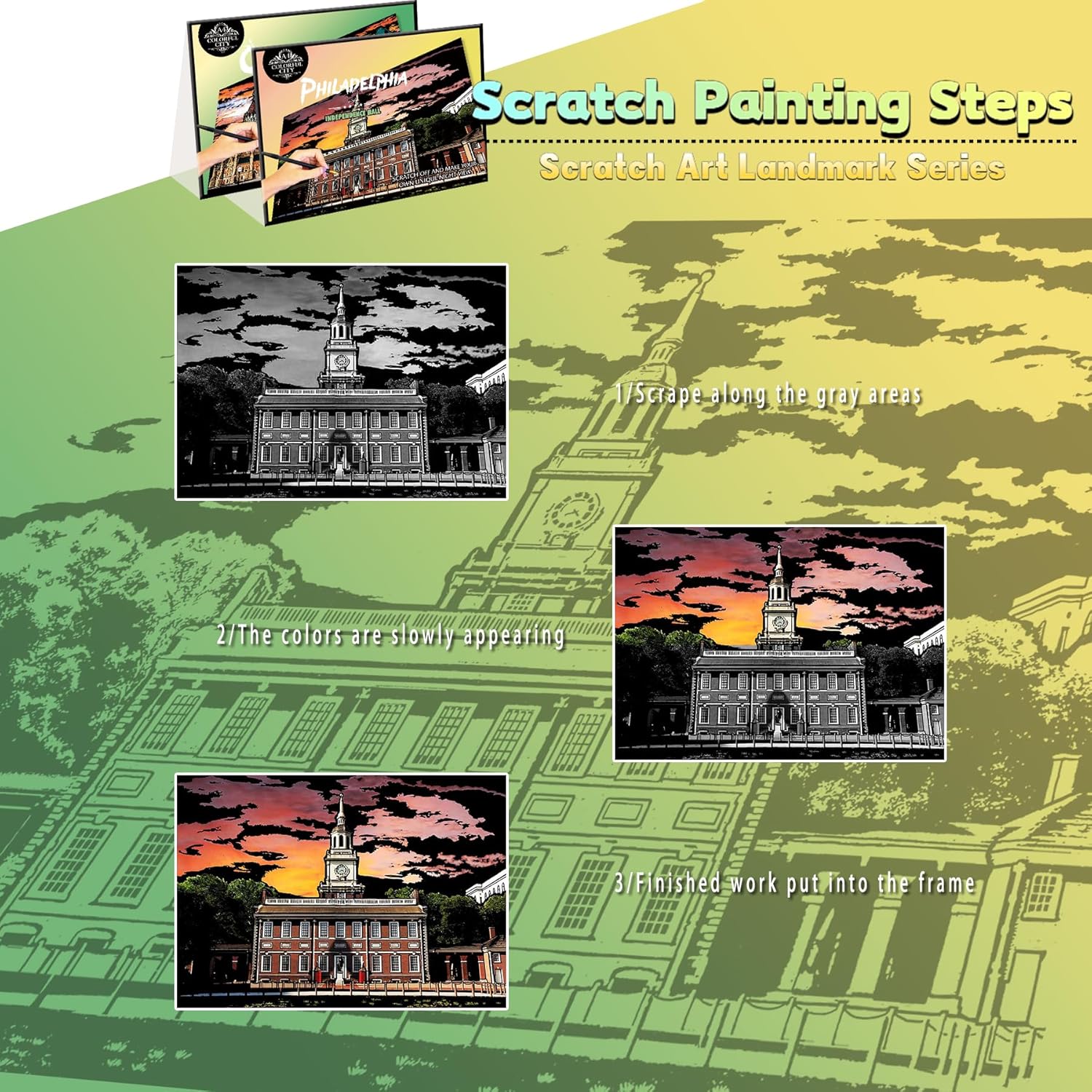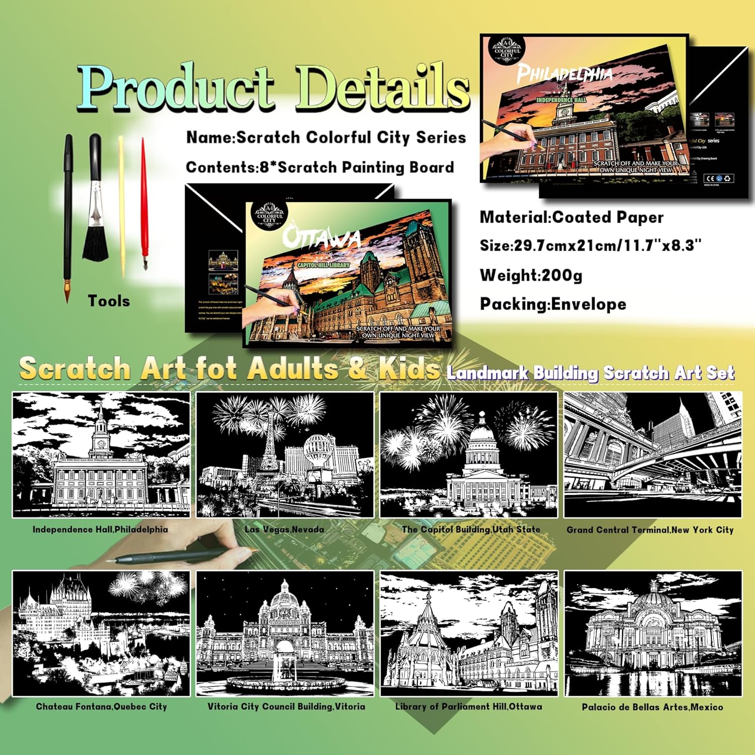 Set di carta per pittura artistica: i nostri dipinti artistici hanno superato CE e altre certificazioni di sicurezza internazionali e sono realizzati con materiali ecologici e atossici, garantendo che i bambini possano usarli in modo sicuro e senza preoccupazioni. I genitori possono rilassarsi completamente, godendo di interazioni genitore-figlio senza stress che coltivano i talenti artistici dei bambini attraverso l'esplorazione creativa. Pittura creativa per grattare: i colori vivaci emergono quando si graffia, non sono necessarie abilità di pittura precedente! L'opera d'arte finita può essere incorniciata per elevare istantaneamente l'arredamento della tua stanza. Avvicinare genitori e figli: la pittura collaborativa con i bambini coltiva la pazienza e la creatività rafforzando i legami familiari. Leggero e portatile, trasforma qualsiasi spazio, sia a casa che in viaggio, in uno studio d'arte, creando momenti commoventi di creatività condivisa. Rilassamento e soddisfazione di sé: il processo di graffio offre un'esperienza terapeutica: il suo tocco delicato aiuta ad alleviare lo stress, rendendolo ideale per rilassarsi dopo il lavoro o lo studio. Gli adulti possono anche abbracciarlo come una forma d'arte meditativa, trovando sia relax che senso di realizzazione. Il regalo creativo perfetto per i bambini: include: 8 tiragraffi, 1 pennino in legno, 1 piccolo raschietto rosso, 1 penna per gomma e 1 pennello nero. Questo set è un regalo premuroso per bambini, amici o amanti dell'arte, perfetto per compleanni o vacanze, mescolando sorpresa e praticità per creare una celebrazione indimenticabile e artistica.