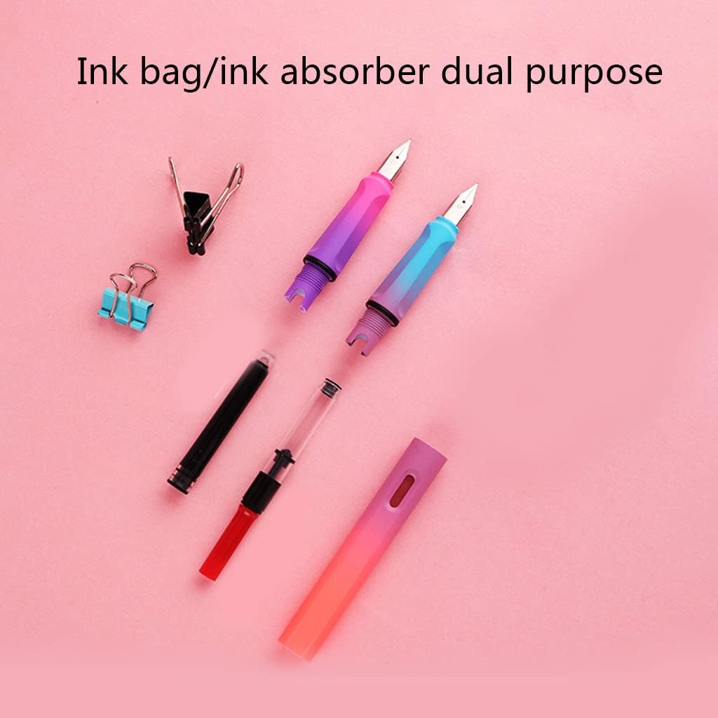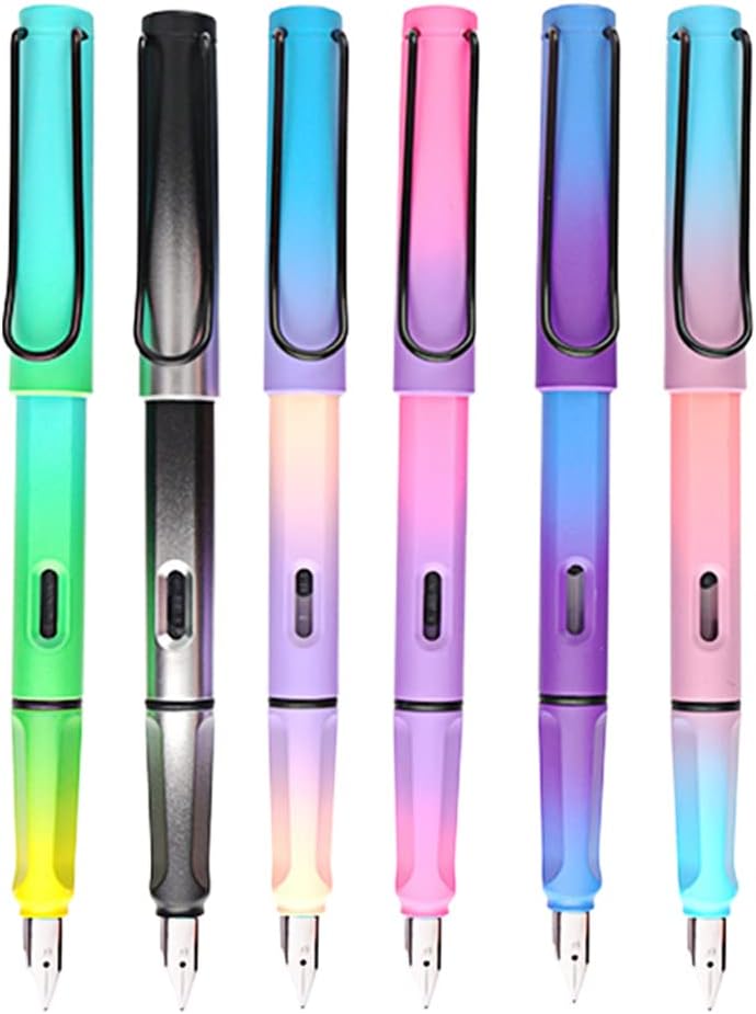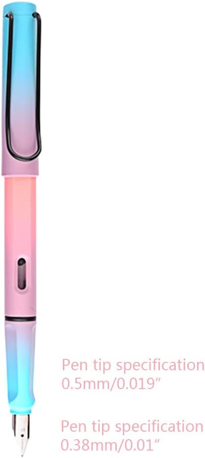 Piume e pizzi pregiati. Punta fine da 0,35 mm o punta da 0,5 mm, scegli in base alle tue esigenze. La robusta punta in metallo, l'impugnatura antiscivolo della penna, offre un controllo eccellente; in modo fluido e continuo. Il corpo della penna lungo e ben bilanciato ti consente di scrivere comodamente. Ideale per esercitarsi nella scrittura Gradiente, design unico del colore sfumato, alla moda e accattivante. 6 colori diversi tra cui scegliere. Molto adatto per praticare la calligrafia, scrivere lettere/biglietti di auguri, praticare i caratteri cinesi. Regalo eccellente. Meraviglioso per studenti e bambini che vogliono praticare la calligrafia cinese. Per ragazze, ragazzi, adolescenti, donne, uomini, principianti, scrittori, pittori, artisti, insegnanti a Natale, Capodanno, Ringraziamento, compleanno, anniversario, penna stilografica per la festa dei bambini con design a pistone. Questa penna stilografica con riempimento a pistone ha una presa comoda, scrive in modo fluido, leggera ed è ideale per studenti, bambini, adulti e principianti che praticano affari. Il design della finestra visibile ti consente di vedere più facilmente quanto rimane. Cartuccia rimovibile, facile da riempire. Presenta una robusta clip per penna in metallo e un assorbitore rimovibile. Questa penna stilografica a pistone può essere facilmente ricaricata ruotando la manopola per estendere il pistone. Immergere la molla, quindi avvitare la manopola per ritrarre lo stantuffo ed estrarlo direttamente dal flacone nella penna