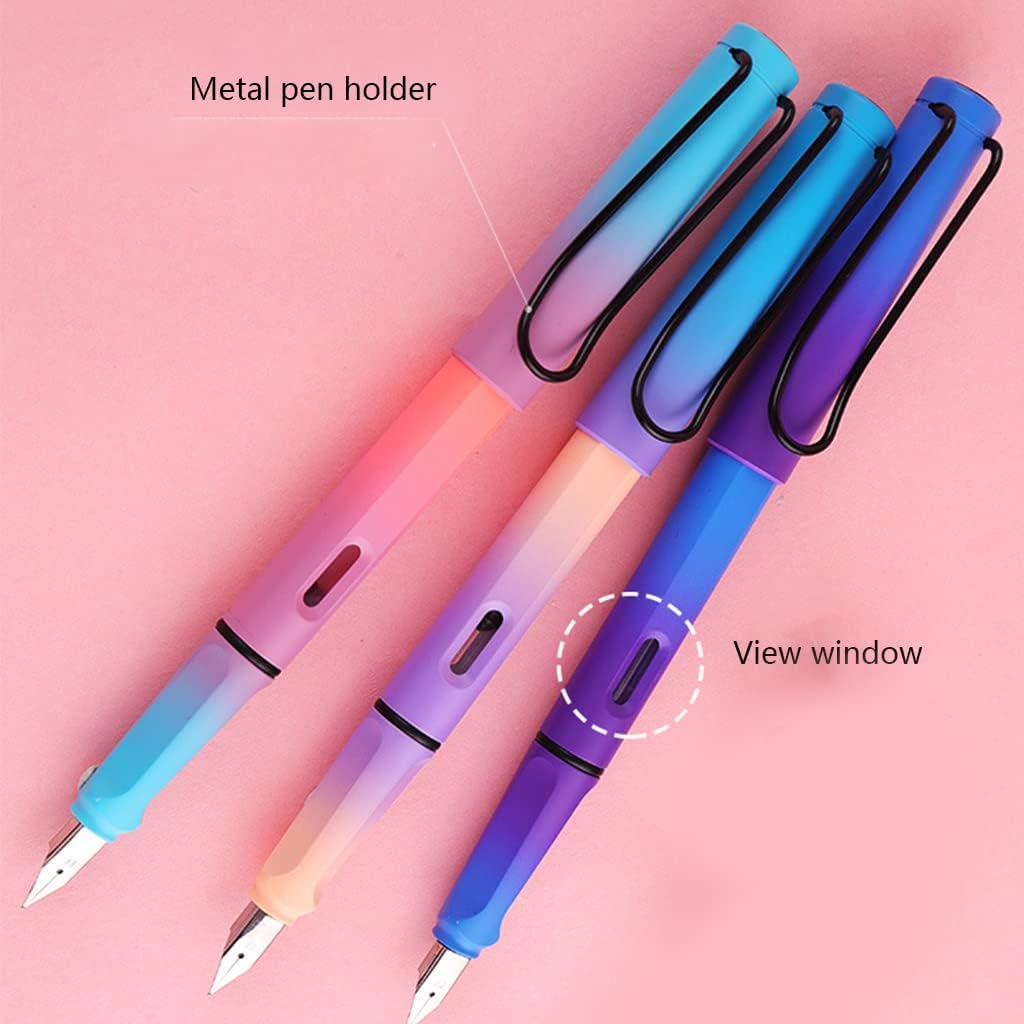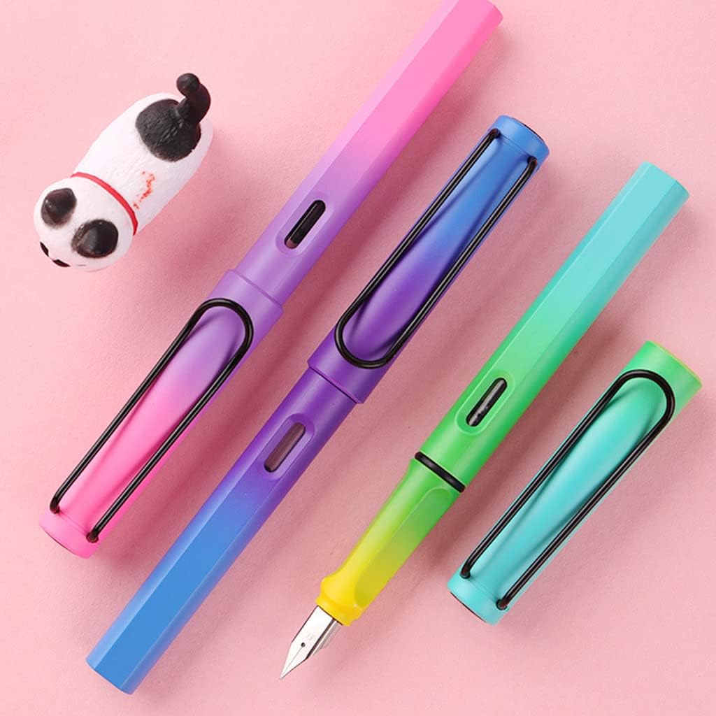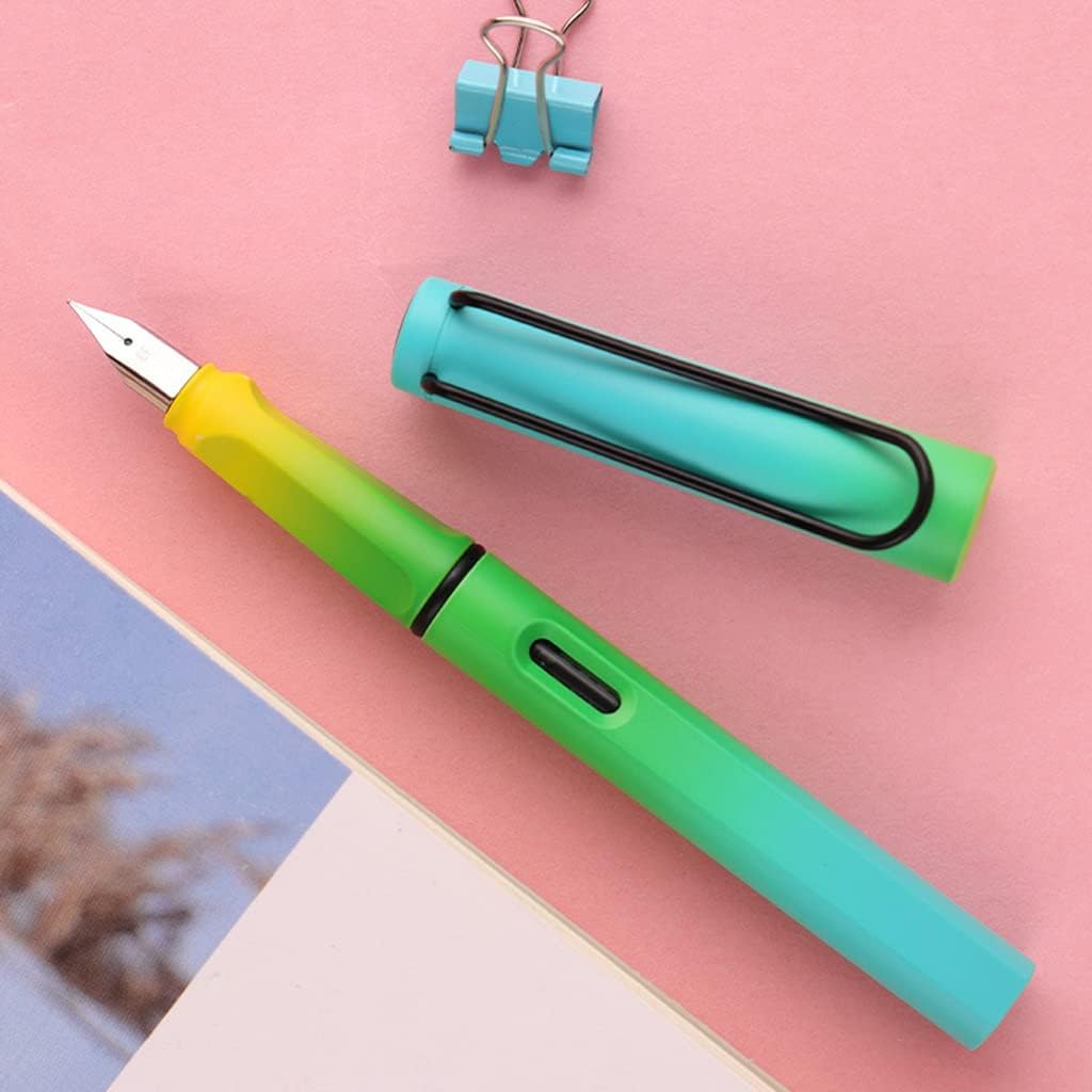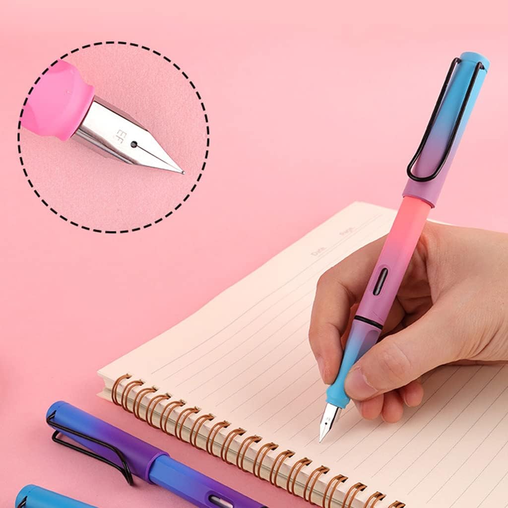 Piume e pizzi pregiati. Punta fine da 0,35 mm o punta da 0,5 mm, scegli in base alle tue esigenze. La robusta punta in metallo, l'impugnatura antiscivolo della penna, offre un controllo eccellente; in modo fluido e continuo. Il corpo della penna lungo e ben bilanciato ti consente di scrivere comodamente. Ideale per esercitarsi nella scrittura Gradiente, design unico del colore sfumato, alla moda e accattivante. 6 colori diversi tra cui scegliere. Molto adatto per praticare la calligrafia, scrivere lettere/biglietti di auguri, praticare i caratteri cinesi. Regalo eccellente. Meraviglioso per studenti e bambini che vogliono praticare la calligrafia cinese. Per ragazze, ragazzi, adolescenti, donne, uomini, principianti, scrittori, pittori, artisti, insegnanti a Natale, Capodanno, Ringraziamento, compleanno, anniversario, penna stilografica per la festa dei bambini con design a pistone. Questa penna stilografica con riempimento a pistone ha una presa comoda, scrive in modo fluido, leggera ed è ideale per studenti, bambini, adulti e principianti che praticano affari. Il design della finestra visibile ti consente di vedere più facilmente quanto rimane. Cartuccia rimovibile, facile da riempire. Presenta una robusta clip per penna in metallo e un assorbitore rimovibile. Questa penna stilografica a pistone può essere facilmente ricaricata ruotando la manopola per estendere il pistone. Immergere la molla, quindi avvitare la manopola per ritrarre lo stantuffo ed estrarlo direttamente dal flacone nella penna