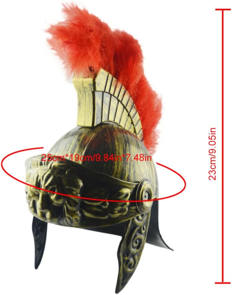 Il casco ha una mezza visiera parasole pieghevole. L'aspetto ricorda casco Gladiatore dell'epoca romana. Con la visiera parasole pieghevole, il casco può essere posizionato comodamente, rendendolo adatto sia per uomini che per donne. Con questo casco attirerete sicuramente l'attenzione dalla vostra prossima festa a tema, carnevale o festa in costume. Dimensioni del casco: circonferenza interna 25*19cm, altezza 23cm, adatto per essere indossato oltre 14anni. Le piume artificiali sono puramente naturali e devono essere introdotte negli accessori del cappello. La parte superiore del cappello e la testa rotonda possono essere separati. Pratico, pratico e versatile. Il casco romano in plastica + piume naturali e artificiali con pettine rosso sul casco è l'aggiunta perfetta ai tuoi vestiti romani.